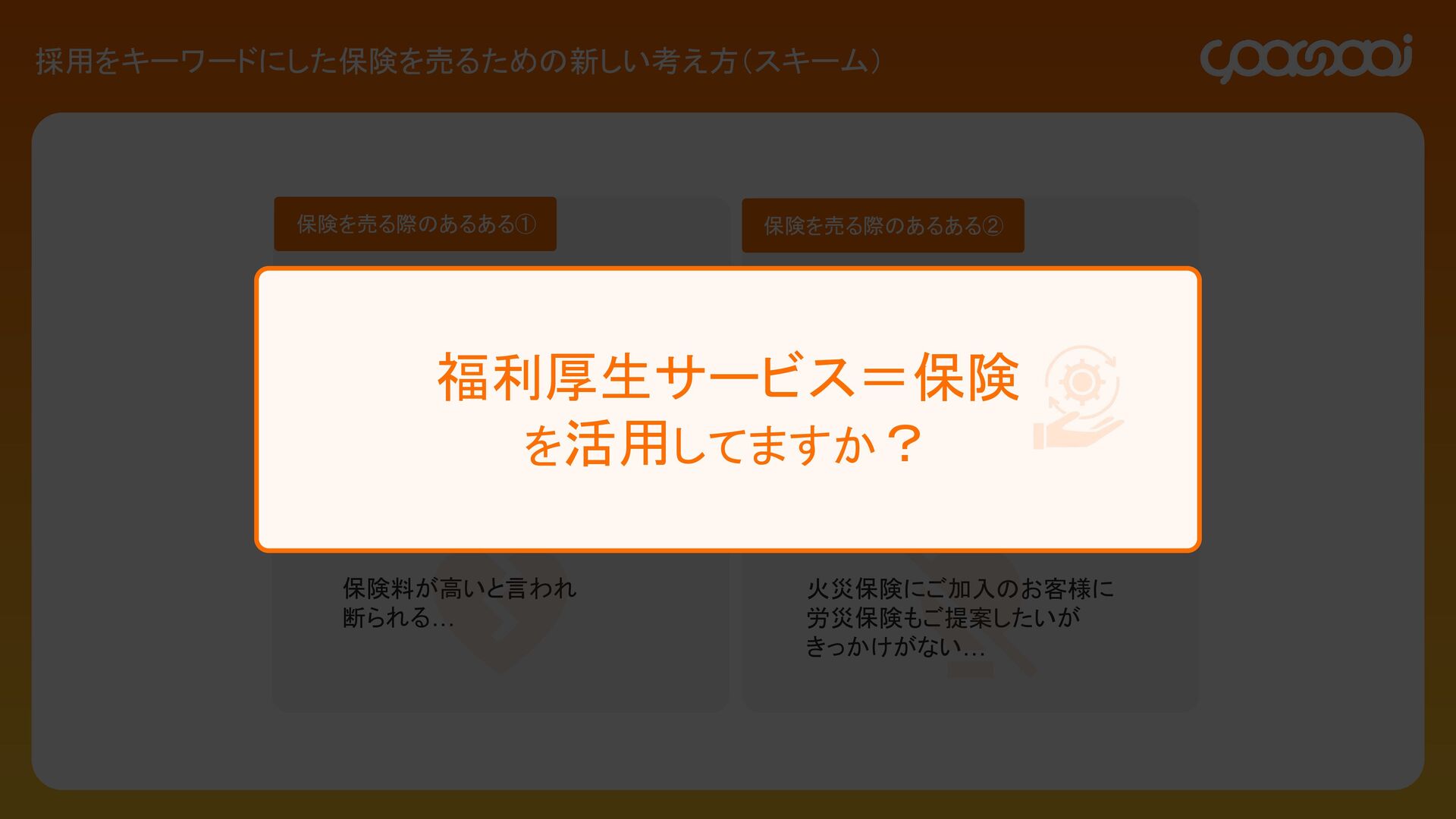 保険を売る際のあるある① 新規のお客様に提案しても 響かない… すでに他社で保険に 加入しており提案ができない… 保険料が高いと言われ 断られる… 火災保険にご加入のお客様に 労災保険もご提案したいが きっかけがない…