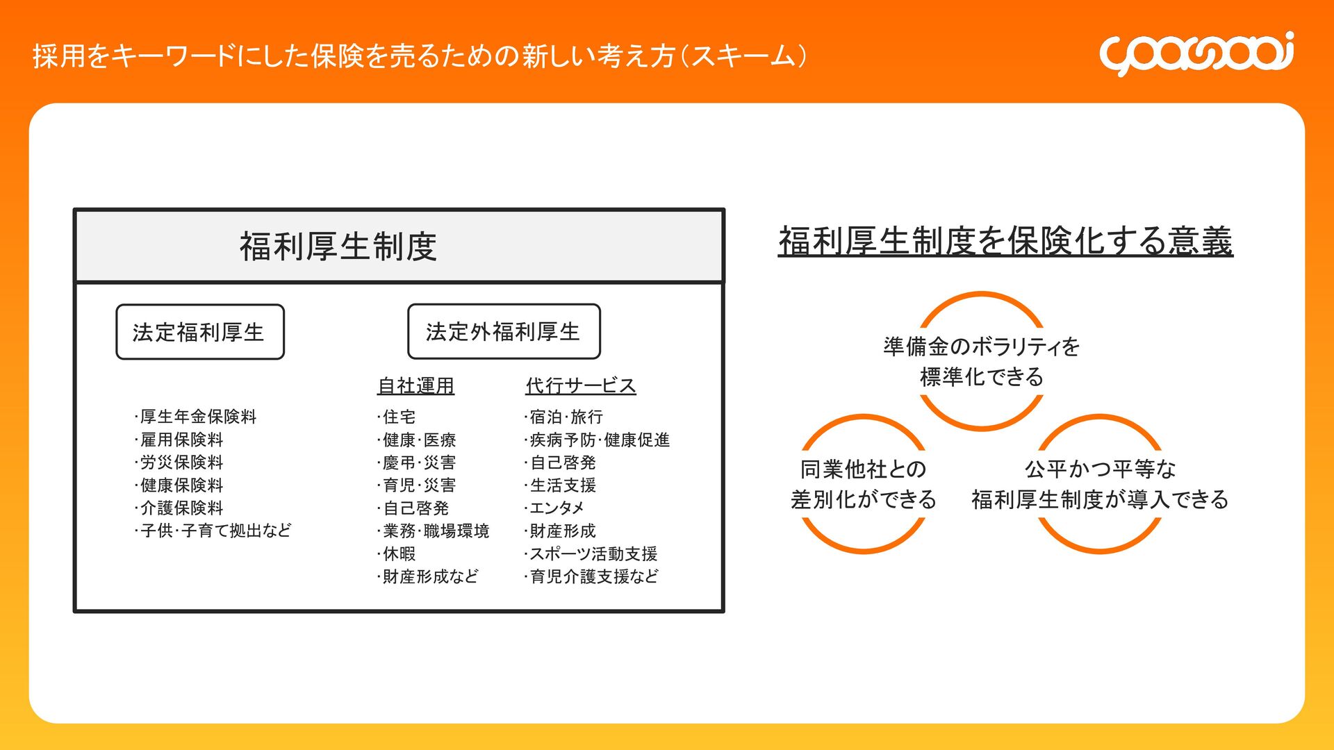 ・子供・子育て拠出など ・宿泊・旅行 ・疾病予防・健康促進 ・自己啓発 ・生活支援 ・エンタメ ・財産形成 ・スポーツ活動支援 ・育児介護支援など ・住宅 ・健康・医療 ・慶弔・災害 ・育児・災害 ・自己啓発 ・業務・職場環境 ・休暇 ・財産形成など 福利厚生制度を保険化する意義 準備金のボラリティを 標準化できる 同業他社との 差別化ができる 公平かつ平等な 福利厚生制度が導入できる 採用をキーワードにした保険を売るための新しい考え方(スキーム)