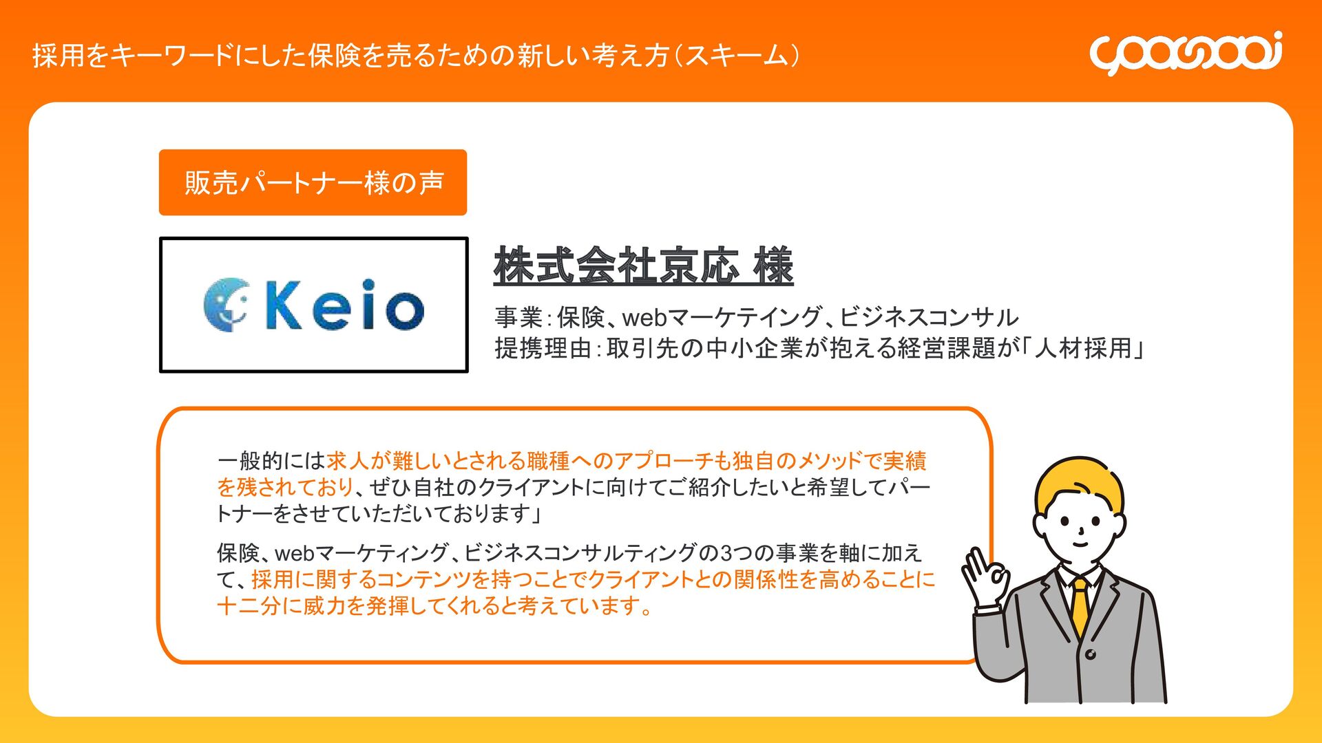 株式会社京応 様 提携理由:取引先の中小企業が抱える経営課題が「人材採用」 販売パートナー様の声 事業:保険、webマーケテイング、ビジネスコンサル 一般的には求人が難しいとされる職種へのアプローチも独自のメソッドで実績 を残されており、ぜひ自社のクライアントに向けてご紹介したいと希望してパー トナーをさせていただいております」 保険、webマーケティング、ビジネスコンサルティングの3つの事業を軸に加え て、採用に関するコンテンツを持つことでクライアントとの関係性を高めることに