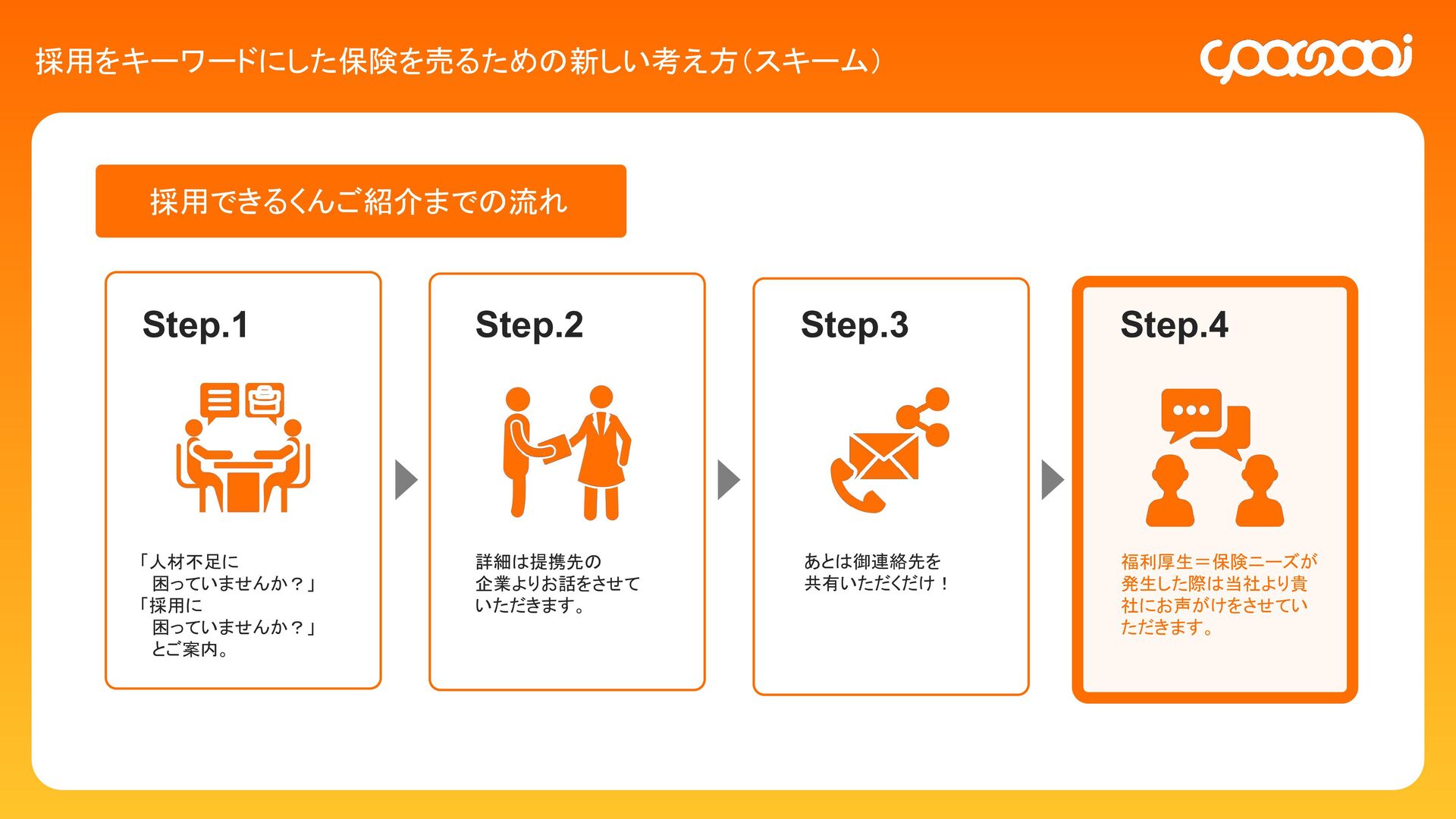 Step.2 あとは御連絡先を 共有いただくだけ! Step.3 福利厚生=保険ニーズが 発生した際は当社より貴 社にお声がけをさせてい ただきます。 Step.4 採用をキーワードにした保険を売るための新しい考え方(スキーム)