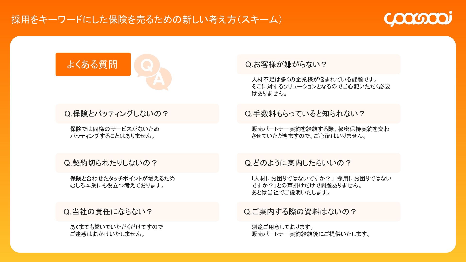 保険と合わせたタッチポイントが増えるため むしろ本業にも役立つ考えております。 あくまでも繋いでいただくだけですので ご迷惑はおかけいたしません。 人材不足は多くの企業様が悩まれている課題です。 そこに対するソリューションとなるのでご心配いただく必要 はありません。 販売パートナー契約を締結する際、秘密保持契約を交わ させていただきますので、ご心配はいりません。 「人材にお困りではないですか?」「採用にお困りではない ですか?」との声掛けだけで問題ありません。 あとは当社でご説明いたします。 別途ご用意しております。 販売パートナー契約締結後にご提供いたします。 採用をキーワードにした保険を売るための新しい考え方(スキーム)