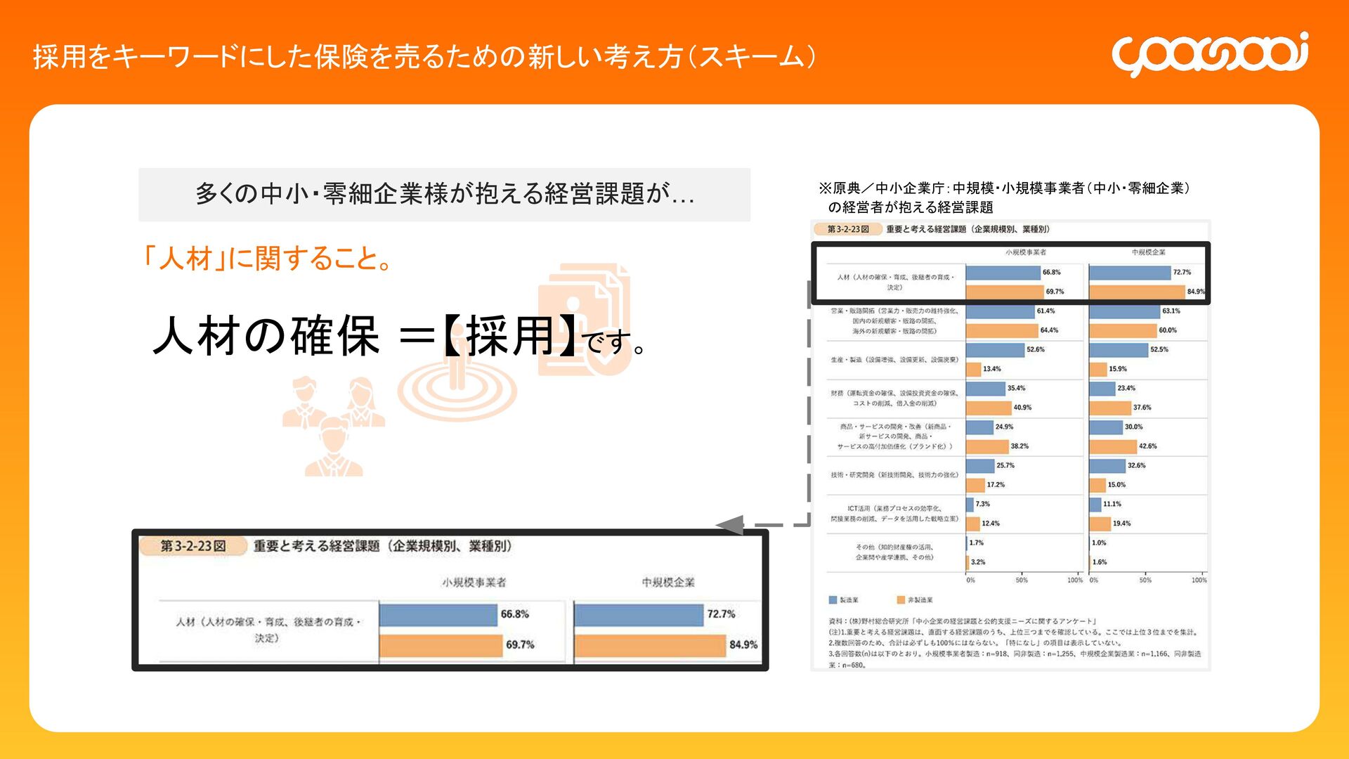 「人材」に関すること。 人材の確保 =【採用】です。 多くの中小・零細企業様が抱える経営課題が… 採用をキーワードにした保険を売るための新しい考え方(スキーム) ※原典/中小企業庁:中規模・小規模事業者(中小・零細企業) の経営者が抱える経営課題