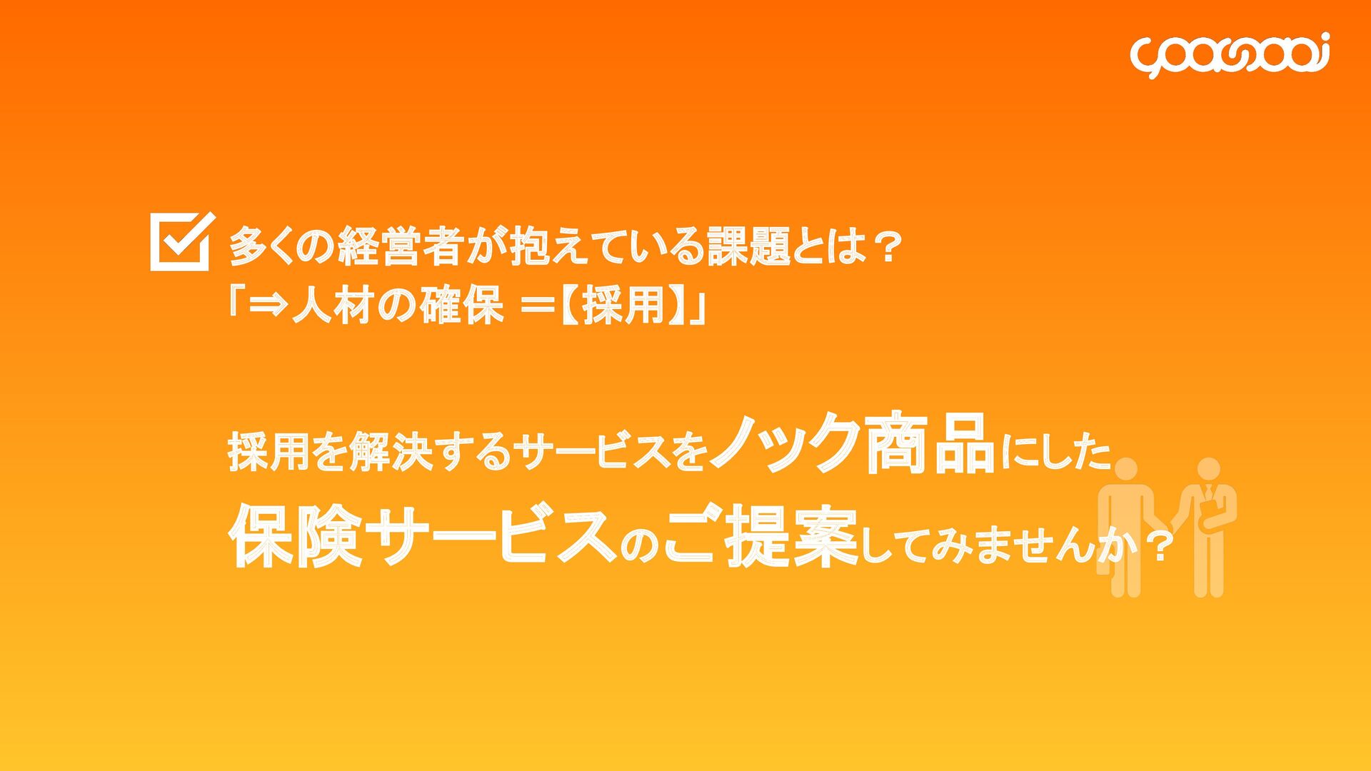 多くの経営者が抱えている課題とは? 「⇒人材の確保 =【採用】」 採用を解決するサービスをノック商品にした 保険サービスのご提案してみませんか?