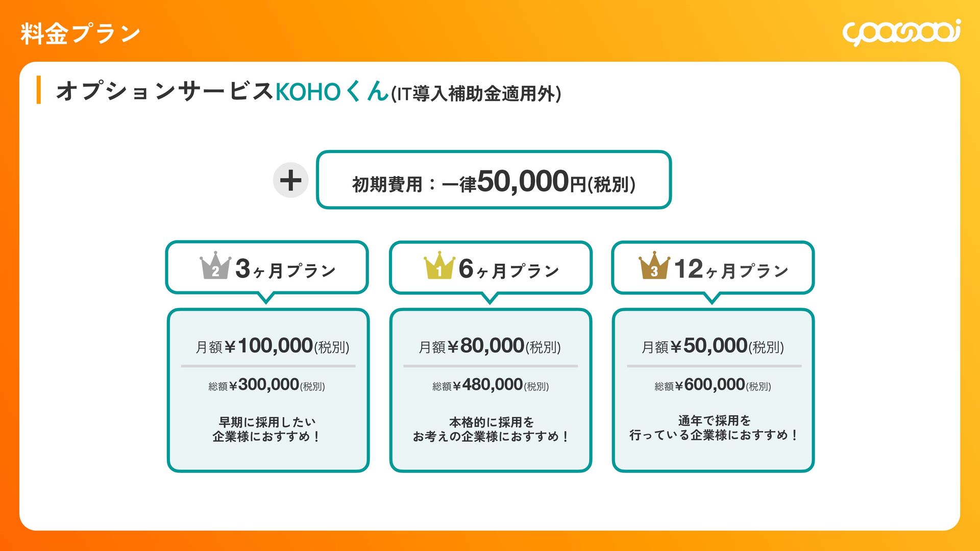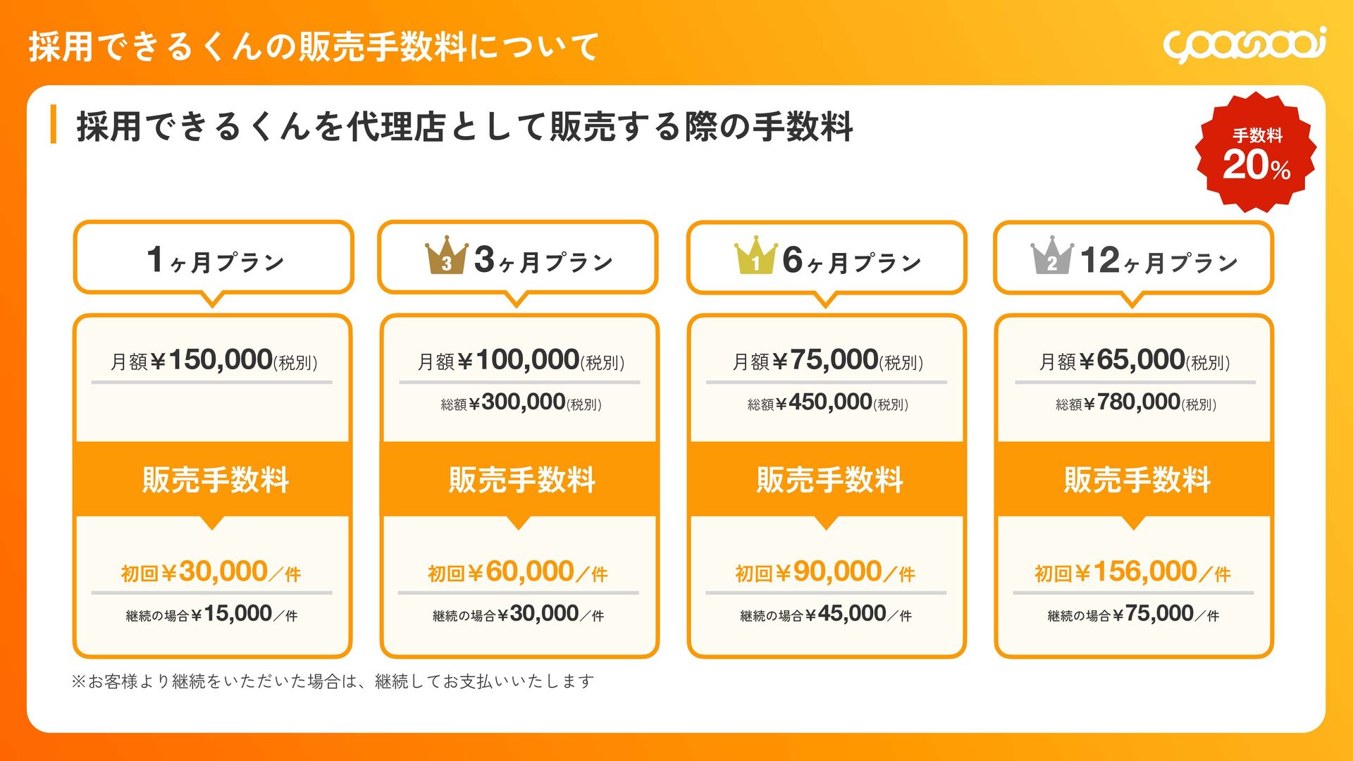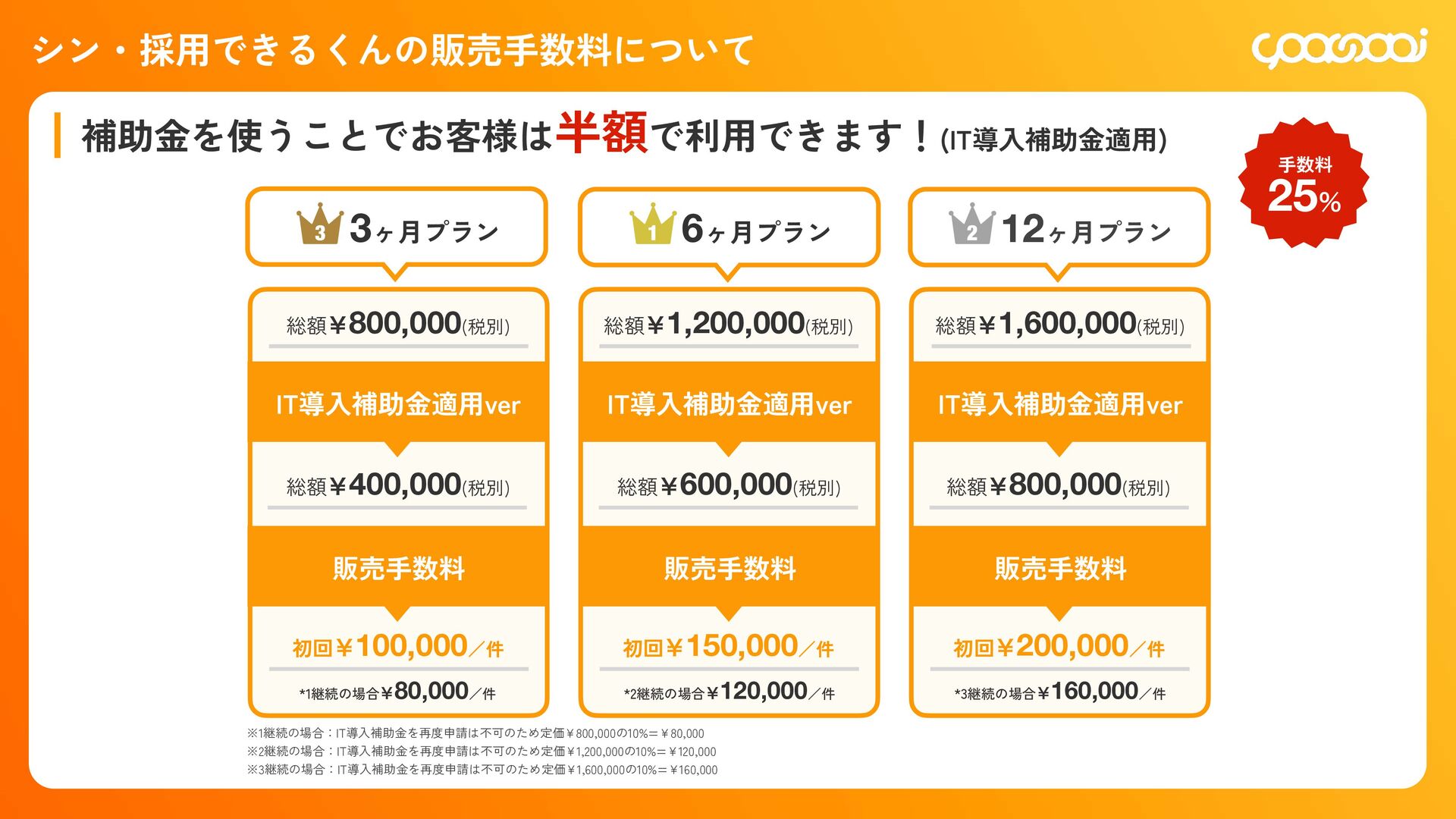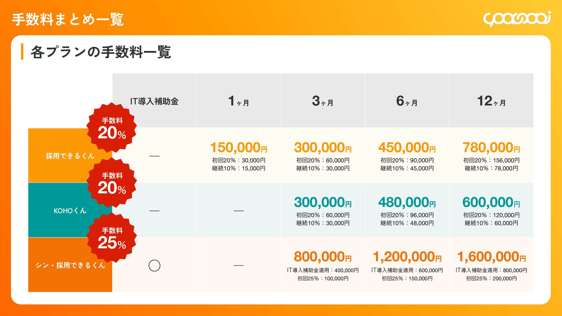 継続10ˋ:15,000円 300,000円 初回20ˋ:60,000円 継続10ˋ:30,000ԁ 450,000円 初回20ˋ:90,000円 継続10ˋ:45,000円 780,000円 初回20ˋ:156,000円 継続10ˋ:78,000円 KOHOくん ー ー 300,000円 初回20ˋ:60,000円 継続10ˋ:30,000円 480,000円 初回20ˋ:96,000円 継続10ˋ:48,000円 600,000円 初回20ˋ:120,000円 継続10ˋ:60,000円 シン・採用できるくん ◯ ー 800,000円 IT導入補助金適用:400,000円 初回25ˋ:100,000円 1,200,000円 IT導入補助金適用:600,000円 初回25ˋ:150,000円 1,600,000円 IT導入補助金適用:800,000円 初回25ˋ:200,000円 各プランの手数料一覧 手数料 20ˋ 手数料 20ˋ 手数料 25ˋ