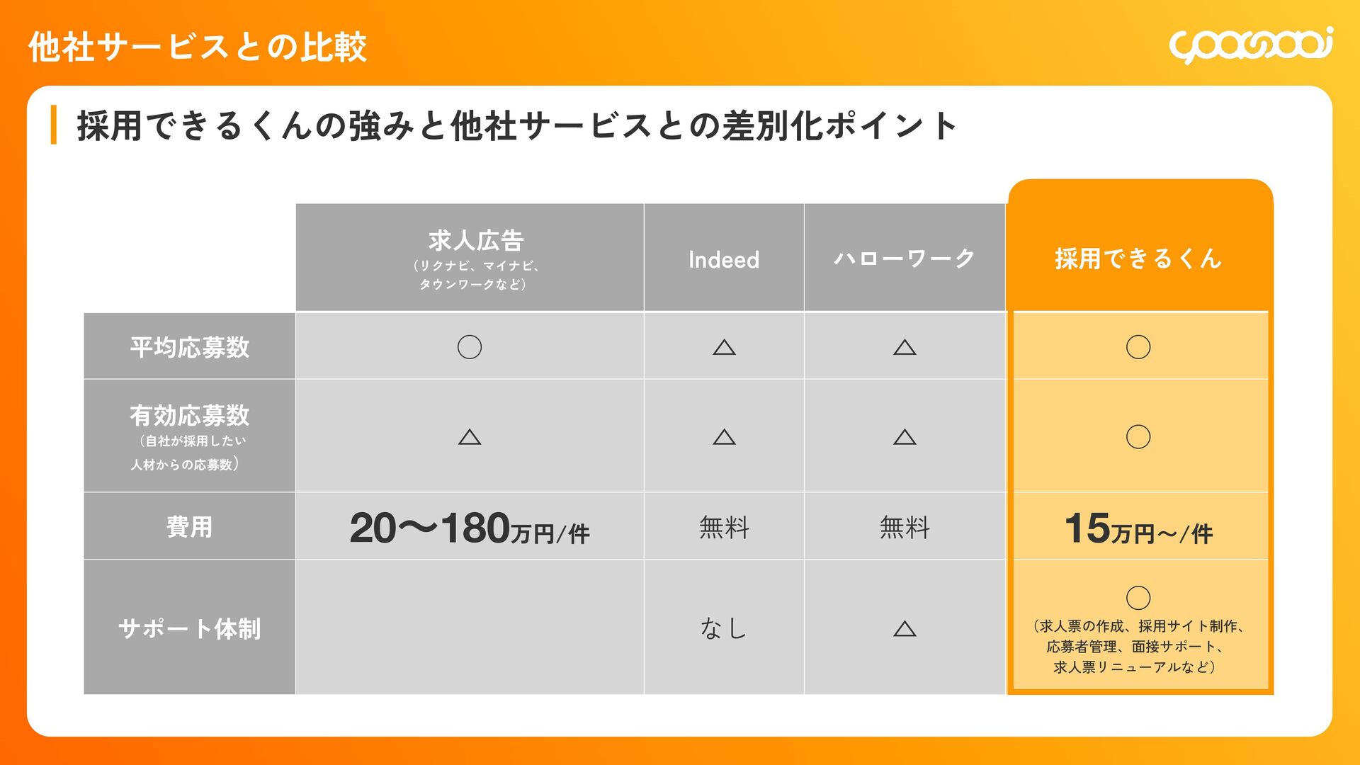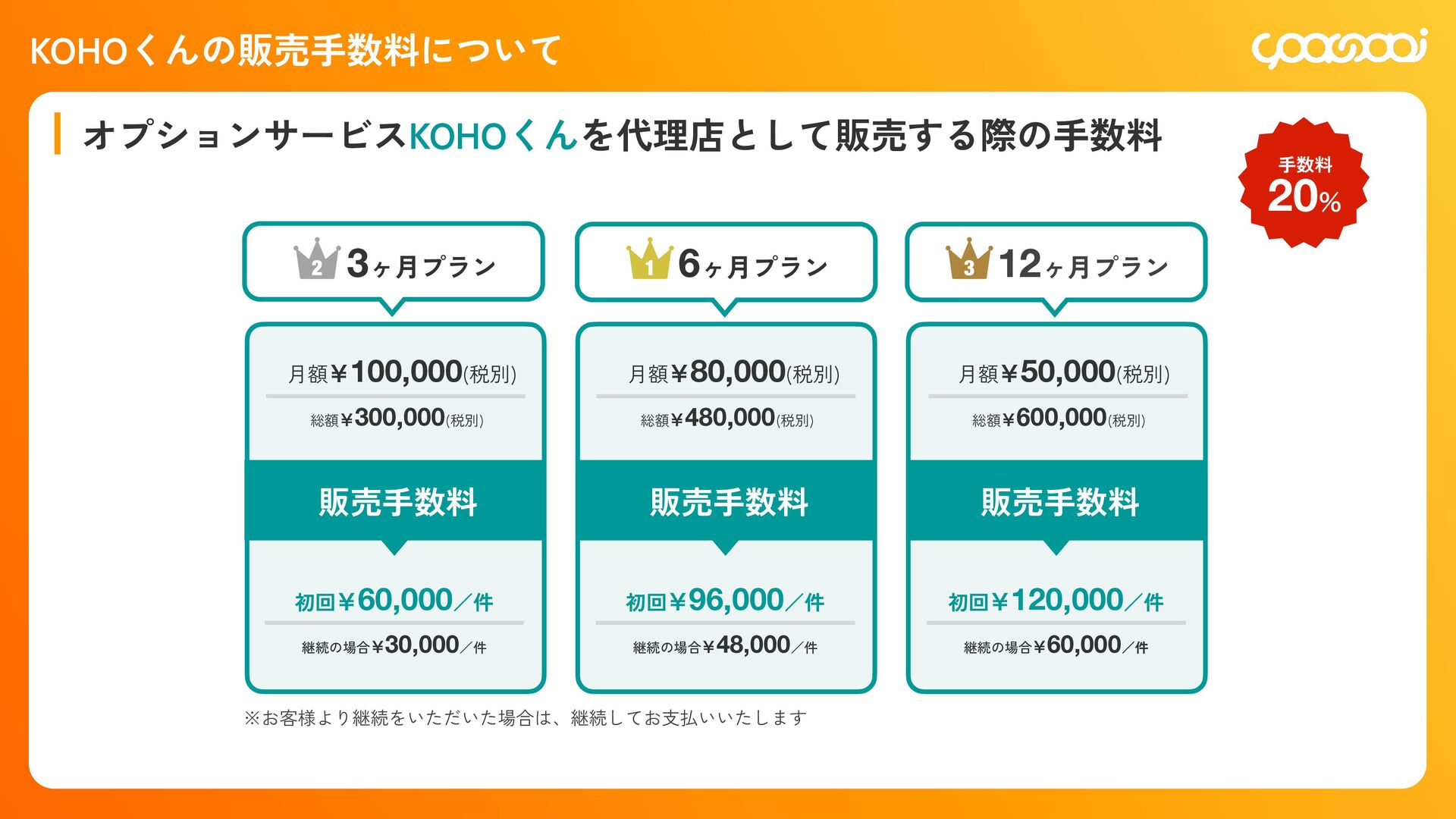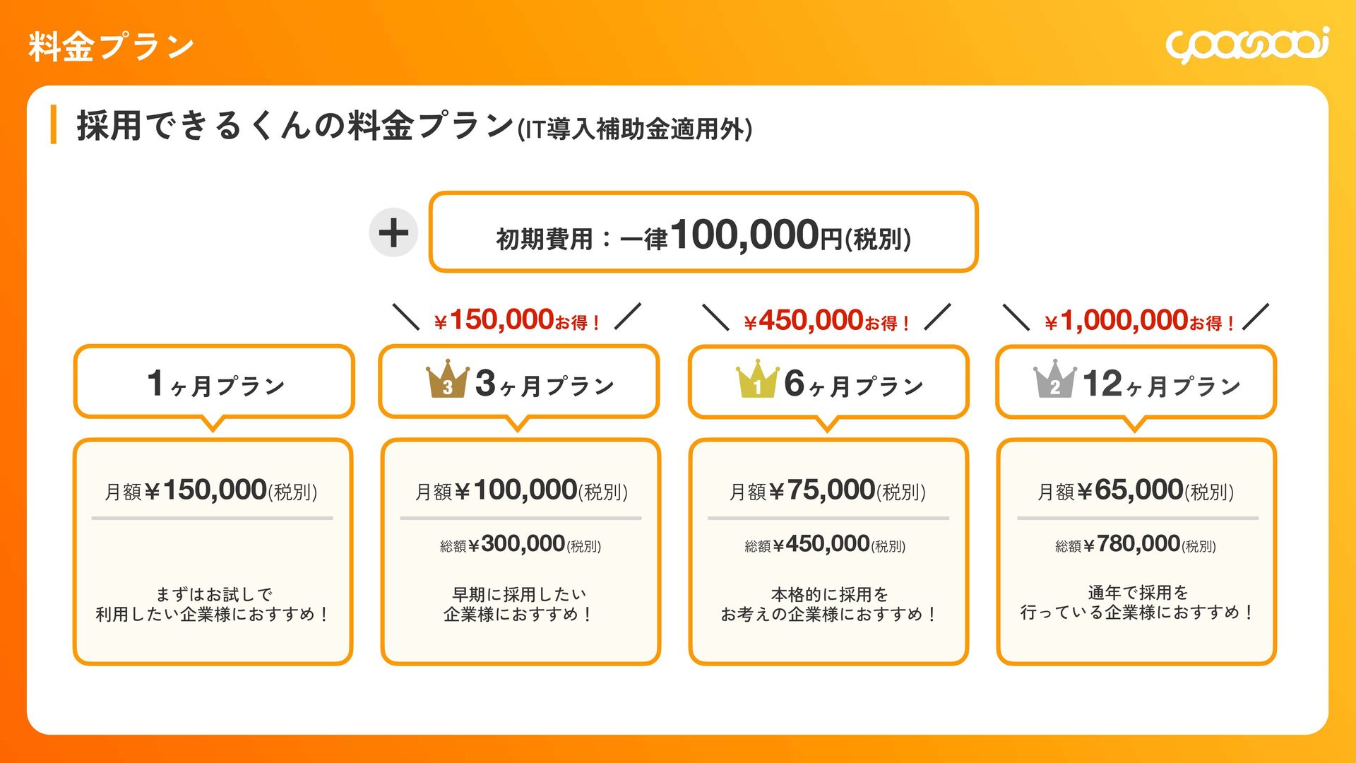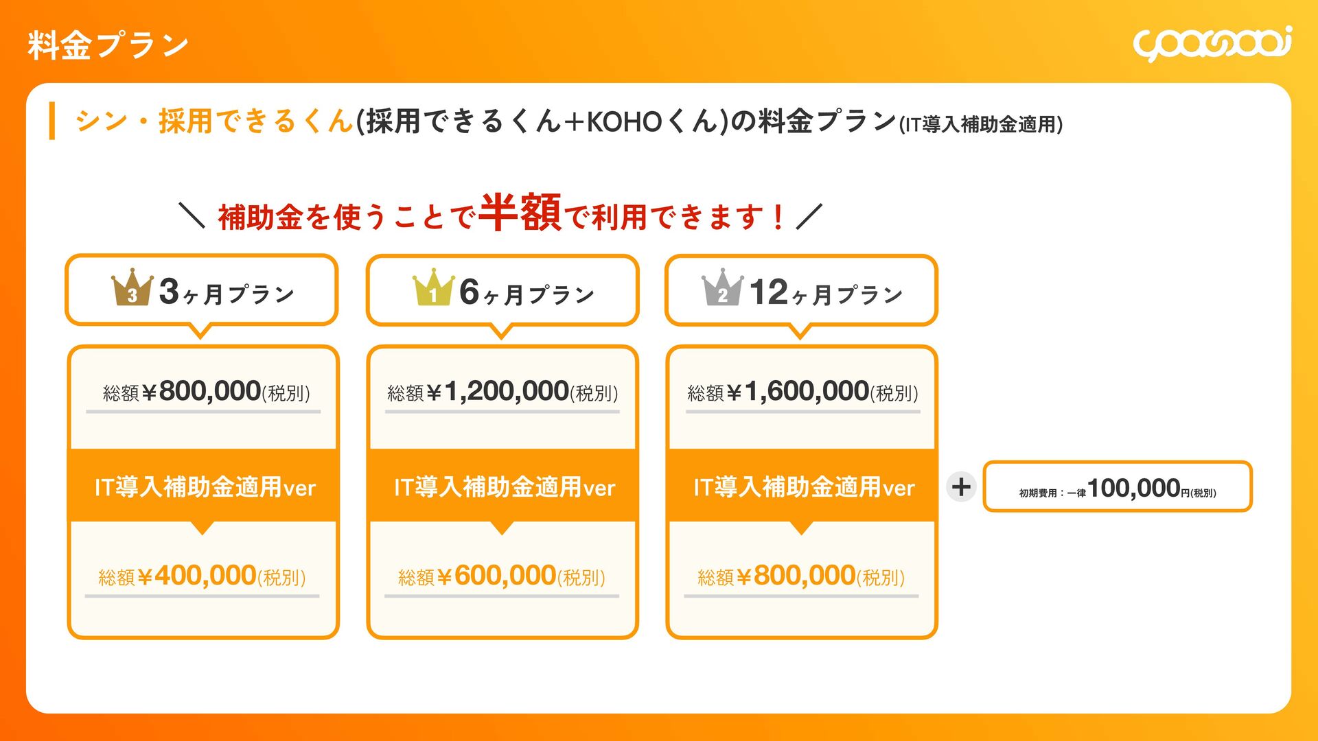 継続10ˋ:15,000円 300,000円 初回20ˋ:60,000円 継続10ˋ:30,000ԁ 450,000円 初回20ˋ:90,000円 継続10ˋ:45,000円 780,000円 初回20ˋ:156,000円 継続10ˋ:78,000円 KOHOくん ー ー 300,000円 初回20ˋ:60,000円 継続10ˋ:30,000円 480,000円 初回20ˋ:96,000円 継続10ˋ:48,000円 600,000円 初回20ˋ:120,000円 継続10ˋ:60,000円 シン・採用できるくん ◯ ー 800,000円 IT導入補助金適用:400,000円 初回25ˋ:100,000円 1,200,000円 IT導入補助金適用:600,000円 初回25ˋ:150,000円 1,600,000円 IT導入補助金適用:800,000円 初回25ˋ:200,000円 各プランの手数料一覧 手数料 20ˋ 手数料 20ˋ 手数料 25ˋ