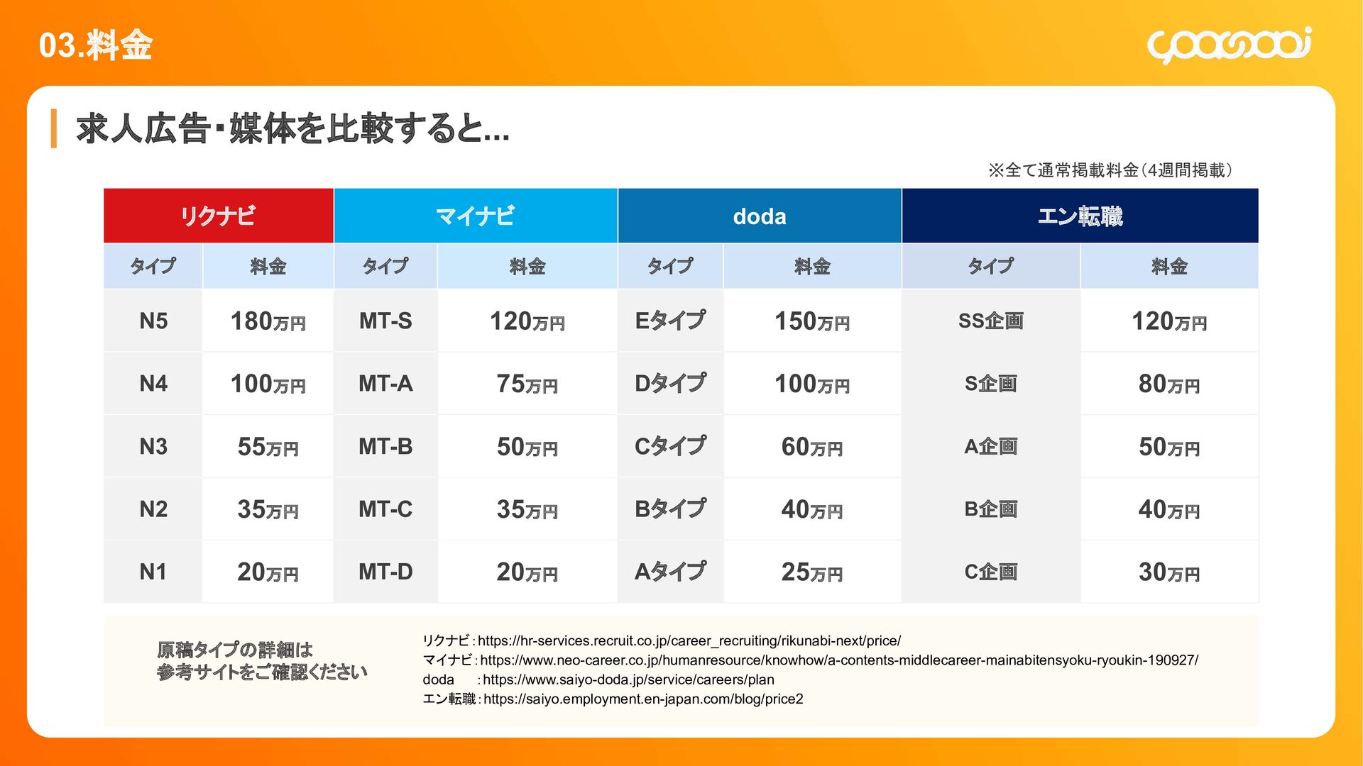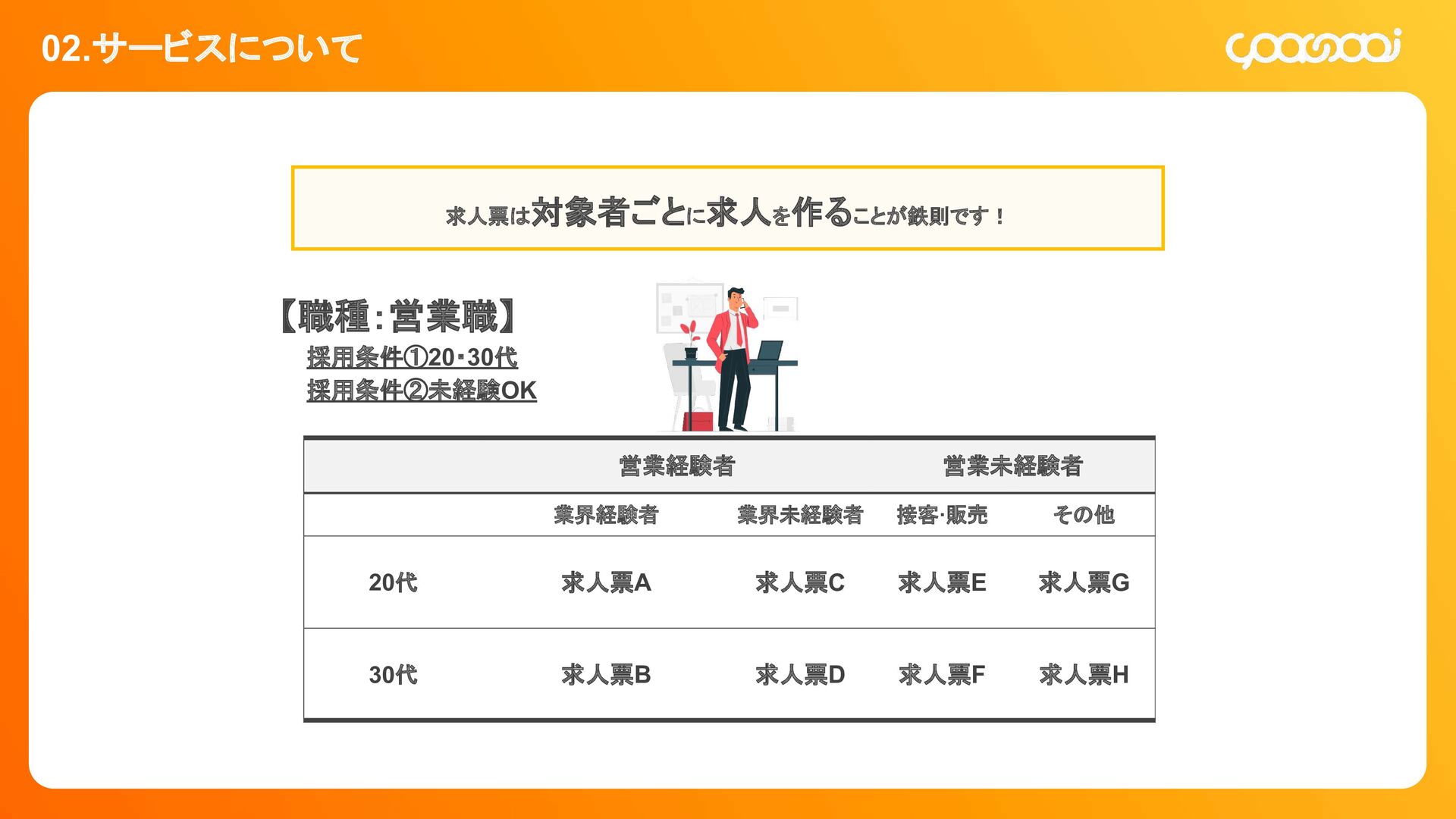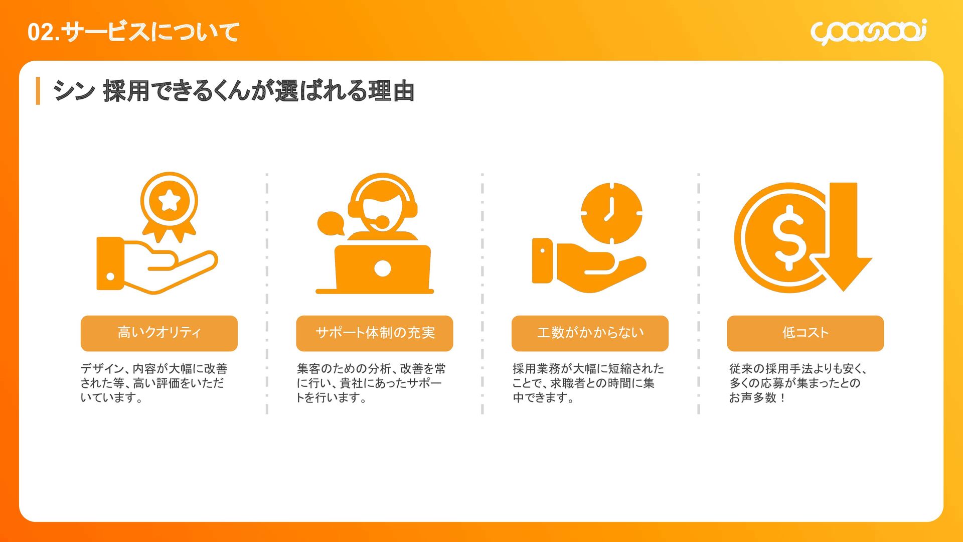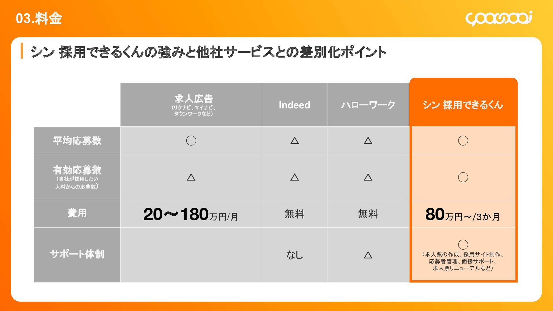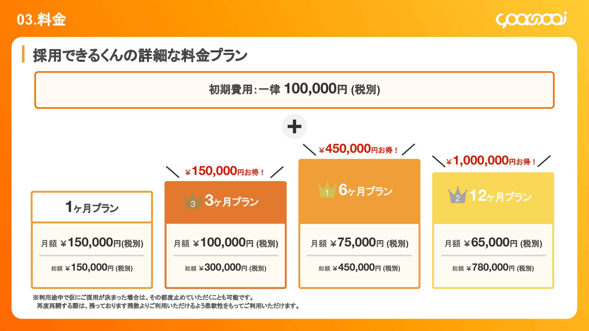 12ヶ月プラン ¥ 1,000,000円お得! 1 2 3 総額 ¥150,000円 (税別) 月額 ¥100,000円 (税別) 総額 ¥300,000円 (税別) 月額 ¥75,000円 (税別) 総額 ¥450,000円 (税別) 月額 ¥65,000円 (税別) 総額 ¥780,000円 (税別) 初期費用:一律 100,000円 (税別) ※利用途中で仮にご採用が決まった場合は、その都度止めていただくことも可能です。 再度再開する際は、残っております残数よりご利用いただけるよう柔軟性をもってご利用いただけます。 03.料金