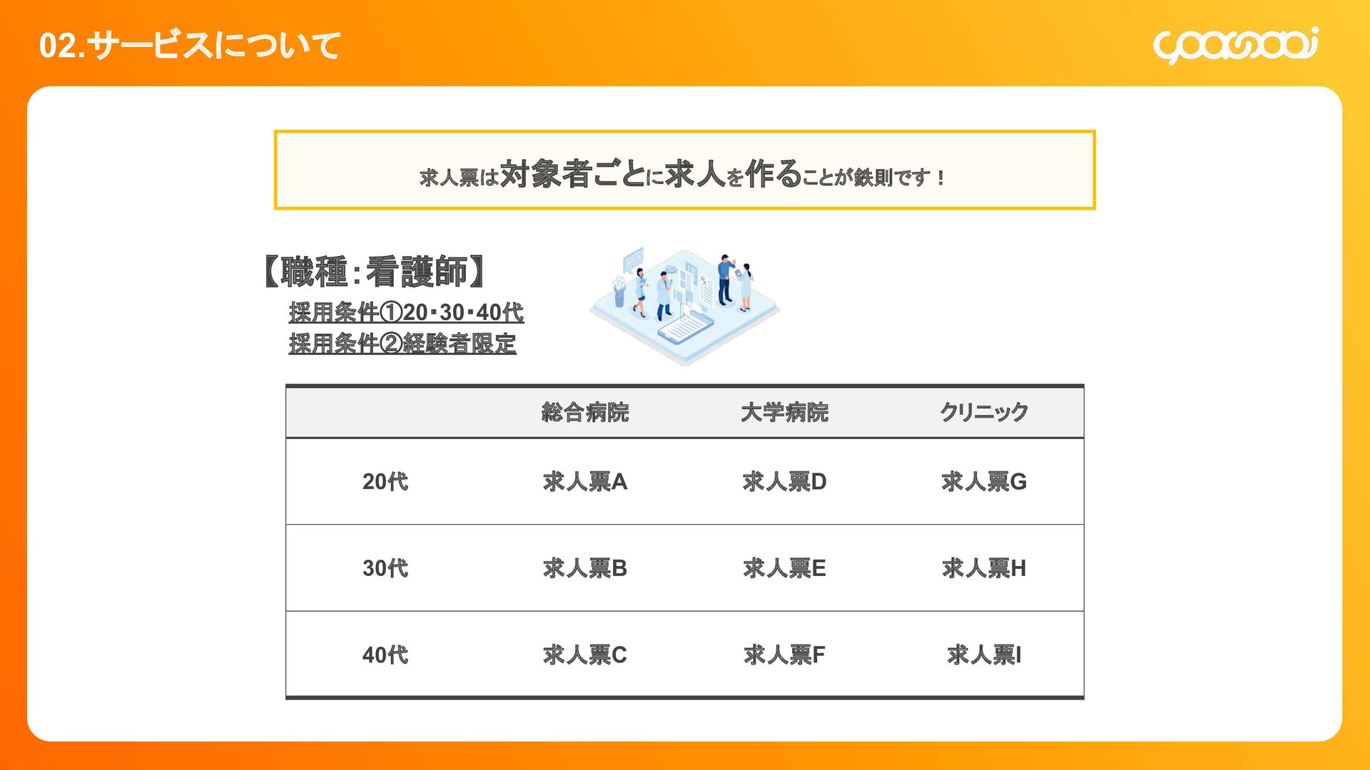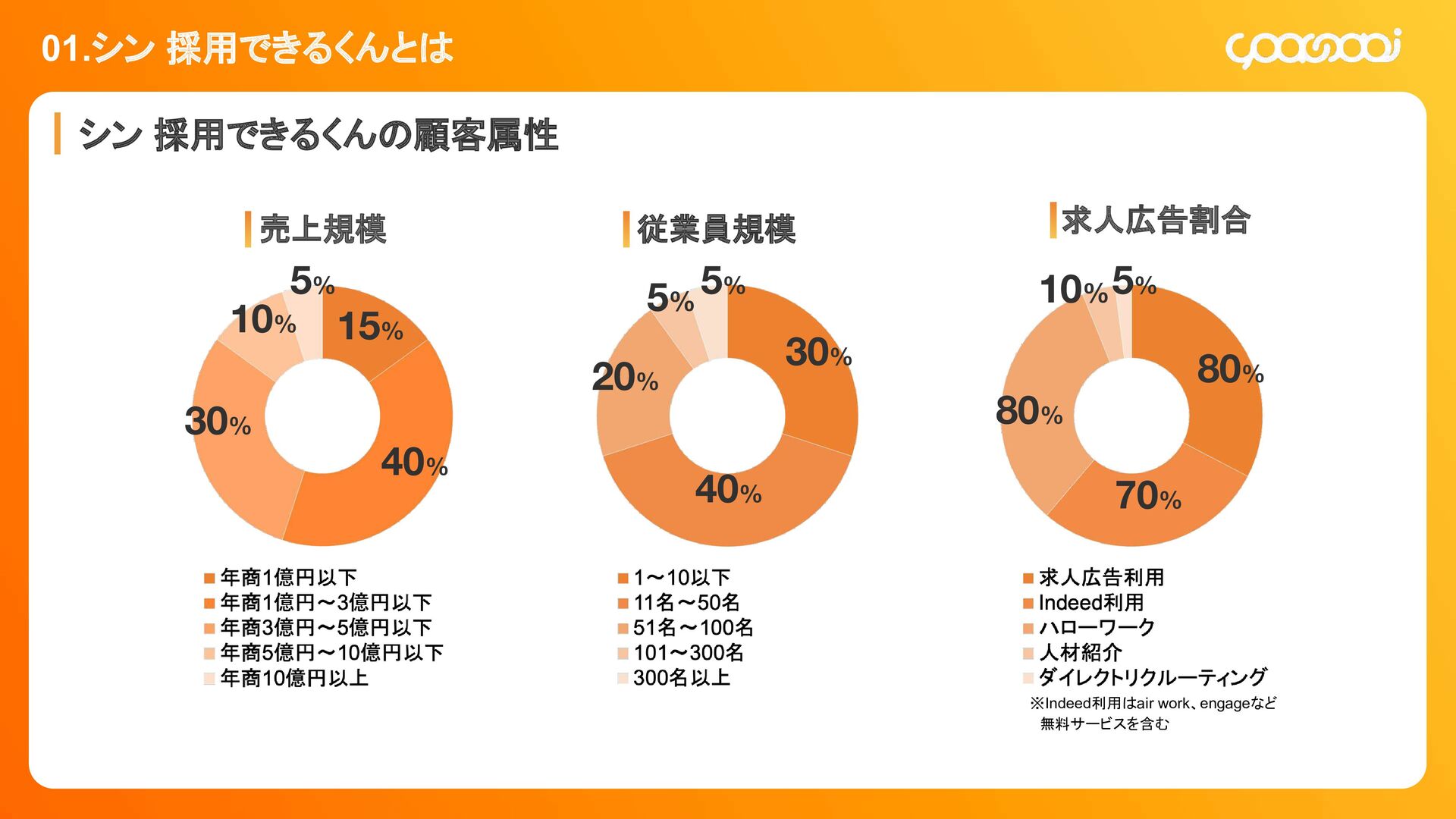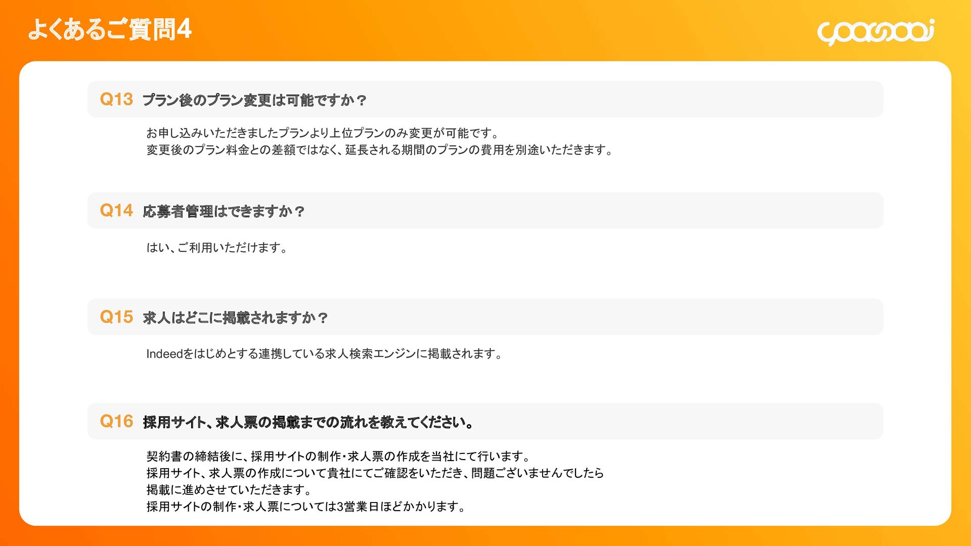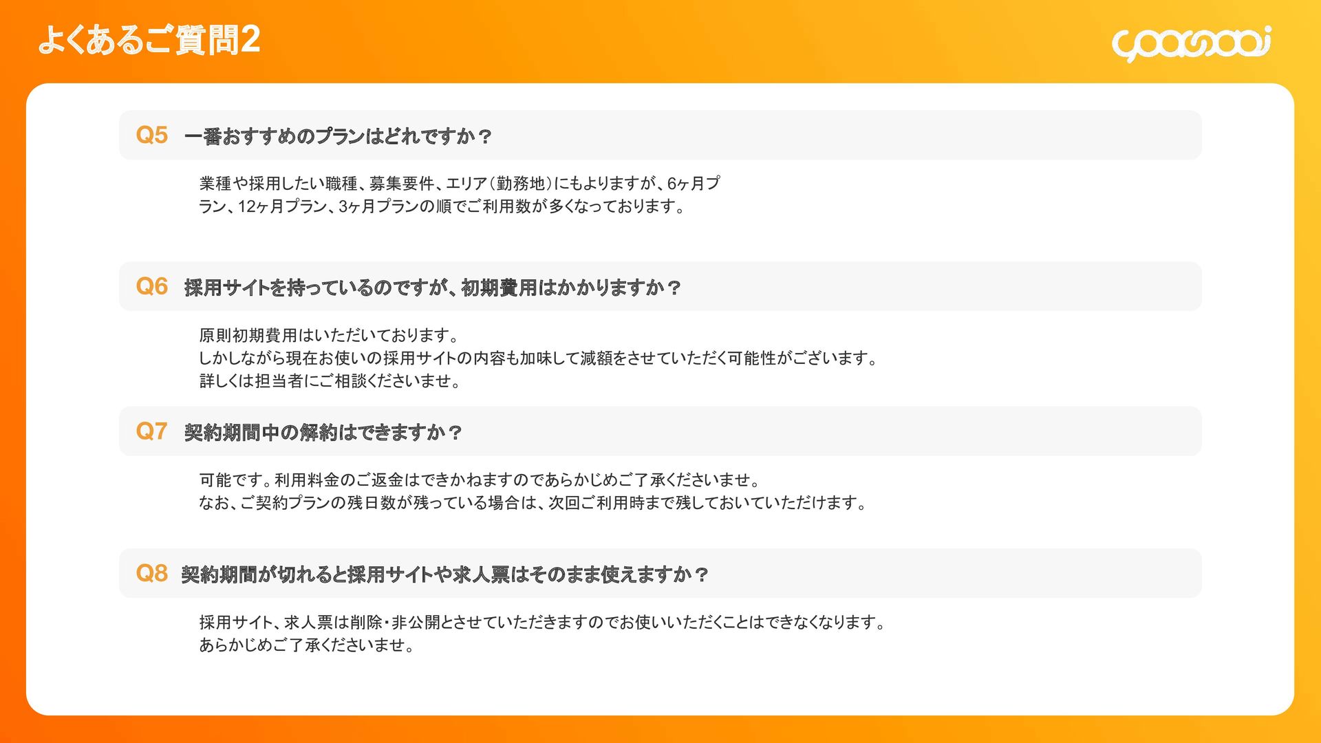 12ヶ月プラン ¥ 1,000,000円お得! 1 2 3 総額 ¥150,000円 (税別) 月額 ¥100,000円 (税別) 総額 ¥300,000円 (税別) 月額 ¥75,000円 (税別) 総額 ¥450,000円 (税別) 月額 ¥65,000円 (税別) 総額 ¥780,000円 (税別) 初期費用:一律 100,000円 (税別) ※利用途中で仮にご採用が決まった場合は、その都度止めていただくことも可能です。 再度再開する際は、残っております残数よりご利用いただけるよう柔軟性をもってご利用いただけます。 03.料金