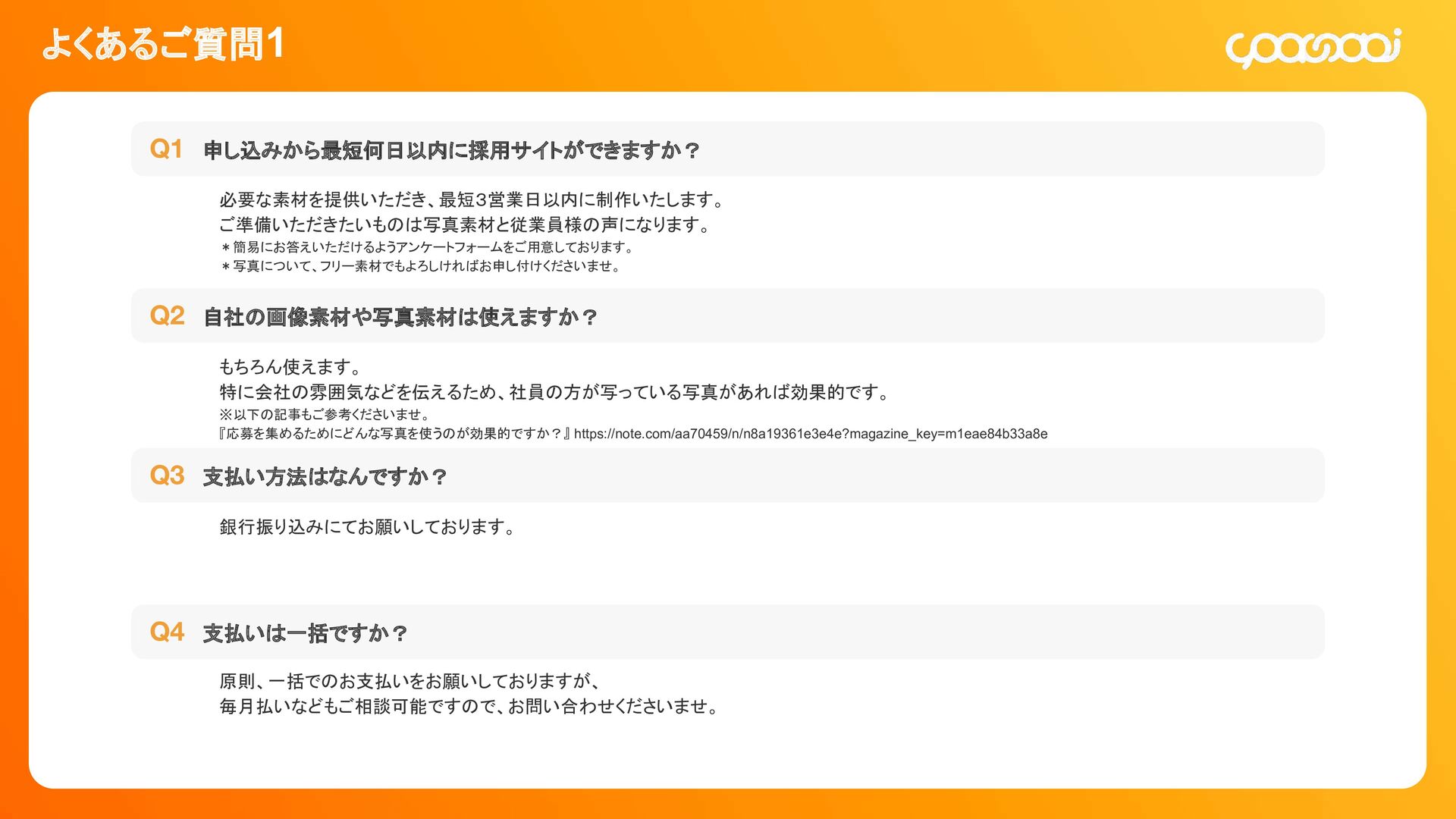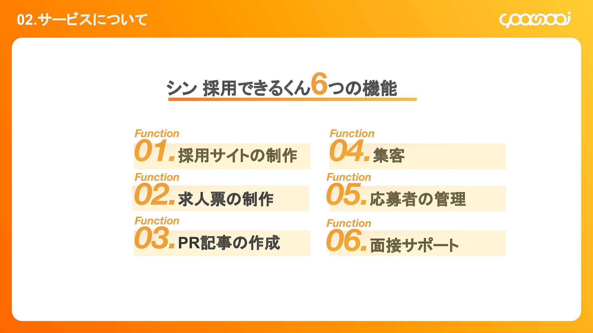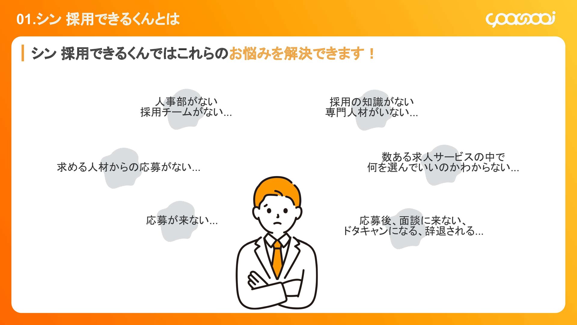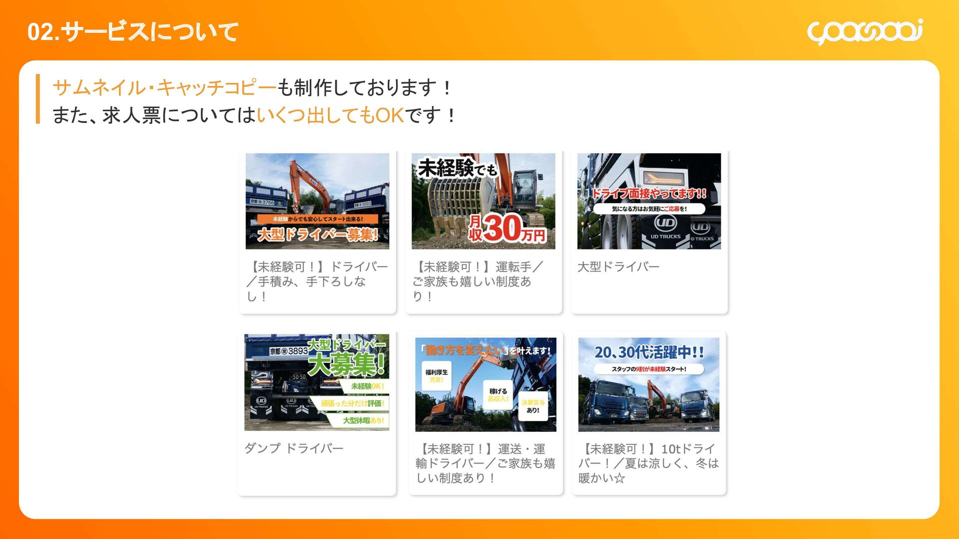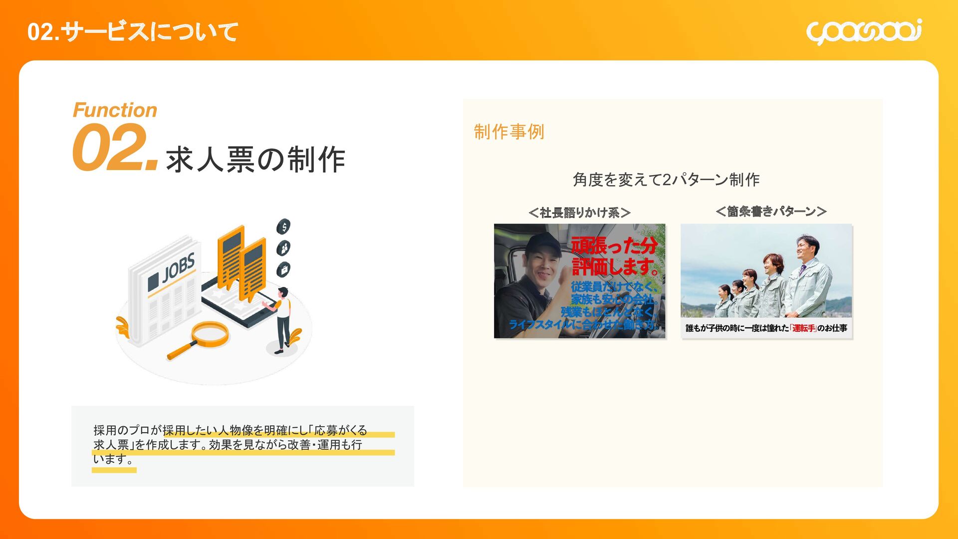 12ヶ月プラン ¥ 1,000,000円お得! 1 2 3 総額 ¥150,000円 (税別) 月額 ¥100,000円 (税別) 総額 ¥300,000円 (税別) 月額 ¥75,000円 (税別) 総額 ¥450,000円 (税別) 月額 ¥65,000円 (税別) 総額 ¥780,000円 (税別) 初期費用:一律 100,000円 (税別) ※利用途中で仮にご採用が決まった場合は、その都度止めていただくことも可能です。 再度再開する際は、残っております残数よりご利用いただけるよう柔軟性をもってご利用いただけます。 03.料金