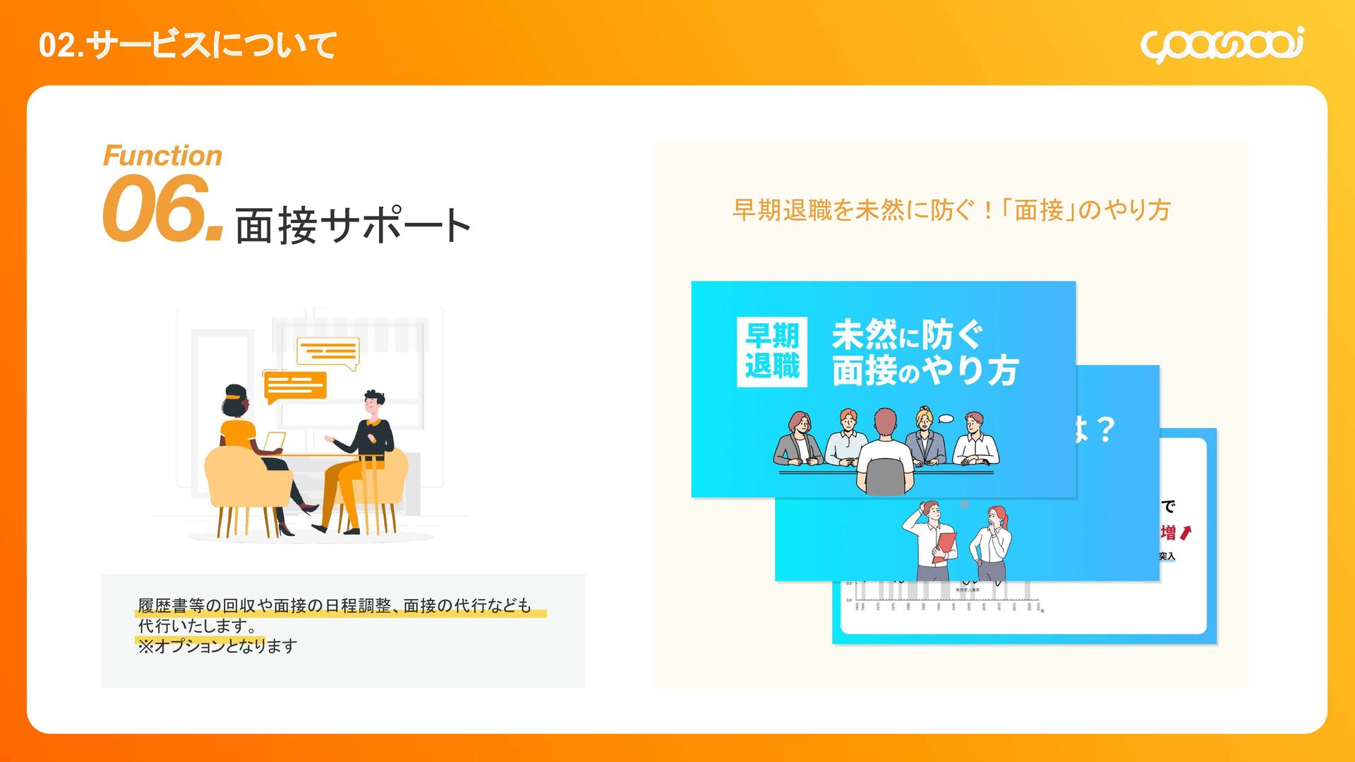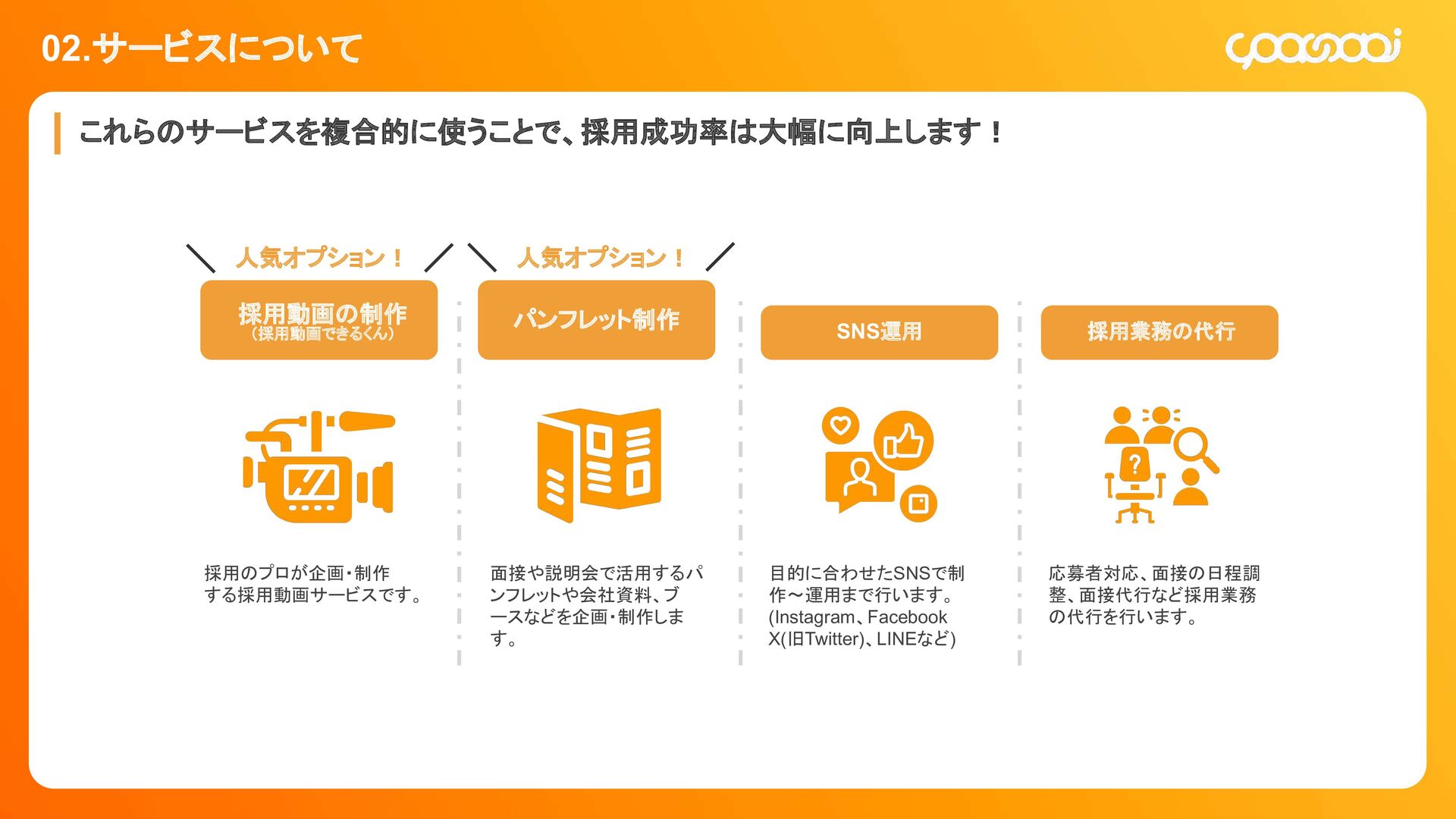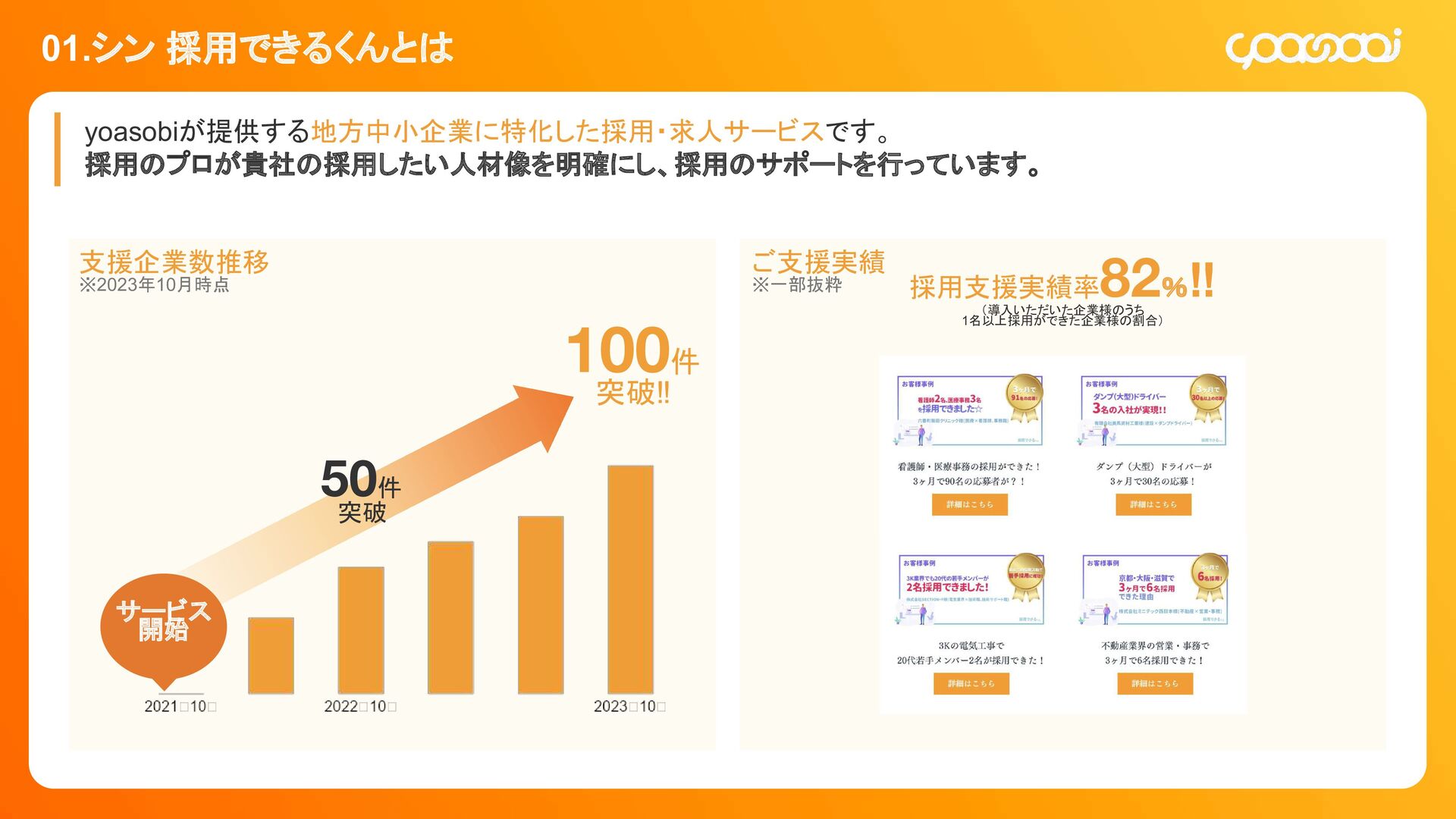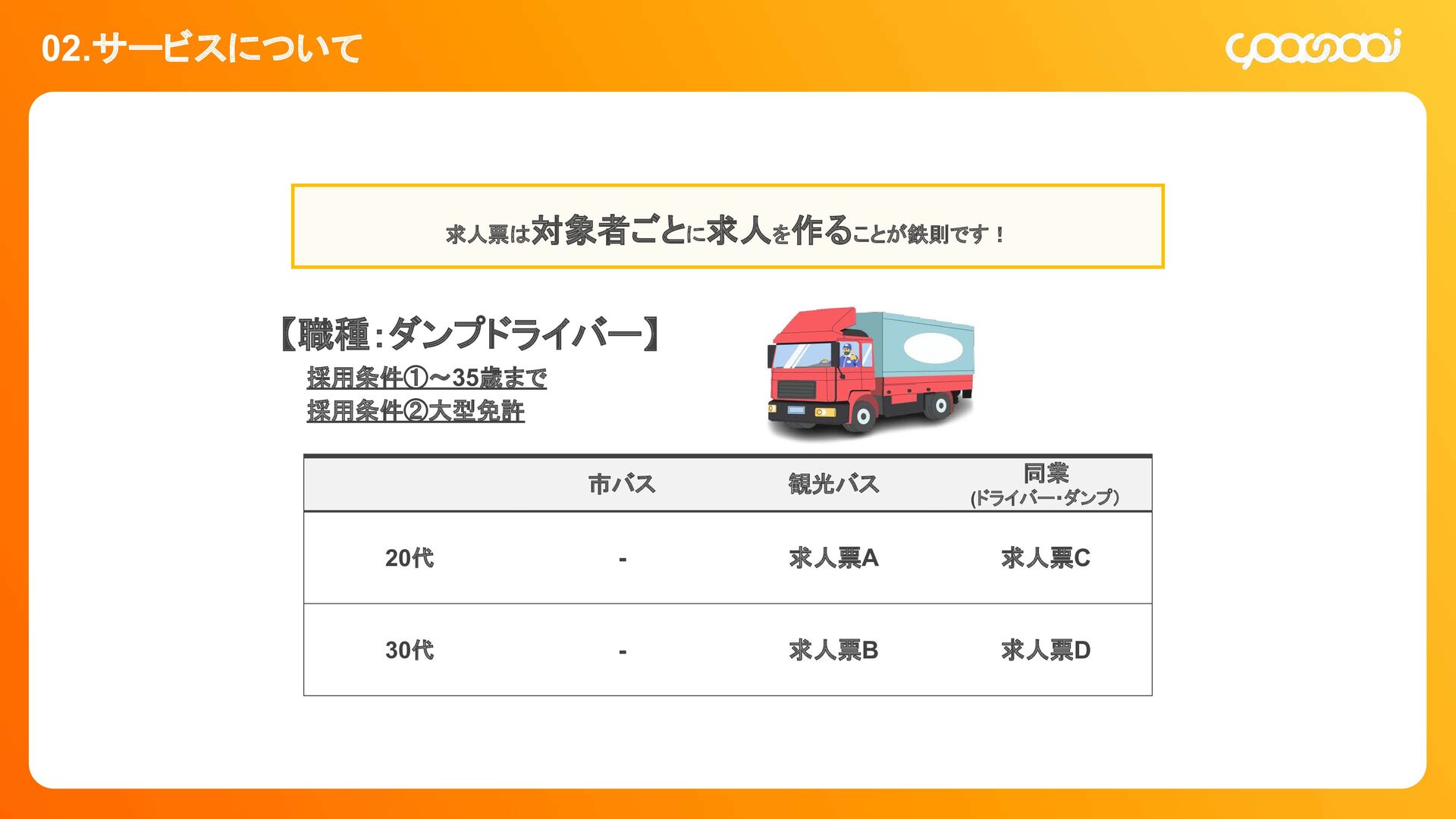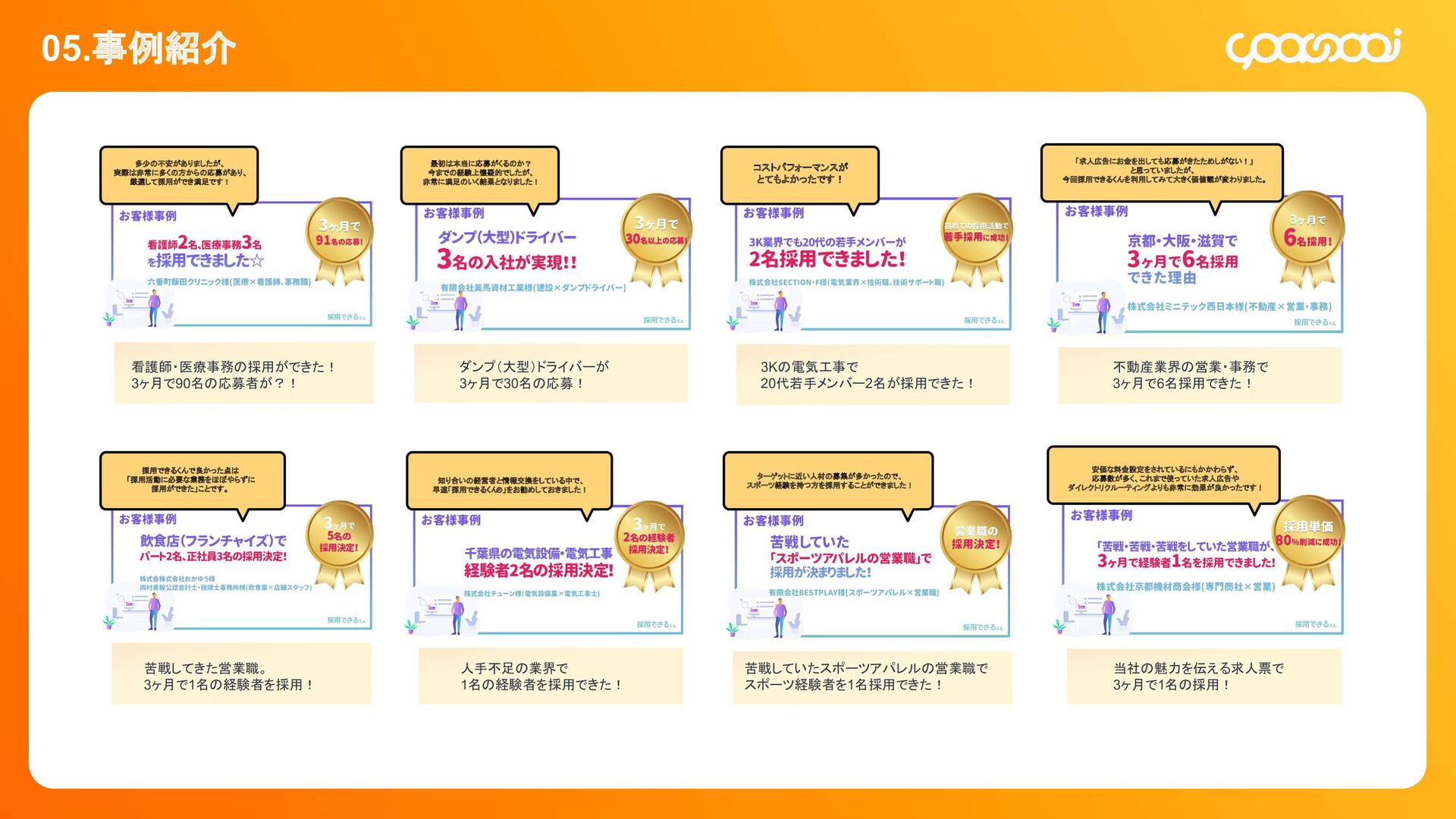 12ヶ月プラン ¥ 1,000,000円お得! 1 2 3 総額 ¥150,000円 (税別) 月額 ¥100,000円 (税別) 総額 ¥300,000円 (税別) 月額 ¥75,000円 (税別) 総額 ¥450,000円 (税別) 月額 ¥65,000円 (税別) 総額 ¥780,000円 (税別) 初期費用:一律 100,000円 (税別) ※利用途中で仮にご採用が決まった場合は、その都度止めていただくことも可能です。 再度再開する際は、残っております残数よりご利用いただけるよう柔軟性をもってご利用いただけます。 03.料金