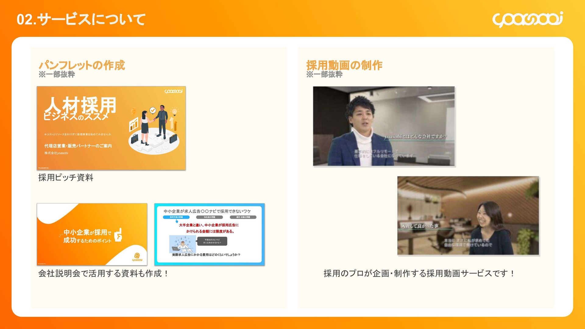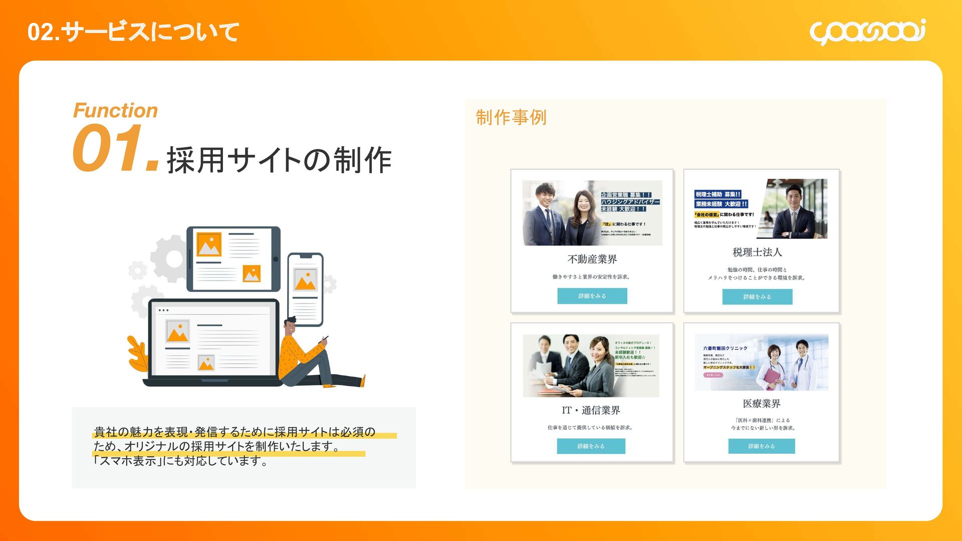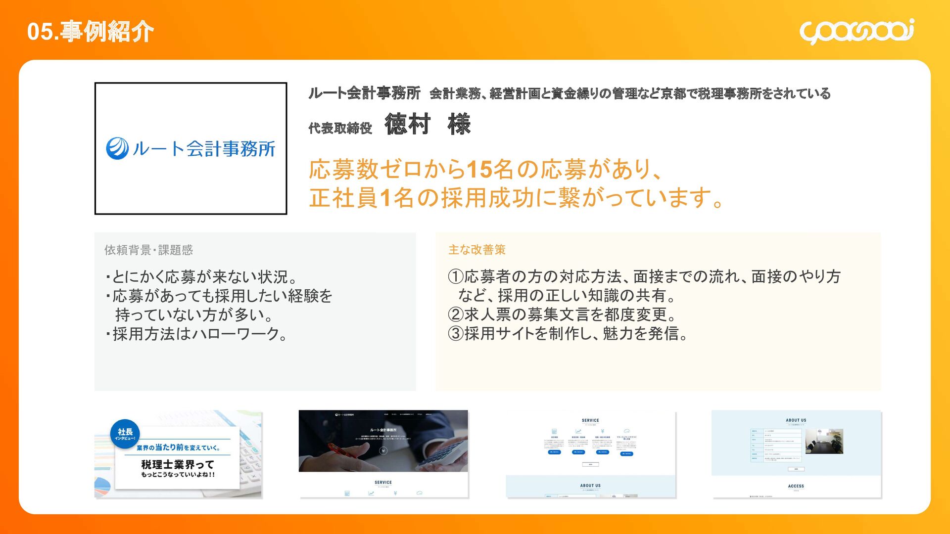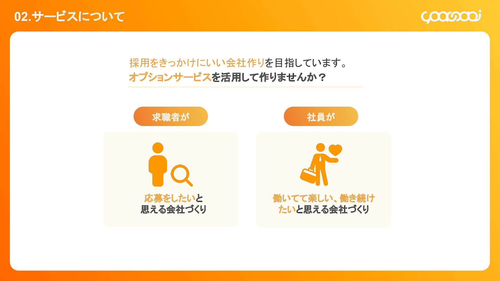 12ヶ月プラン ¥ 1,000,000円お得! 1 2 3 総額 ¥150,000円 (税別) 月額 ¥100,000円 (税別) 総額 ¥300,000円 (税別) 月額 ¥75,000円 (税別) 総額 ¥450,000円 (税別) 月額 ¥65,000円 (税別) 総額 ¥780,000円 (税別) 初期費用:一律 100,000円 (税別) ※利用途中で仮にご採用が決まった場合は、その都度止めていただくことも可能です。 再度再開する際は、残っております残数よりご利用いただけるよう柔軟性をもってご利用いただけます。 03.料金
