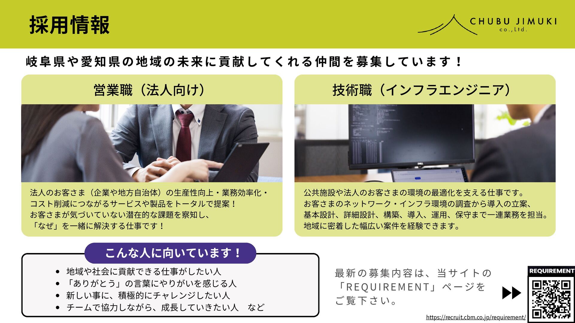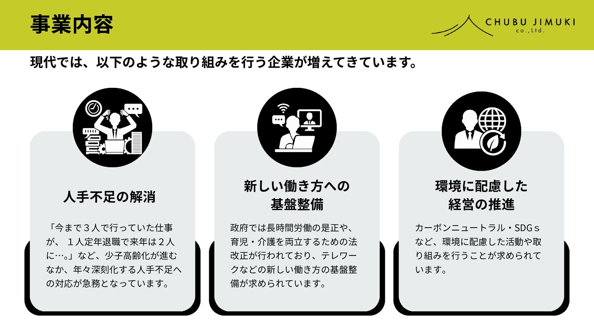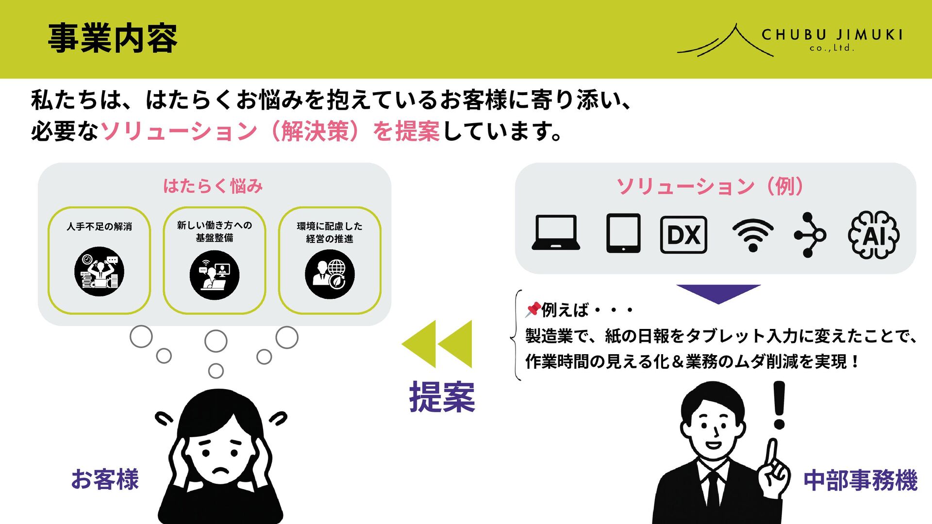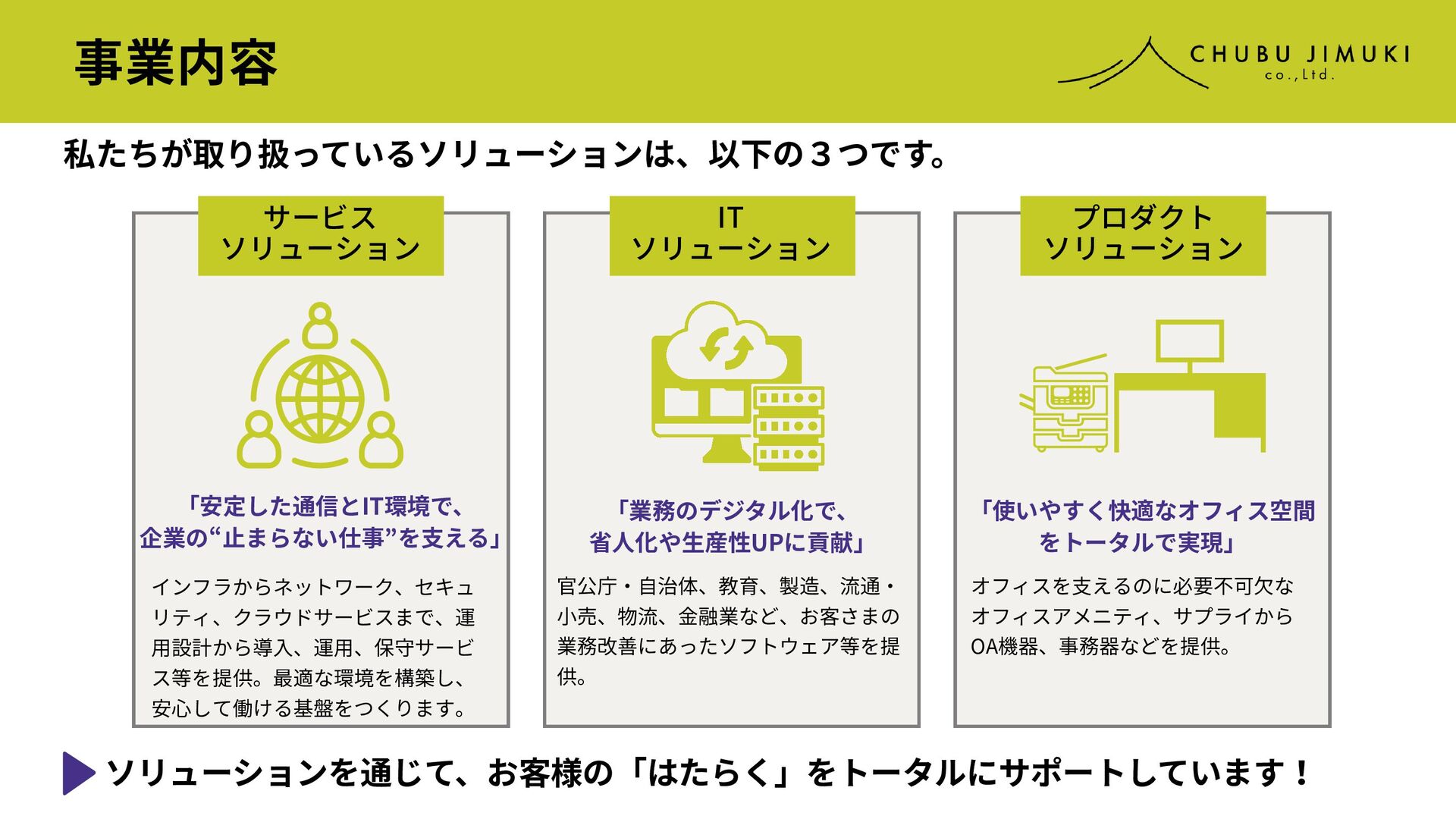 業務改善にあったソフトウェア等を提 供。 官公庁・自治体、教育、製造、流通・ 小売、物流、金融業など、お客さまの 業務改善にあったソフトウェア等を提 供。 オフィスを支えるのに必要不可欠な オフィスアメニティ、サプライから OA機器、事務器などを提供。 オフィスを支えるのに必要不可欠な オフィスアメニティ、サプライから OA機器、事務器などを提供。 私たちが取り扱っているソリューションは、以下の3つです。 ソリューションを通じて、お客様の「はたらく」をトータルにサポートしています! 「安定した通信とIT環境で、 企業の“止まらない仕事”を支える」 「業務のデジタル化で、 省人化や生産性UPに貢献」 「使いやすく快適なオフィス空間 をトータルで実現」 IT ソリューション プロダクト ソリューション