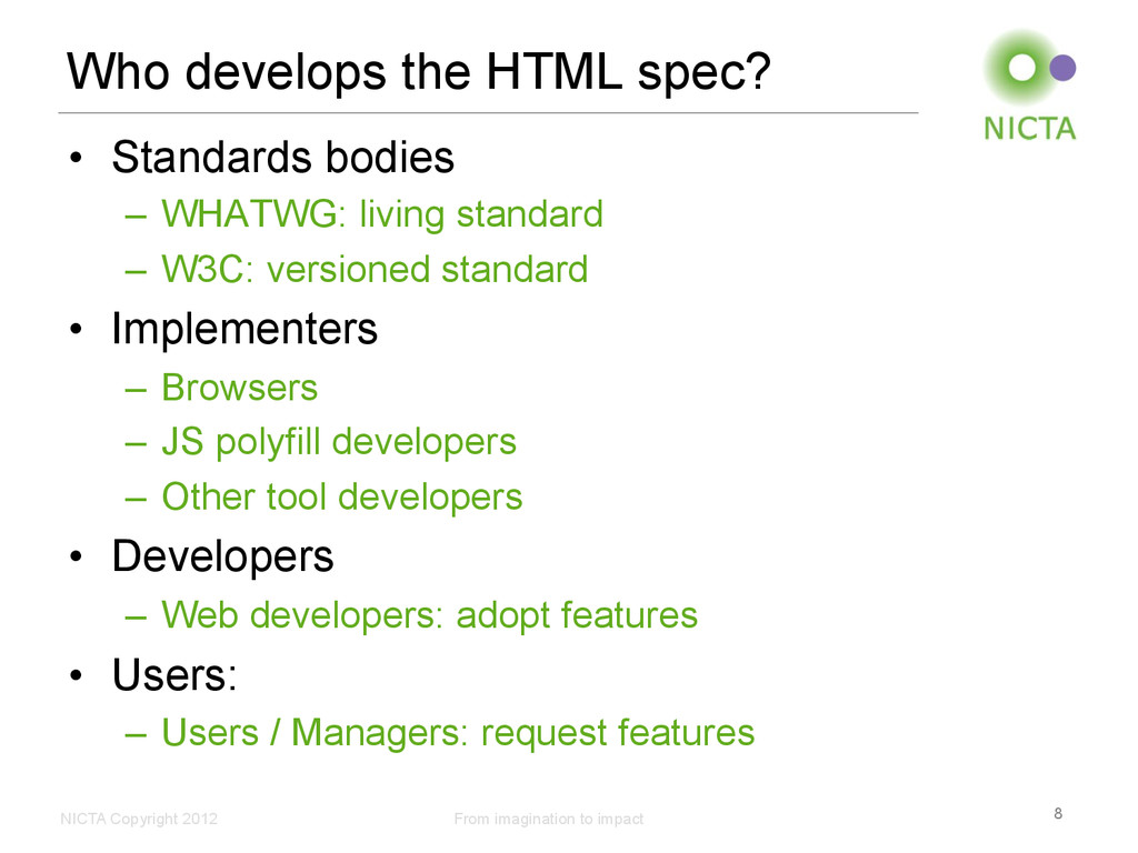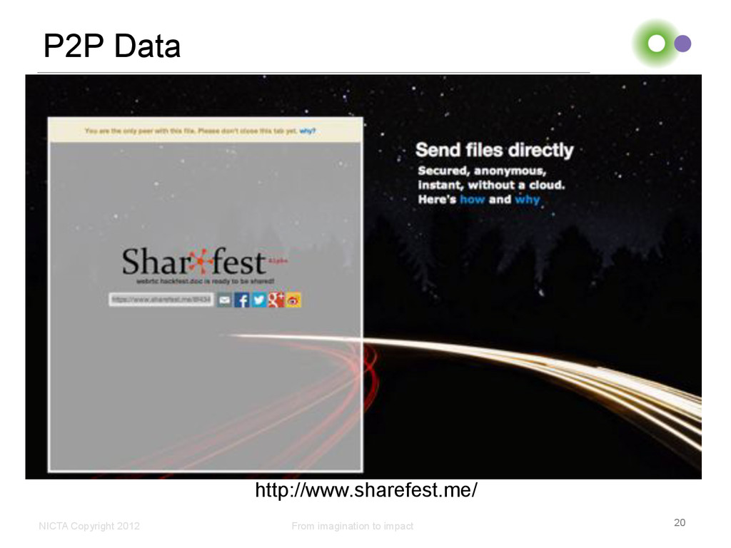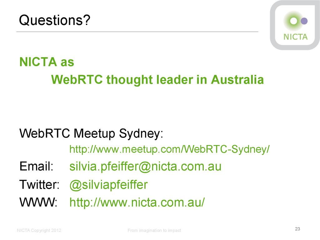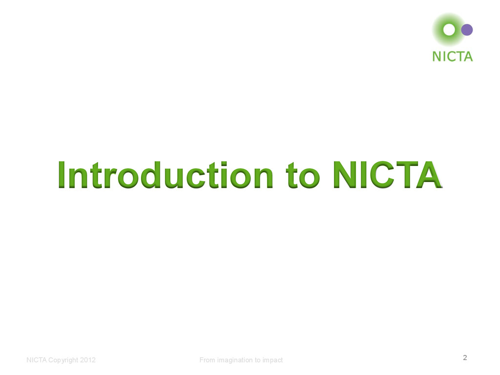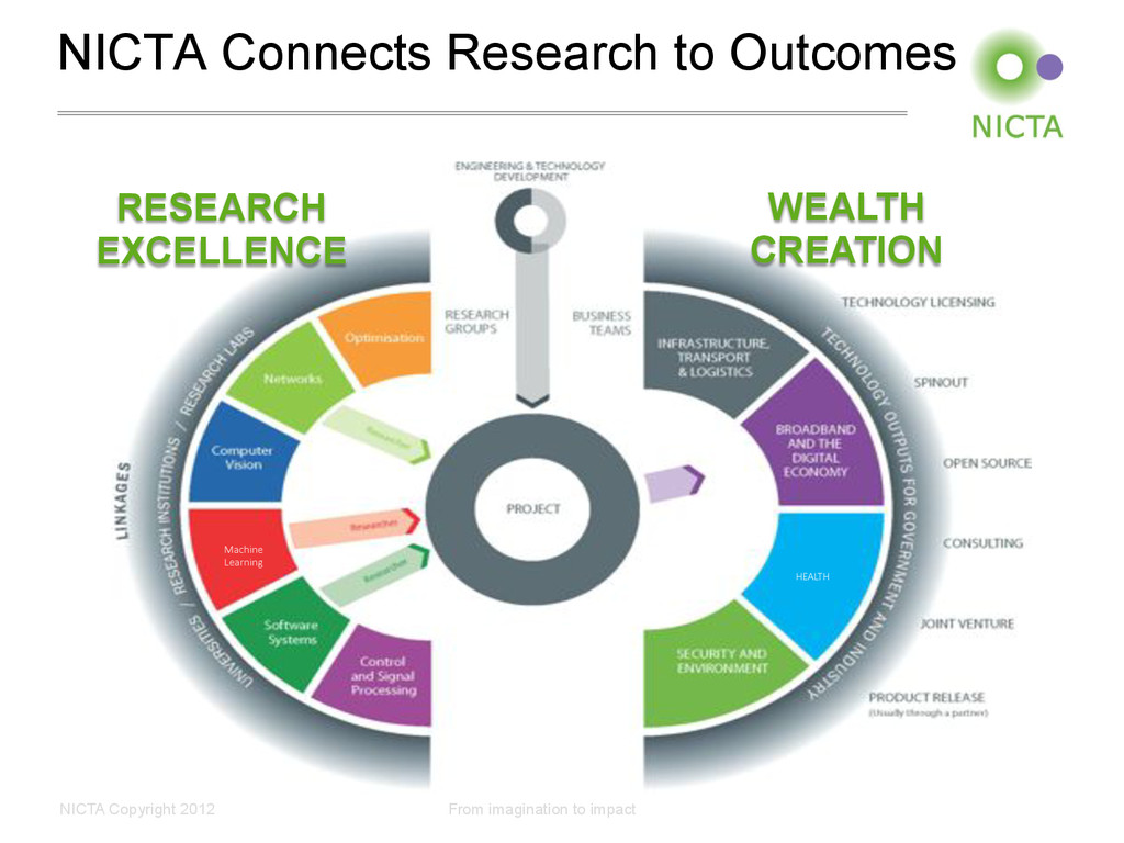Profile • Australia’s Centre of Excellence in ICT Research • Not for profit company, limited by guarantee, since 2003 • 6 research labs Sydney (2), Canberra, Melbourne (2), Brisbane • 700 people - 450 staff, 280 PhD students with 22 partner universities • ~600 research papers per year • ~150 patents total • $76 M p.a. from Federal, State & Territory Governments and industry plus contributions from university partners Key Activities • Research Excellence in ICT • Wealth creation (and national benefit) for Australia • Engaged with research, industry and government in Australia • Collaborative projects, contracting, consulting • Spinouts, licenses of patents and software • Engaged with international organisations and consortia • Collaboration, research exchanges, contracting, student internships, grant funding