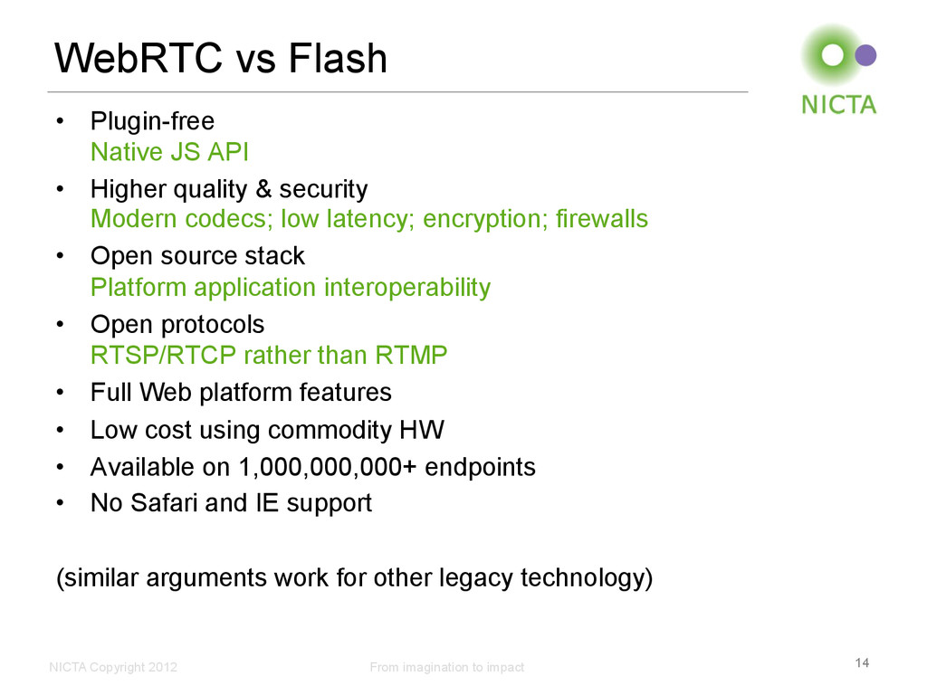 • Plugin-free Native JS API • Higher quality & security Modern codecs; low latency; encryption; firewalls • Open source stack Platform application interoperability • Open protocols RTSP/RTCP rather than RTMP • Full Web platform features • Low cost using commodity HW • Available on 1,000,000,000+ endpoints • No Safari and IE support (similar arguments work for other legacy technology) 14
