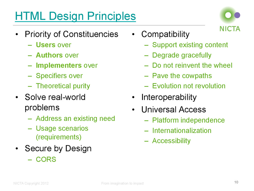 • Priority of Constituencies – Users over – Authors over – Implementers over – Specifiers over – Theoretical purity • Solve real-world problems – Address an existing need – Usage scenarios (requirements) • Secure by Design – CORS • Compatibility – Support existing content – Degrade gracefully – Do not reinvent the wheel – Pave the cowpaths – Evolution not revolution • Interoperability • Universal Access – Platform independence – Internationalization – Accessibility 10