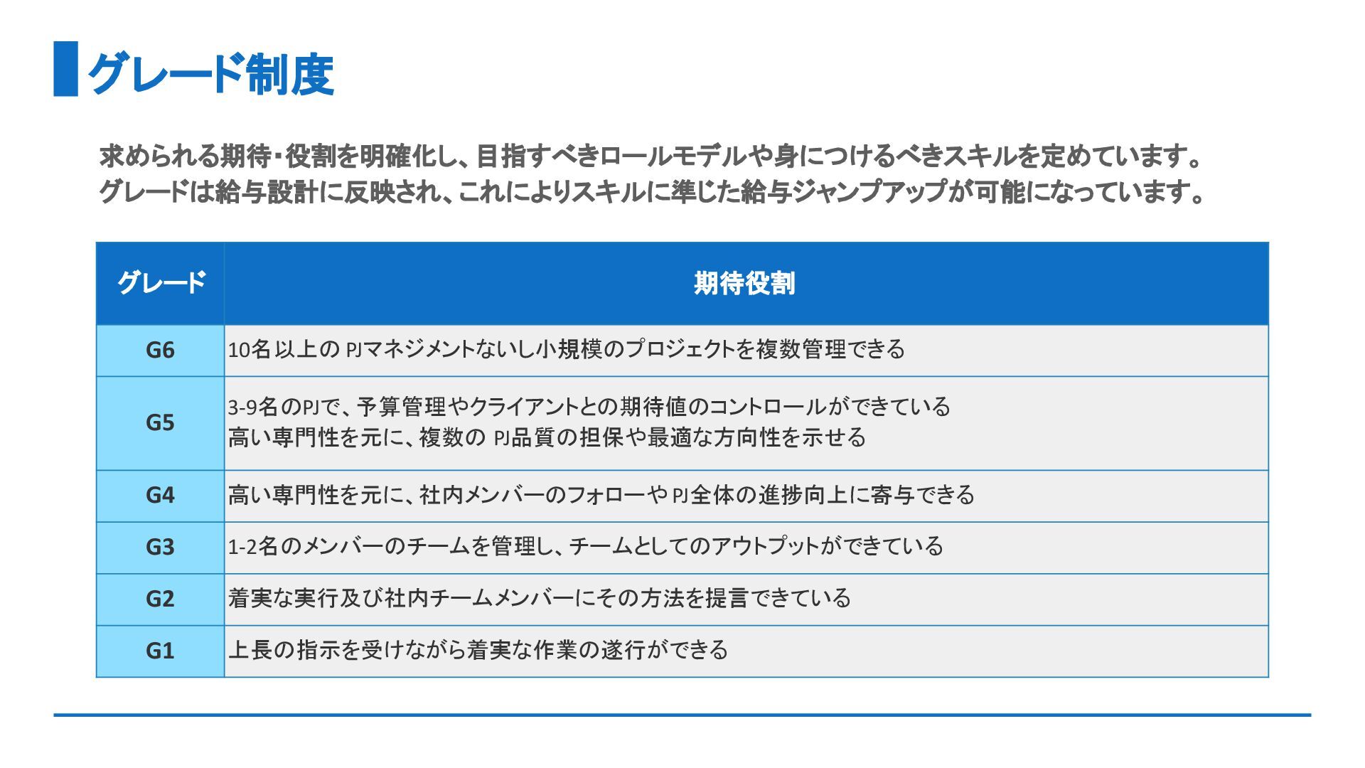 グレード 期待役割 G6 10名以上の PJマネジメントないし小規模のプロジェクトを複数管理できる G5