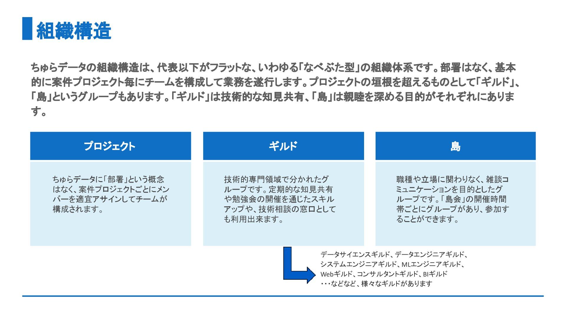 や勉強会の開催を通じたスキル アップや、技術相談の窓口として も利用出来ます。 職種や立場に関わりなく、雑談コ ミュニケーションを目的としたグ ループです。「島会」の開催時間 帯ごとにグループがあり、参加す ることができます。 ちゅらデータの組織構造は、代表以下がフラットな、いわゆる「なべぶた型」の組織体系です。部署はなく、基本 的に案件プロジェクト毎にチームを構成して業務を遂行します。プロジェクトの垣根を超えるものとして「ギルド」、 「島」というグループもあります。「ギルド」は技術的な知見共有、「島」は親睦を深める目的がそれぞれにありま す。