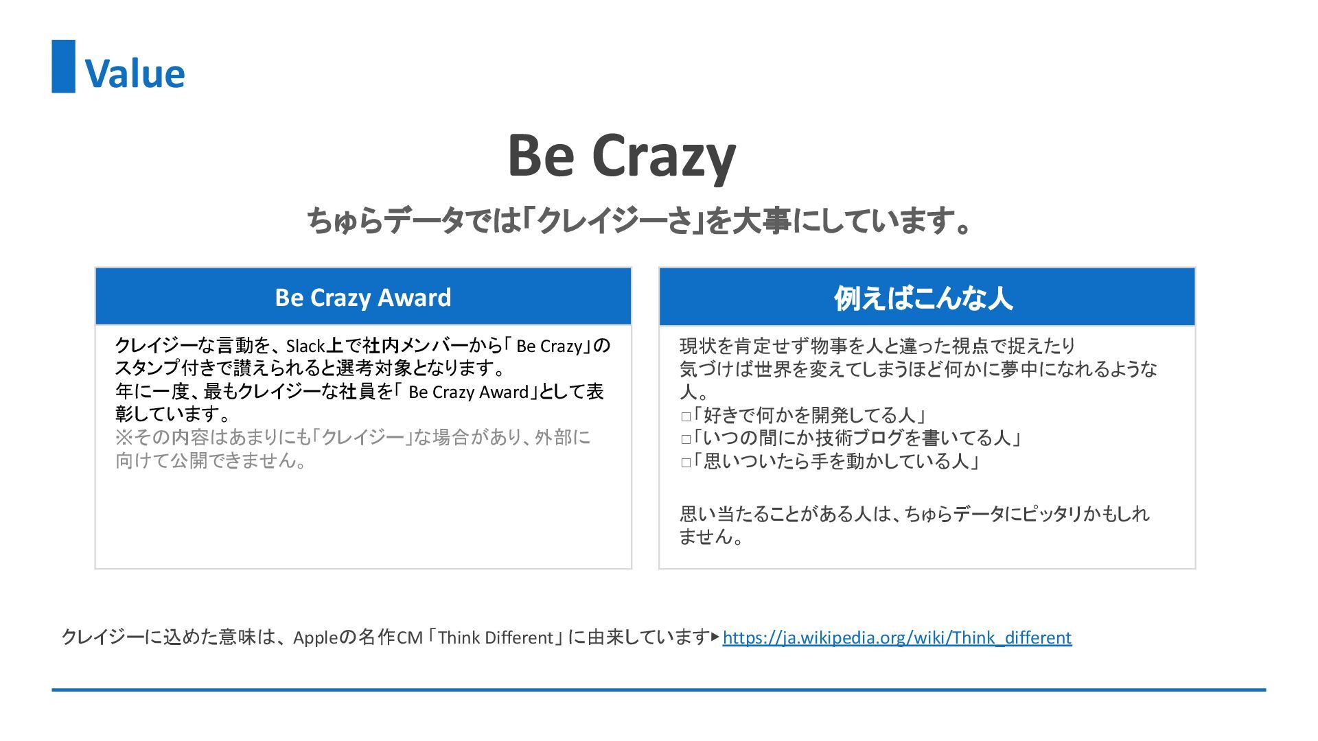 ◻「思いついたら手を動かしている人」 思い当たることがある人は、ちゅらデータにピッタリかもしれ ません。 Be Crazy Award クレイジーな言動を、 Slack上で社内メンバーから「 Be Crazy」の スタンプ付きで讃えられると選考対象となります。 年に一度、最もクレイジーな社員を「 Be Crazy Award」として表 彰しています。 ※その内容はあまりにも「クレイジー」な場合があり、外部に 向けて公開できません。 クレイジーに込めた意味は、 Appleの名作CM 「Think Different」 に由来しています▶https://ja.wikipedia.org/wiki/Think_different