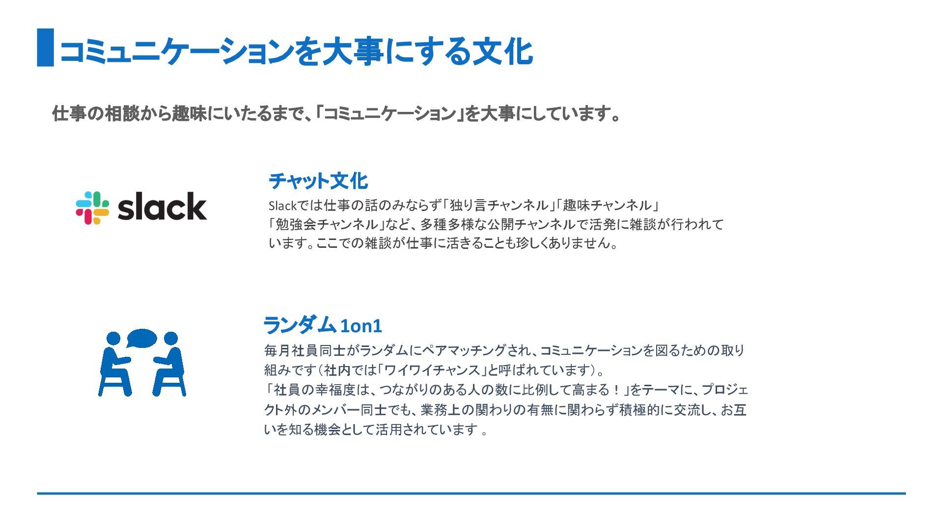 /不定期勉強会が頻繁に開催されています。 (平均して週に 3〜5件程度の開催実績 ) 過去に開催された勉強会テーマ(抜粋) NLP勉強会 因果推論勉強会 Tableau相談室 SQL研修 10週後にTerraformマスター になる文系エンジニア ChatGPT APIティータイムハ ンズオン OpenMetadata聞いてみよ 会 数学/統計学/機械学習勉 強会 開集合を解説する講座 MMM(Marketing Mix Modeling)勉強会 統計学実践ワークブック [輪 読会] プロジェクトマネジメントの 基本が全部わかる本 [輪読 会] システム運用アンチパター ン[輪読会] セキュアで信頼性のあるシ ステム構築[輪読会] 実践的データ基盤への処 方箋[輪読会]