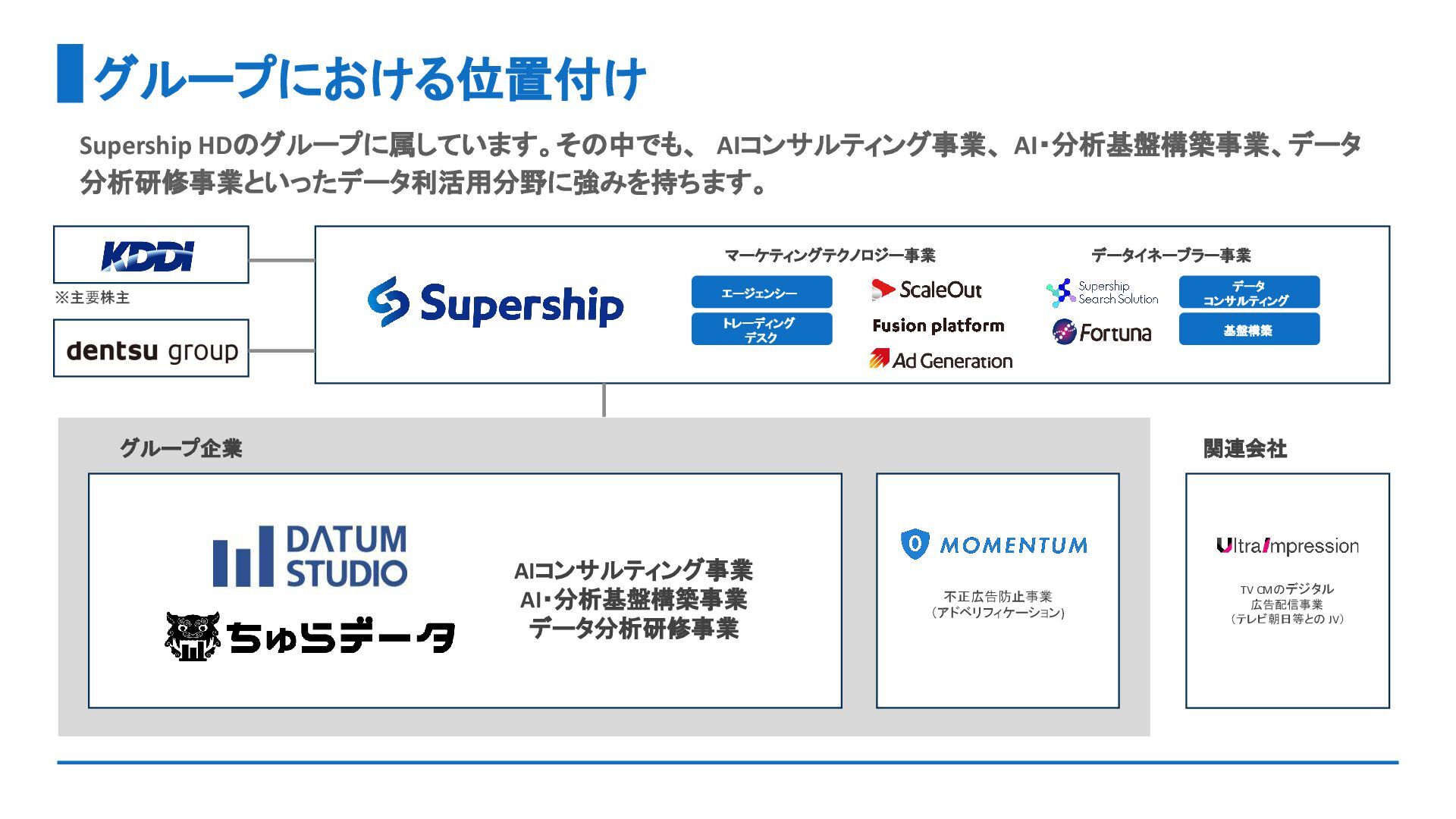 2. グループにおける位置付け Supership HDのグループに属しています。その中でも、 AIコンサルティング事業、 AI・分析基盤構築事業、データ 分析研修事業といったデータ利活用分野に強みを持ちます。 エージェンシー トレーディング デスク データ
