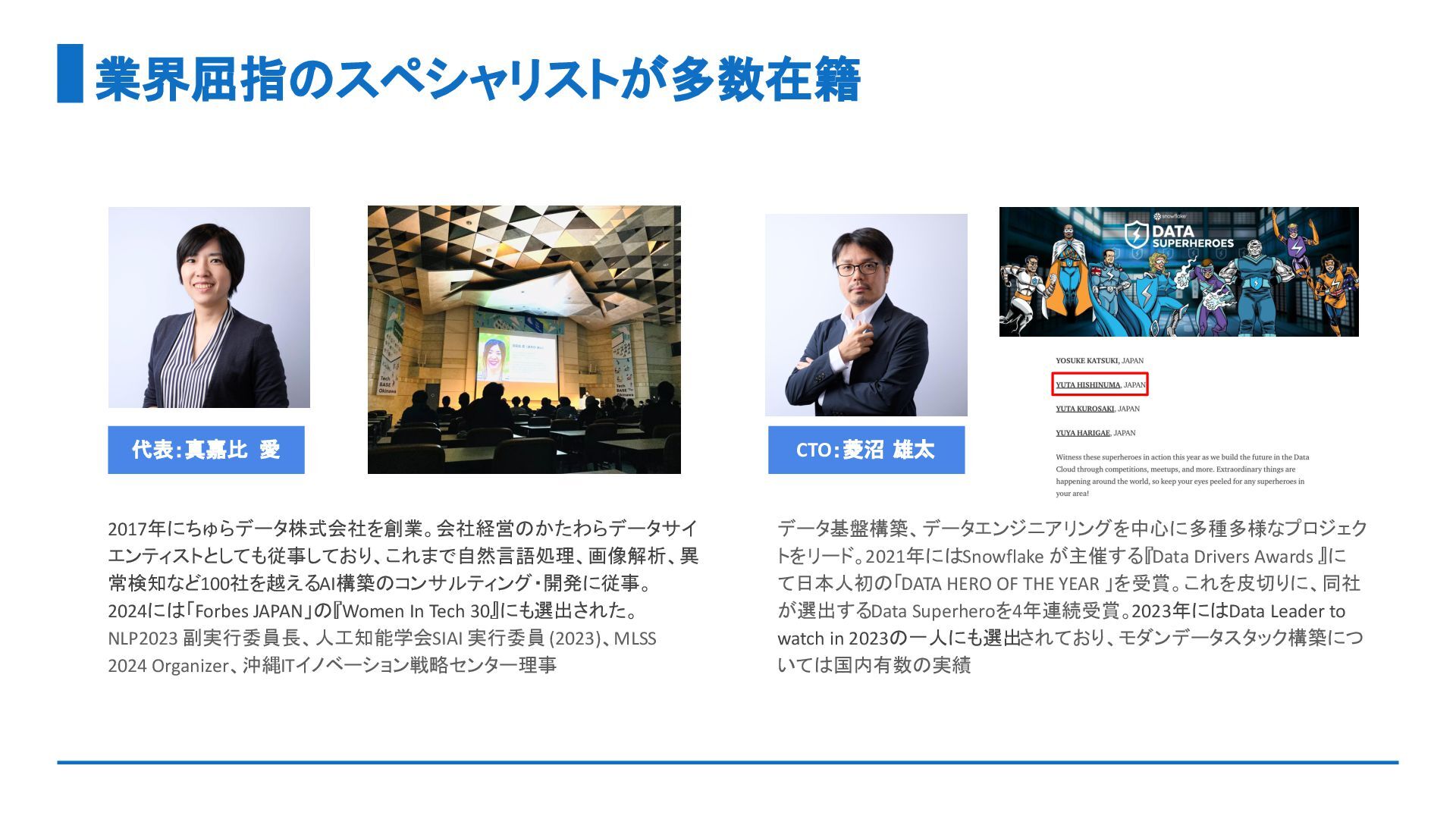 4. 業界屈指のスペシャリストが多数在籍 代表:真嘉比 愛 CTO:菱沼 雄太 2017年にちゅらデータ株式会社を創業。会社経営のかたわらデータサイ エンティストとしても従事しており、これまで自然言語処理、画像解析、異 常検知など100社を越えるAI構築のコンサルティング・開発に従事。 2024には「Forbes JAPAN」の『Women