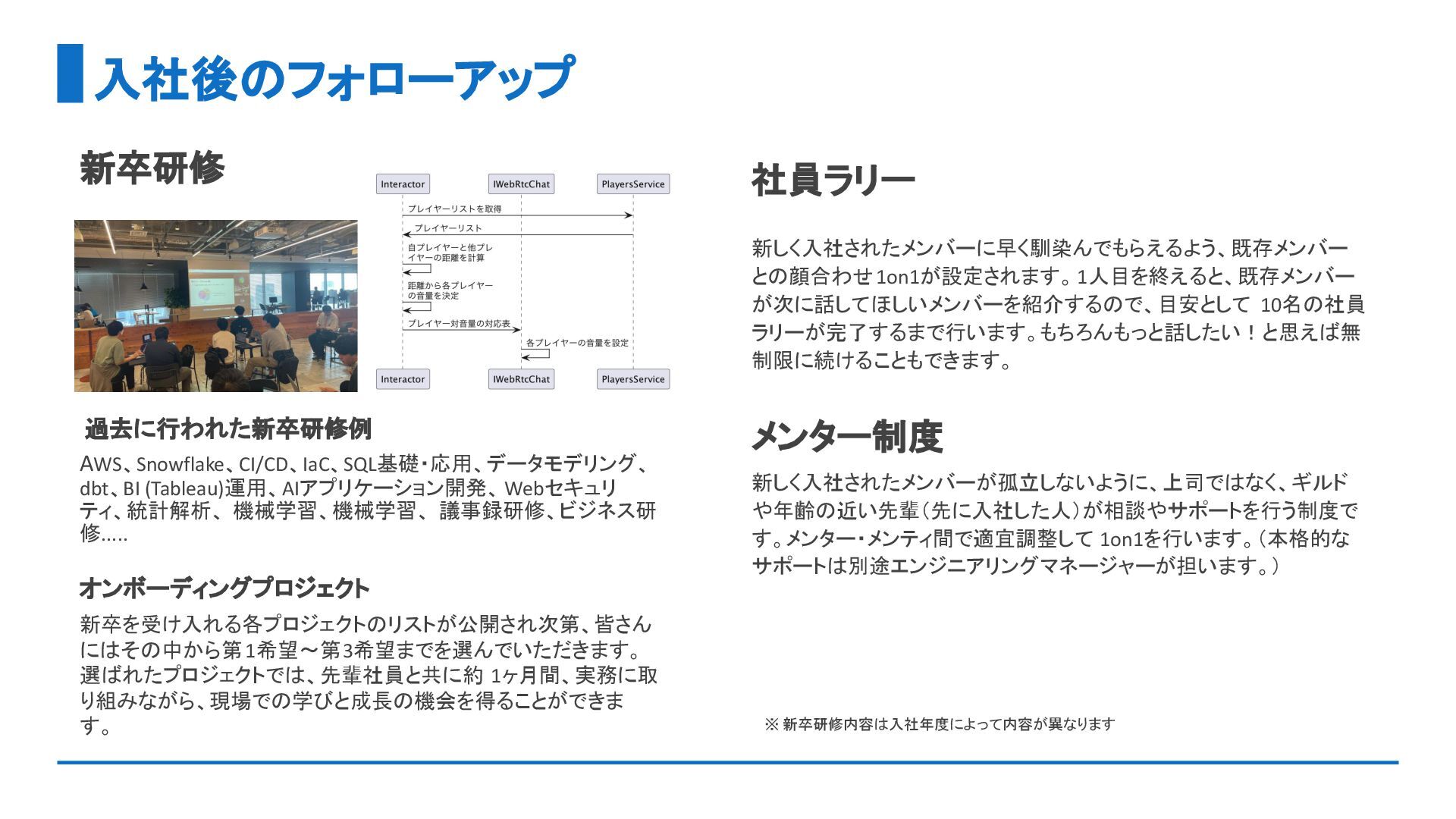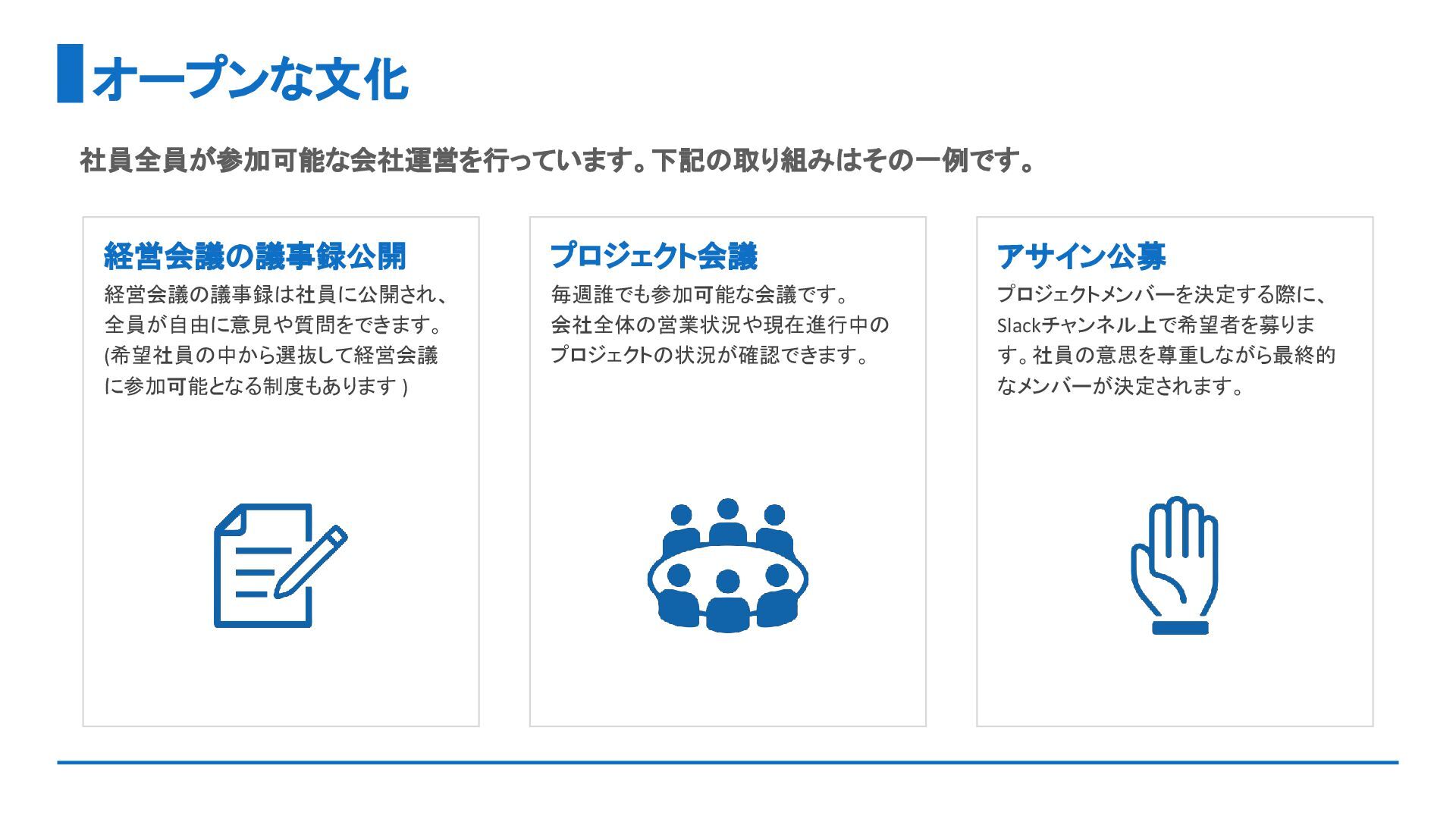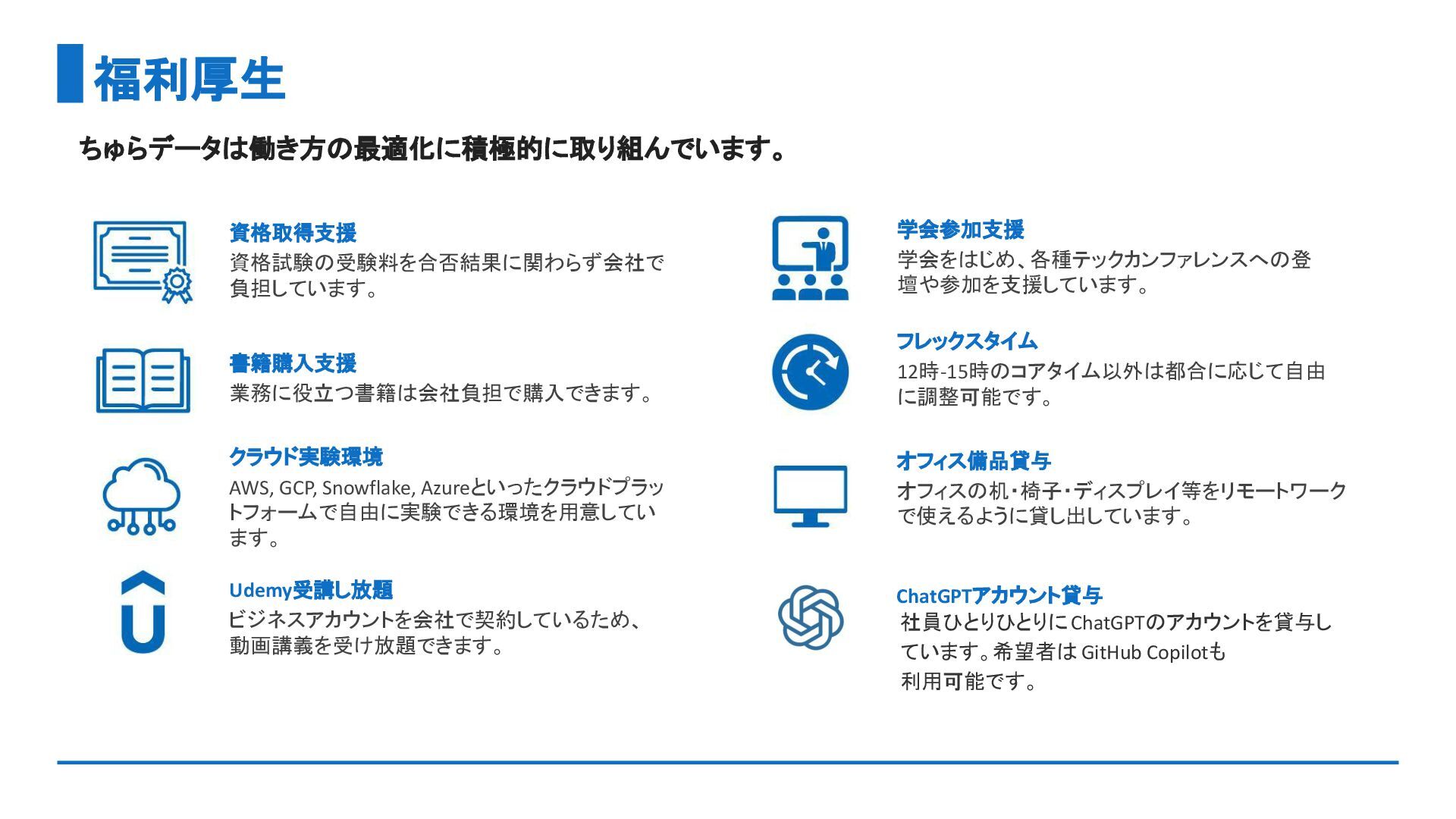 クラウド実験環境 AWS, GCP, Snowflake, Azureといったクラウドプラッ トフォームで自由に実験できる環境を用意してい ます。 フレックスタイム 12時-15時のコアタイム以外は都合に応じて自由 に調整可能です。 Udemy受講し放題 ビジネスアカウントを会社で契約しているため、 動画講義を受け放題できます。 オフィス備品貸与 オフィスの机・椅子・ディスプレイ等をリモートワーク で使えるように貸し出しています。 社員ひとりひとりにChatGPTのアカウントを貸与し ています。希望者は GitHub Copilotも 利用可能です。 ChatGPTアカウント貸与