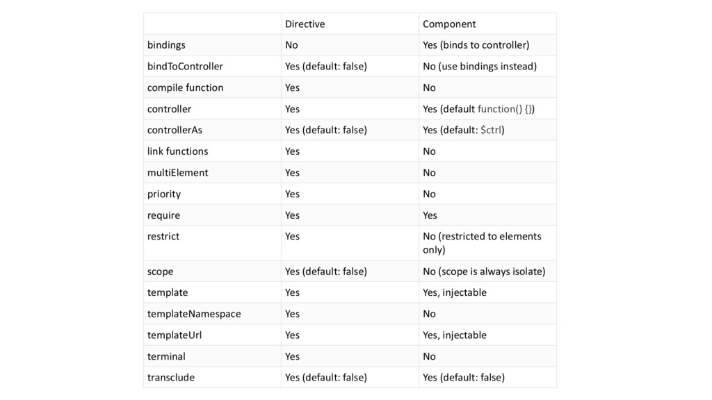 (default: false) No (use bindings instead) compile function Yes No controller Yes Yes (default function() {}) controllerAs Yes (default: false) Yes (default: $ctrl) link functions Yes No multiElement Yes No priority Yes No require Yes Yes restrict Yes No (restricted to elements only) scope Yes (default: false) No (scope is always isolate) template Yes Yes, injectable templateNamespace Yes No templateUrl Yes Yes, injectable terminal Yes No transclude Yes (default: false) Yes (default: false)