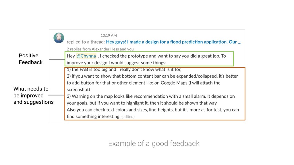 etc Validate your designs through usability testing We’re all human beings – treat others’ opinions as if it were your own Practice giving feedback too! Every Feedback Counts !