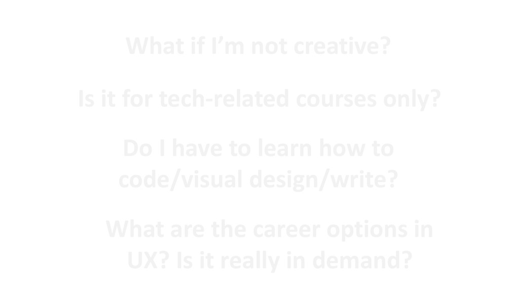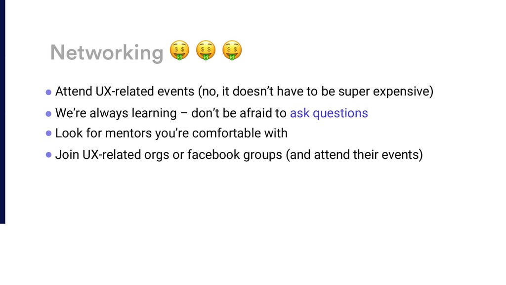 expensive) We’re always learning – don’t be afraid to ask questions Look for mentors you’re comfortable with Join UX-related orgs or facebook groups (and attend their events) Networking ! ! !
