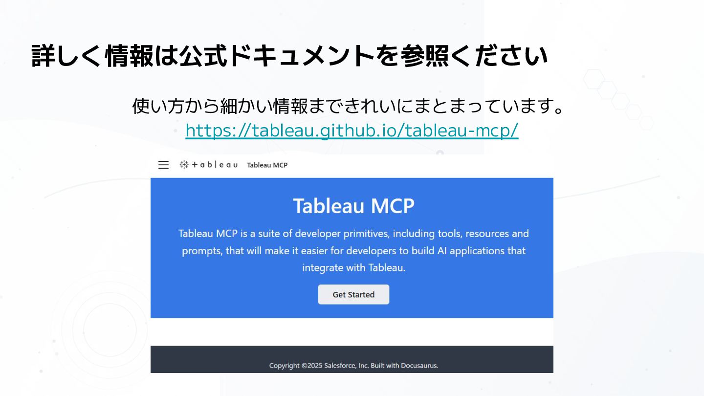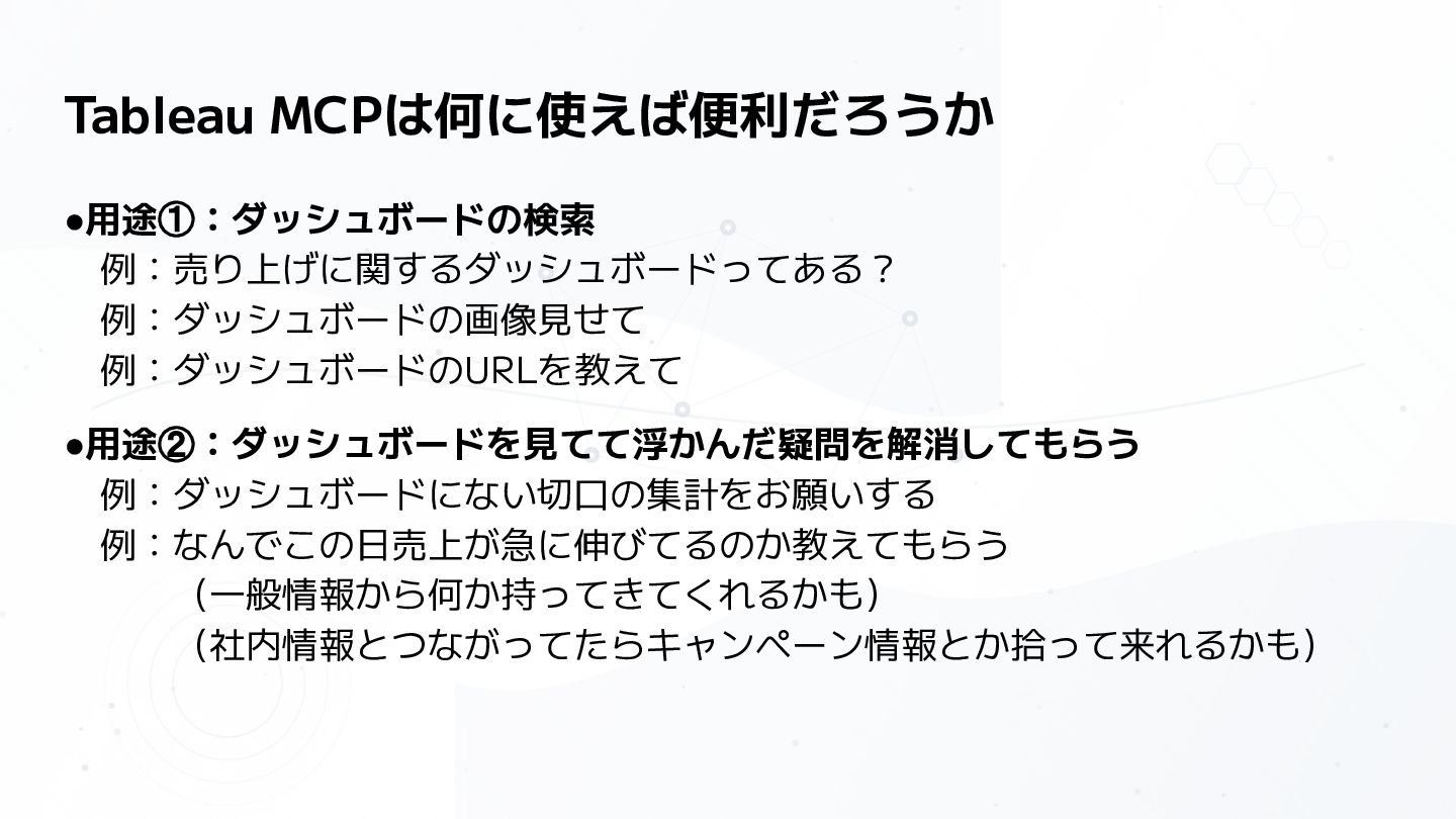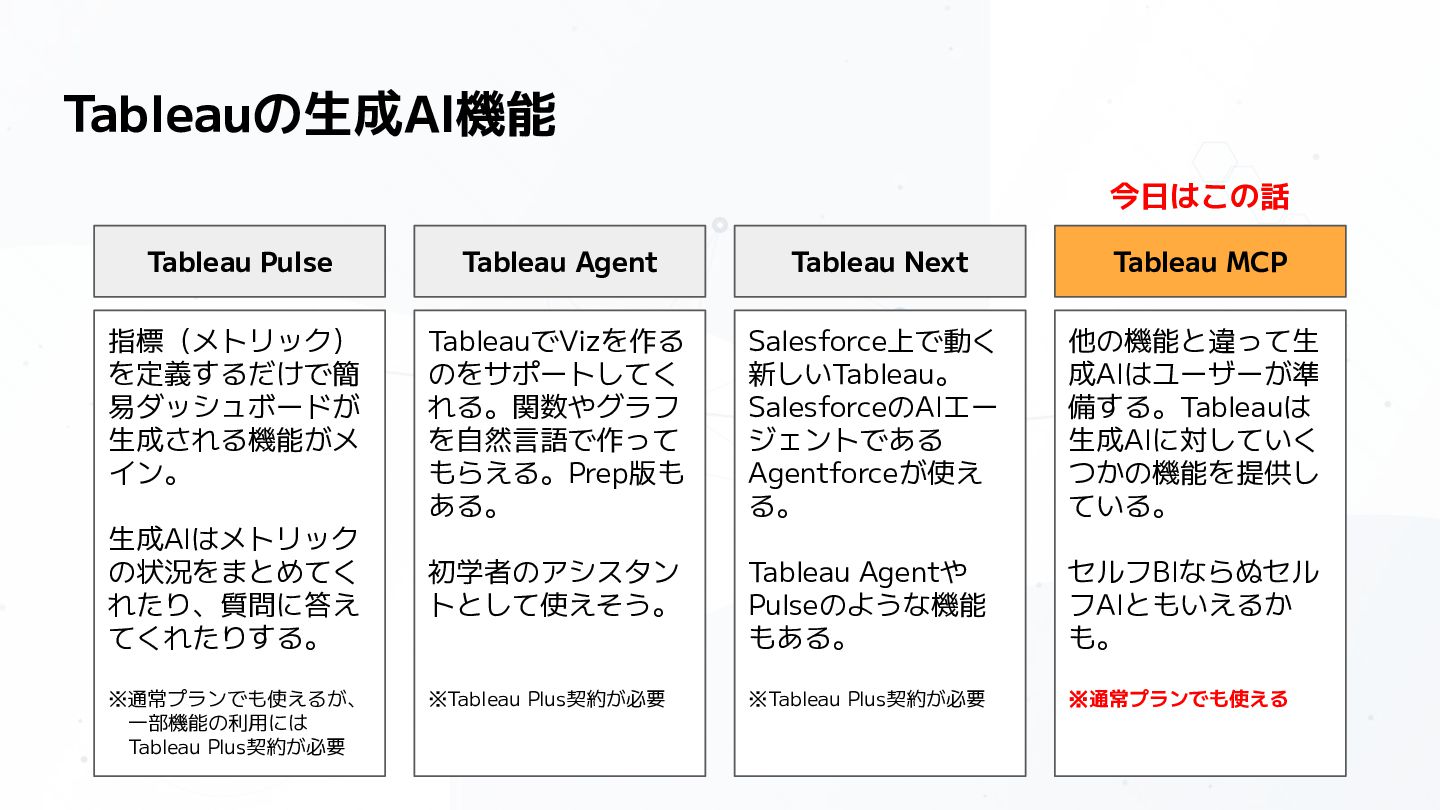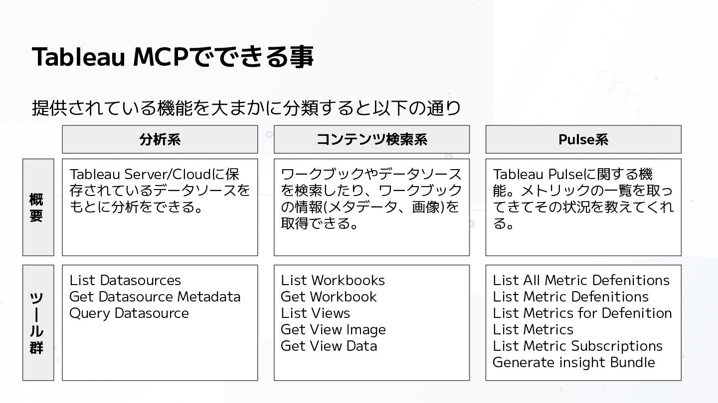ワークブックやデータソース を検索したり、ワークブック の情報(メタデータ、画像)を 取得できる。 Tableau Pulseに関する機 能。メトリックの一覧を取っ てきてその状況を教えてくれ る。 List Datasources Get Datasource Metadata Query Datasource List Workbooks Get Workbook List Views Get View Image Get View Data List All Metric Defenitions List Metric Defenitions List Metrics for Defenition List Metrics List Metric Subscriptions Generate insight Bundle 概 要 ツ | ル 群