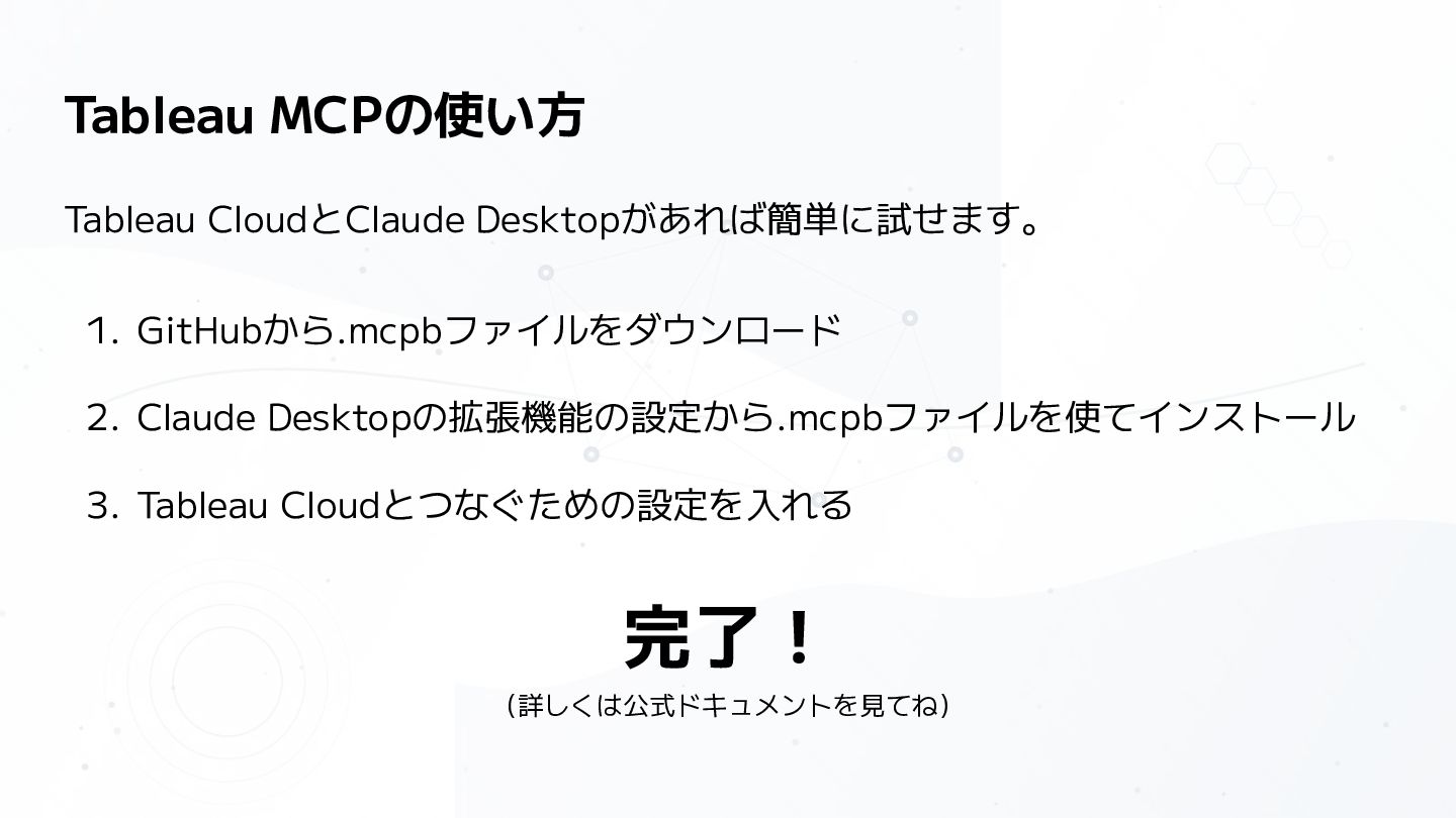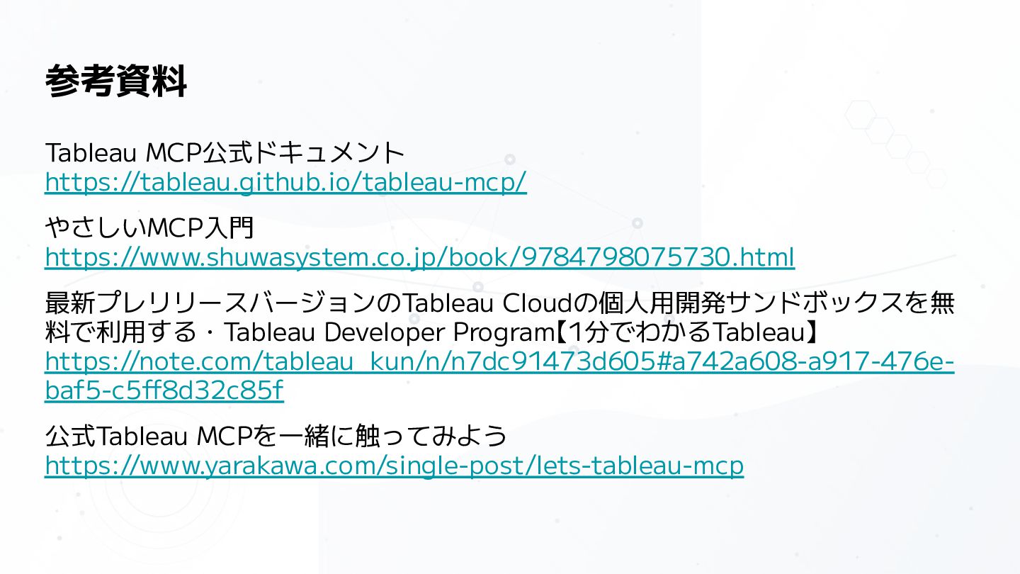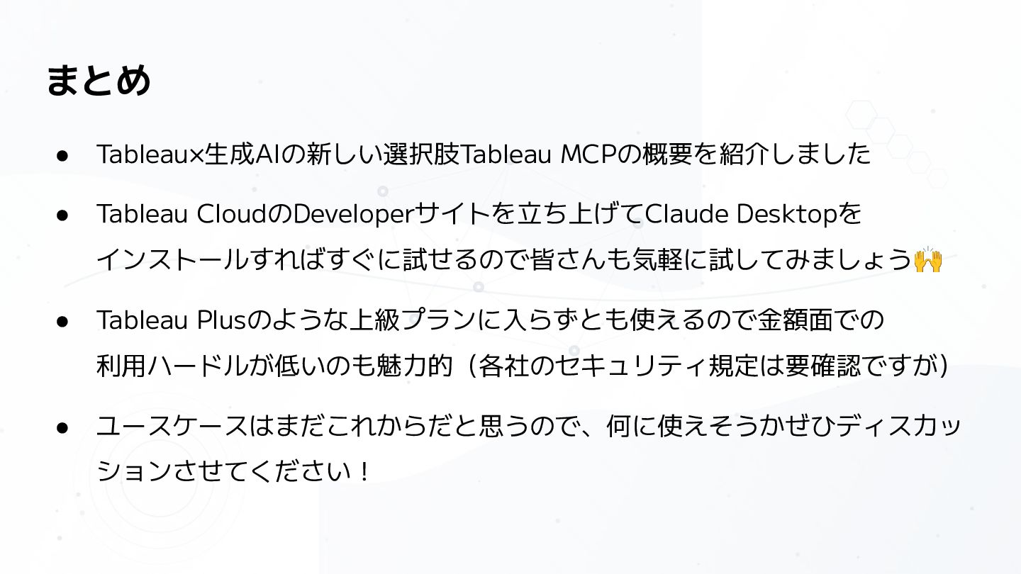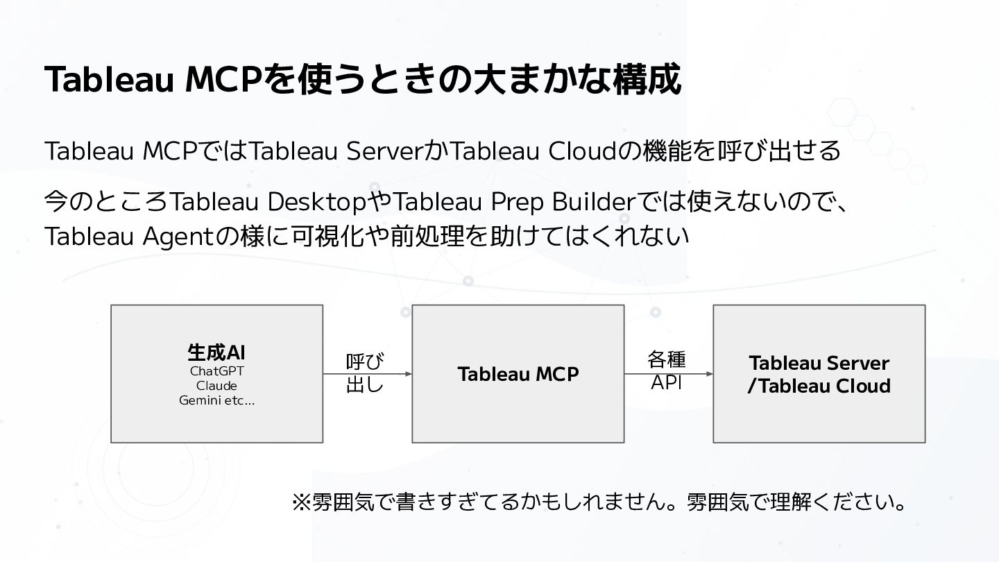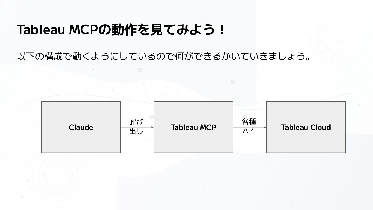 ワークブックやデータソース を検索したり、ワークブック の情報(メタデータ、画像)を 取得できる。 Tableau Pulseに関する機 能。メトリックの一覧を取っ てきてその状況を教えてくれ る。 List Datasources Get Datasource Metadata Query Datasource List Workbooks Get Workbook List Views Get View Image Get View Data List All Metric Defenitions List Metric Defenitions List Metrics for Defenition List Metrics List Metric Subscriptions Generate insight Bundle 概 要 ツ | ル 群