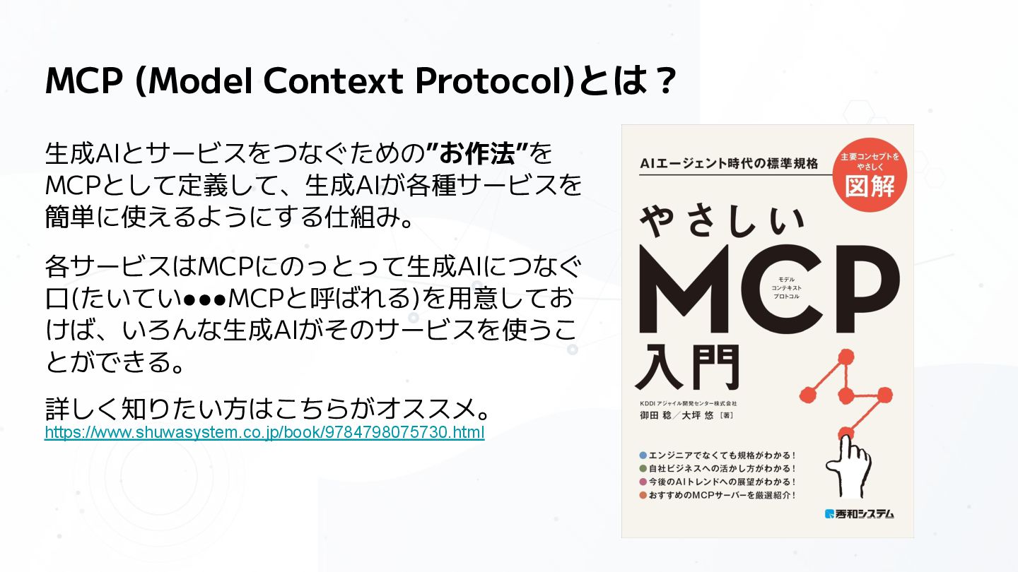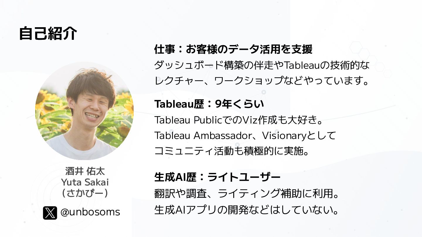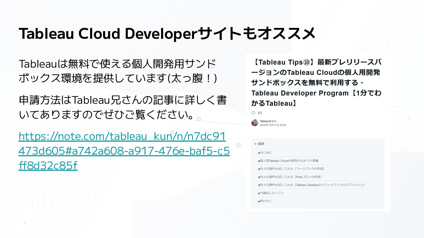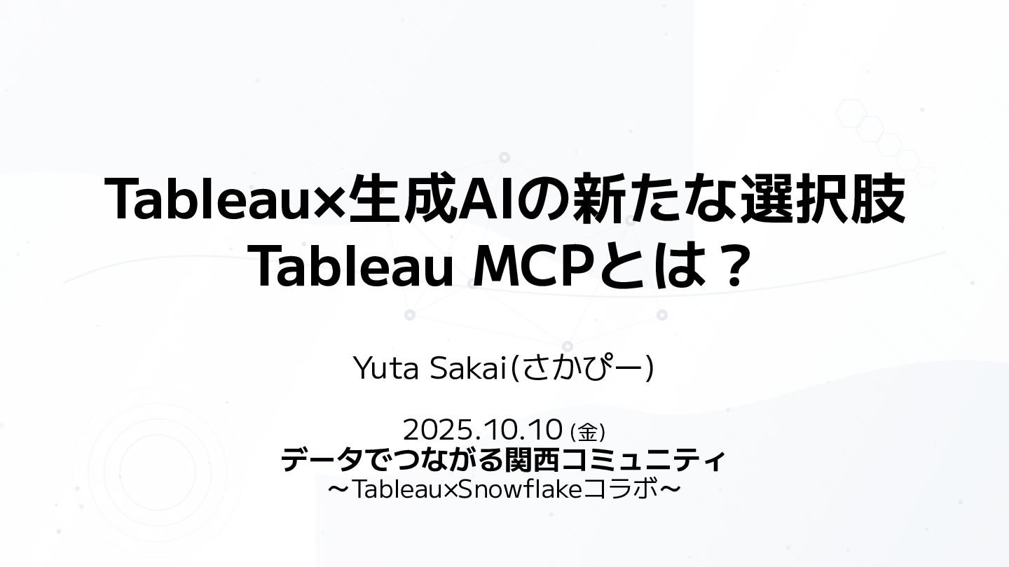 ワークブックやデータソース を検索したり、ワークブック の情報(メタデータ、画像)を 取得できる。 Tableau Pulseに関する機 能。メトリックの一覧を取っ てきてその状況を教えてくれ る。 List Datasources Get Datasource Metadata Query Datasource List Workbooks Get Workbook List Views Get View Image Get View Data List All Metric Defenitions List Metric Defenitions List Metrics for Defenition List Metrics List Metric Subscriptions Generate insight Bundle 概 要 ツ | ル 群