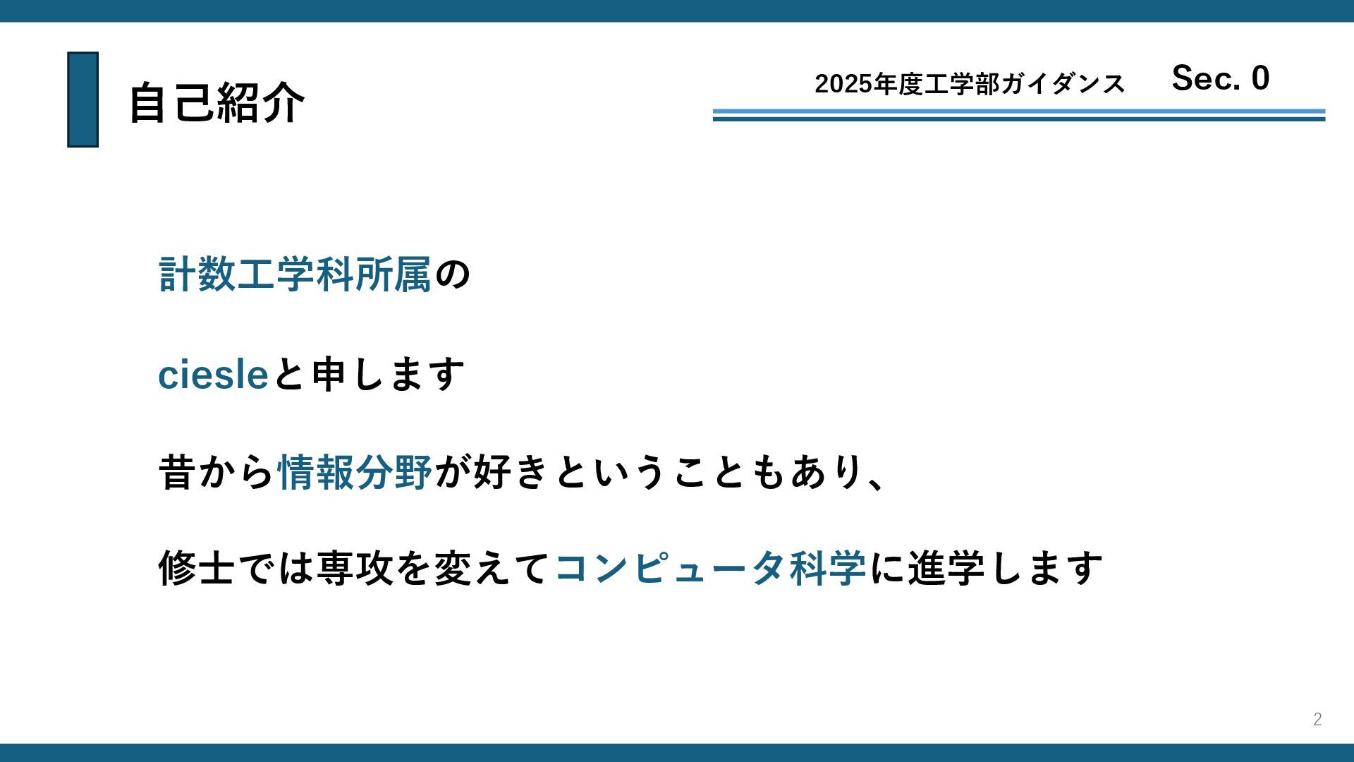 自己紹介 2025年度工学部ガイダンス Sec. 0 計数工学科所属の ciesleと申します 修士では専攻を変えてコンピュータ科学に進学します 昔から情報分野が好きということもあり、 2