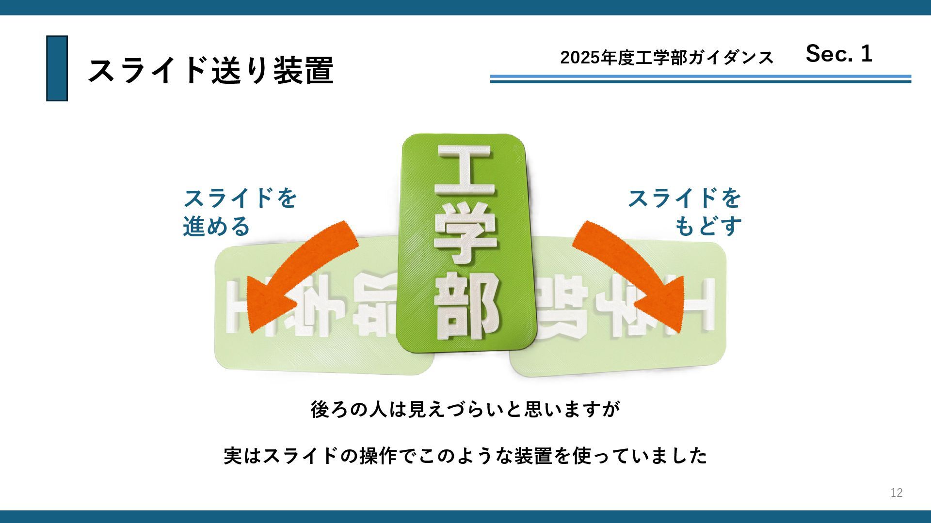 スライド送り装置 2025年度工学部ガイダンス Sec. 1 スライドを 進める スライドを もどす 後ろの人は見えづらいと思いますが 実はスライドの操作でこのような装置を使っていました