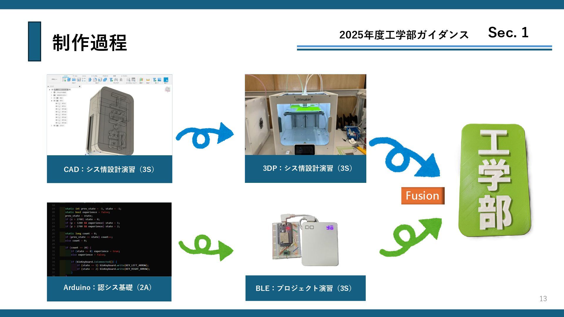 制作過程 2025年度工学部ガイダンス Sec. 1 Fusion CAD:シス情設計演習(3S) Arduino:認シス基礎(2A) BLE:プロジェクト演習(3S) 3DP:シス情設計演習(3S) 13