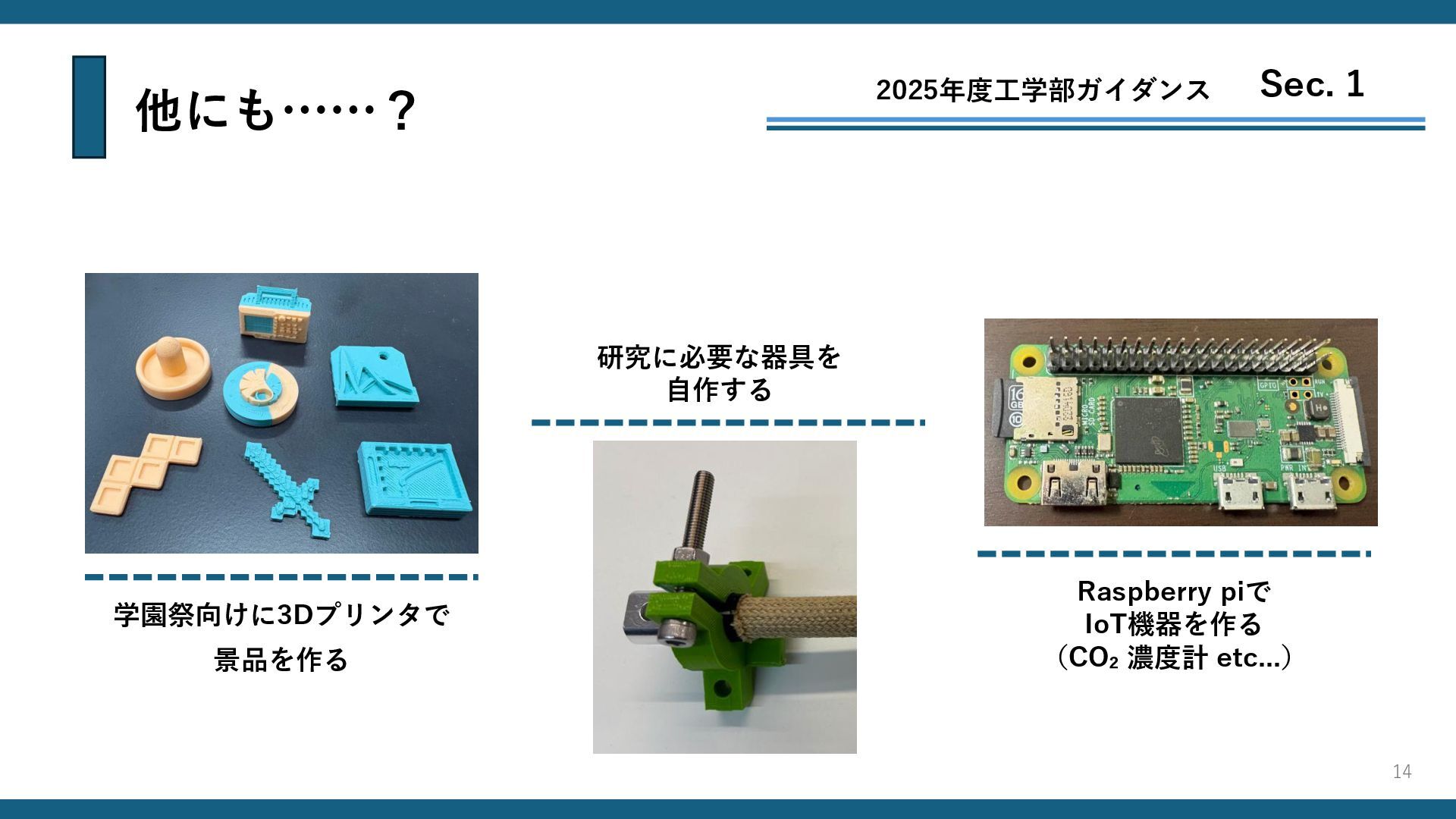 他にも……? 2025年度工学部ガイダンス Sec. 1 学園祭向けに3Dプリンタで 景品を作る Raspberry piで IoT機器を作る (CO₂