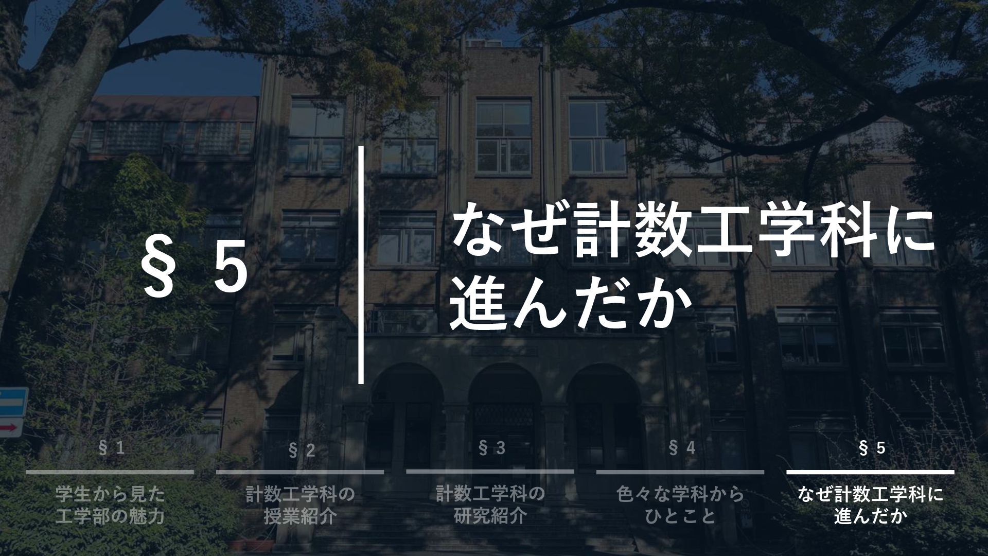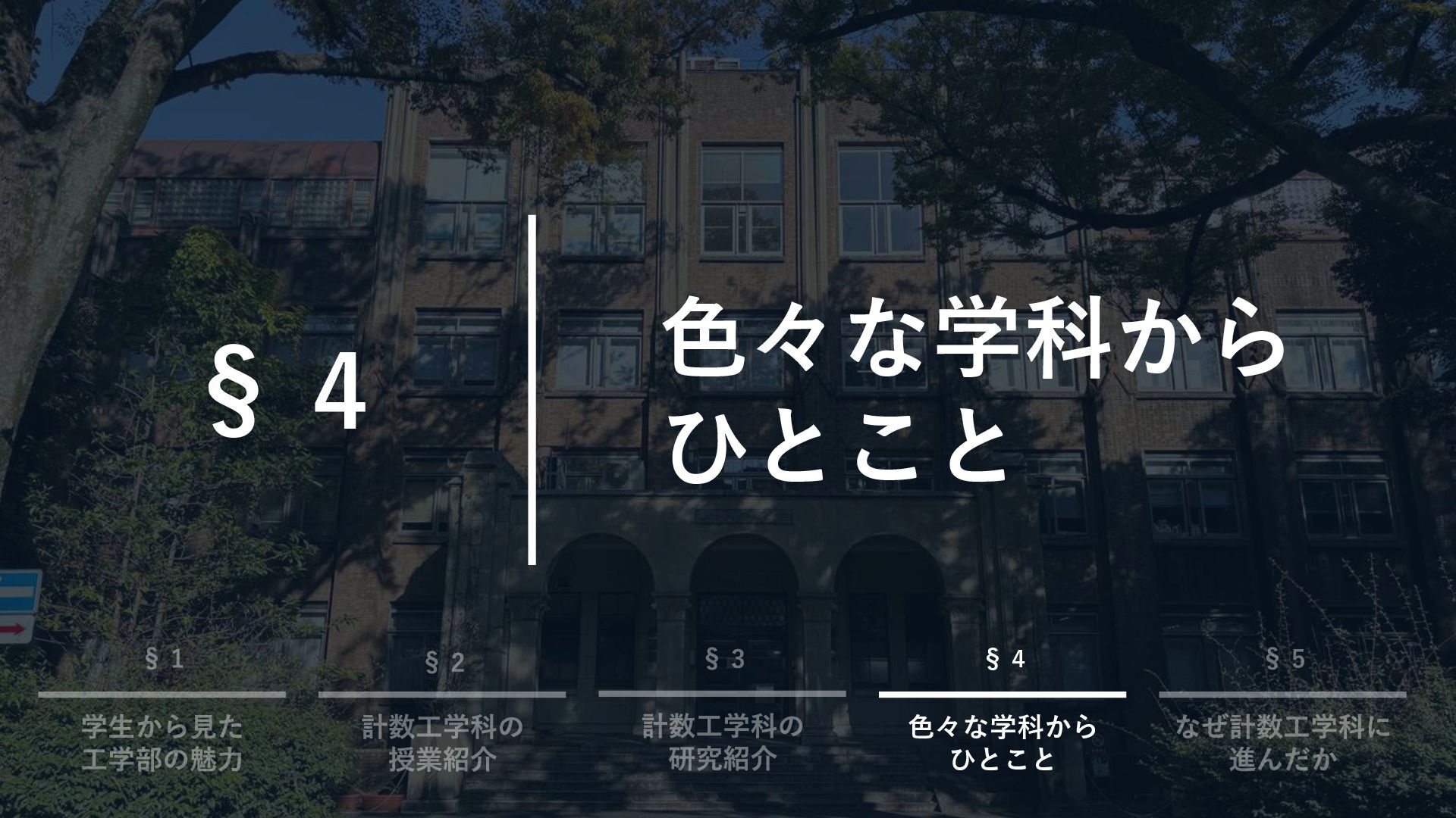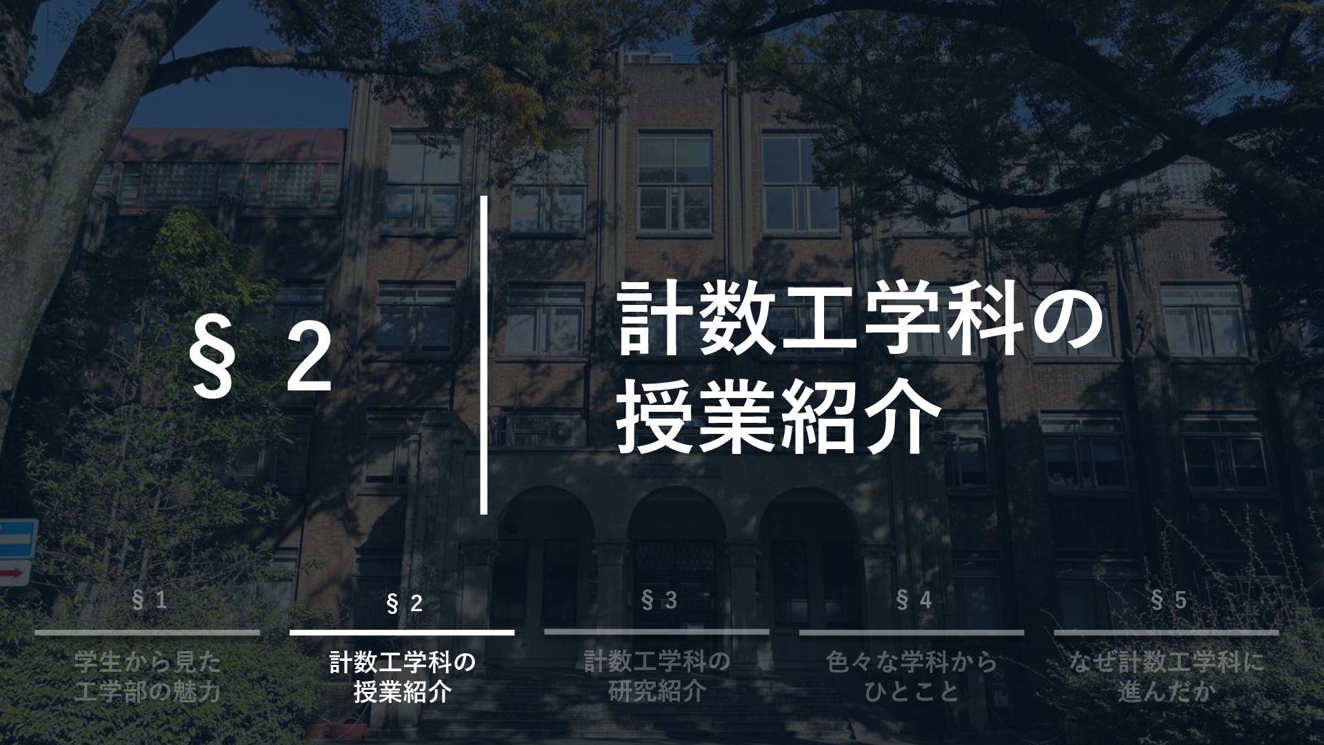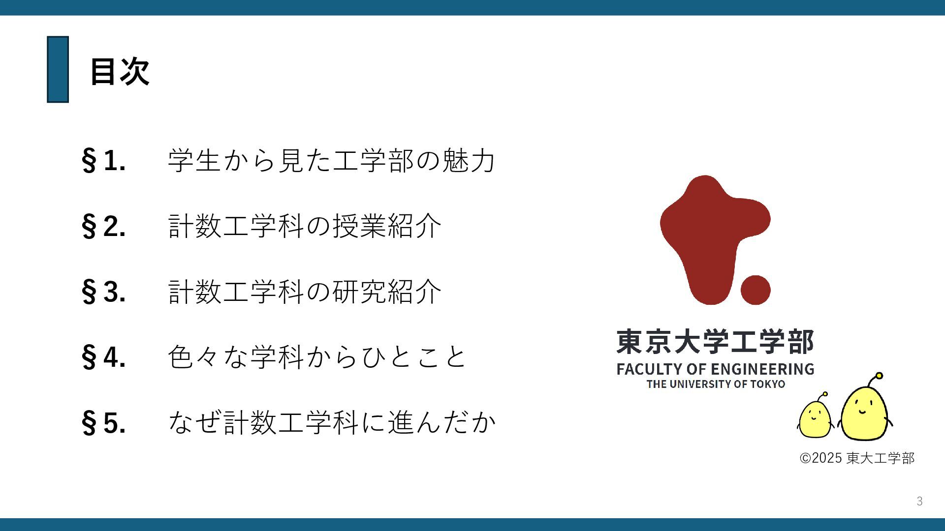 目次 §1. §2. §3. §4. 学生から見た工学部の魅力 計数工学科の授業紹介 計数工学科の研究紹介 色々な学科からひとこと §5.