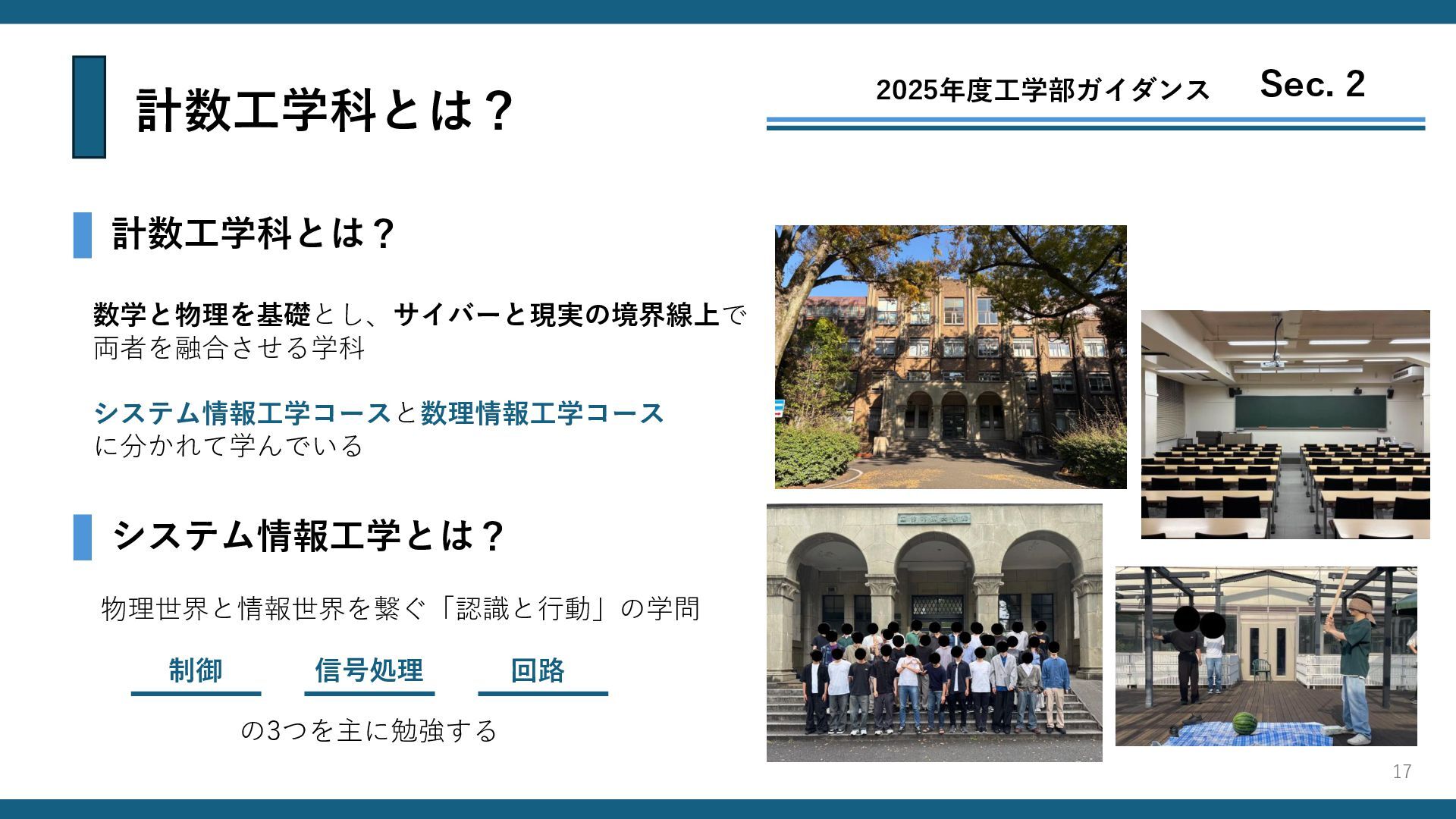 計数工学科とは? 2025年度工学部ガイダンス Sec. 2 計数工学科とは? システム情報工学とは? 数学と物理を基礎とし、サイバーと現実の境界線上で 両者を融合させる学科 システム情報工学コースと数理情報工学コース に分かれて学んでいる