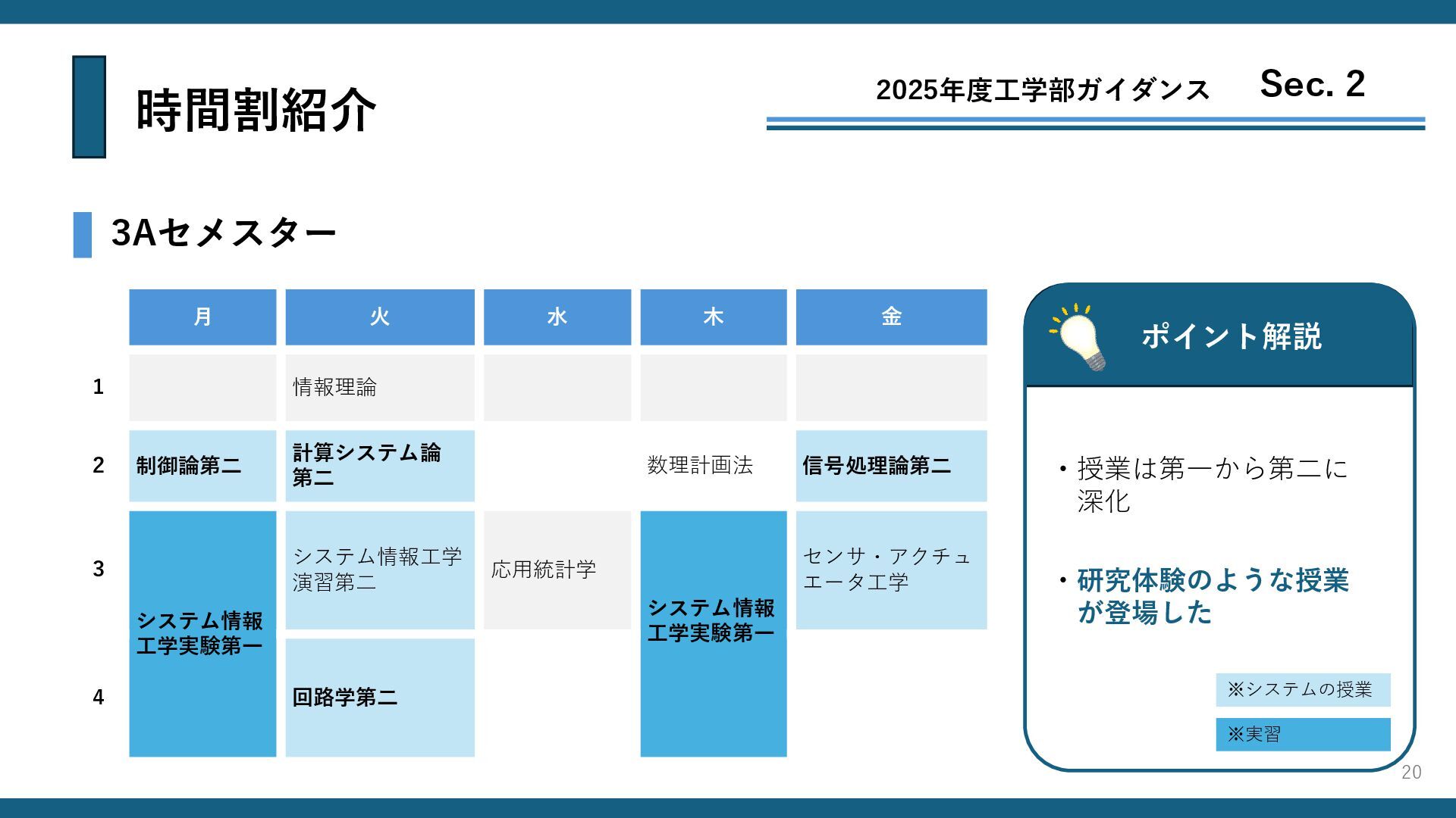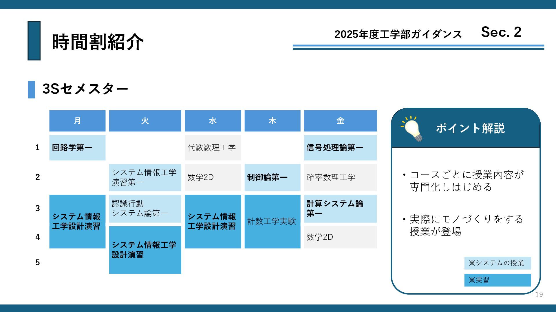 システム情報工学 演習第一 数学2D 制御論第一 確率数理工学 3 システム情報 工学設計演習 認識行動 システム論第一 システム情報 工学設計演習 計数工学実験 計算システム論 第一 4 システム情報工学 設計演習 数学2D 5 19 時間割紹介 3Sセメスター ポイント解説 ・実際にモノづくりをする 授業が登場 2025年度工学部ガイダンス Sec. 2 ・コースごとに授業内容が 専門化しはじめる ※実習 ※システムの授業