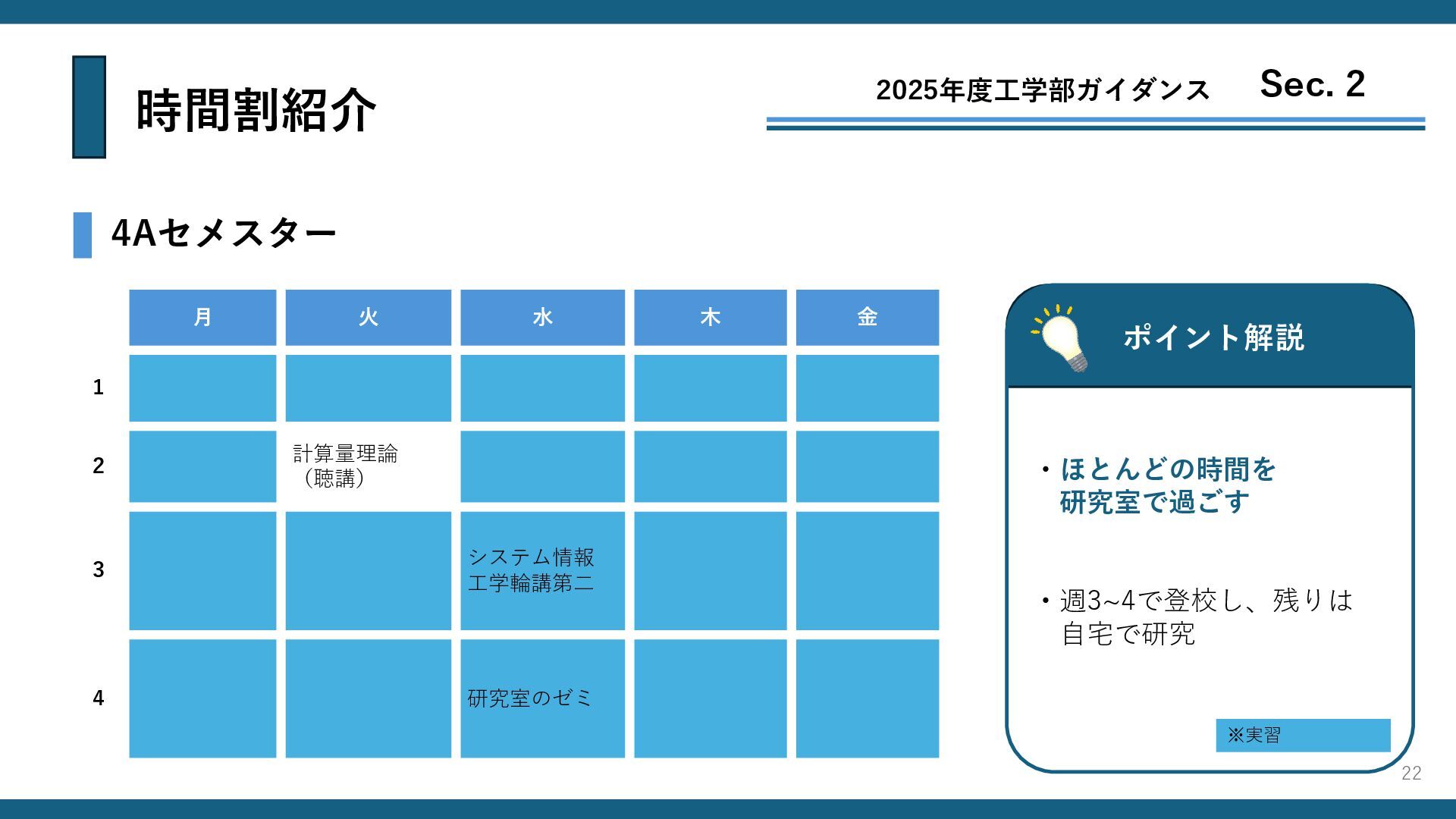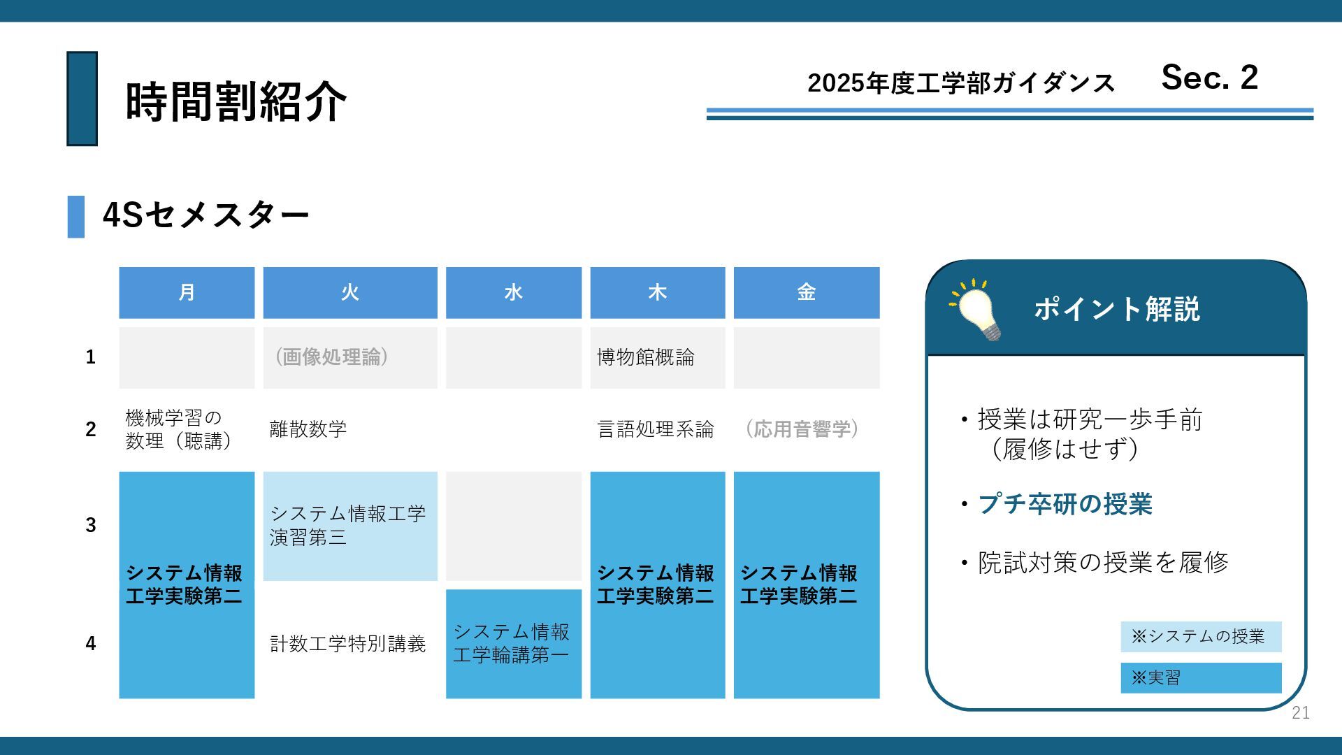時間割紹介 4Sセメスター ポイント解説 ・授業は研究一歩手前 (履修はせず) 2025年度工学部ガイダンス Sec. 2 月 火