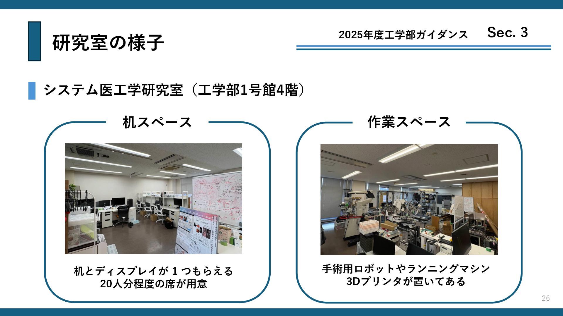 研究室の様子 2025年度工学部ガイダンス Sec. 3 システム医工学研究室(工学部1号館4階) 机スペース 作業スペース 机とディスプレイが 1 つもらえる