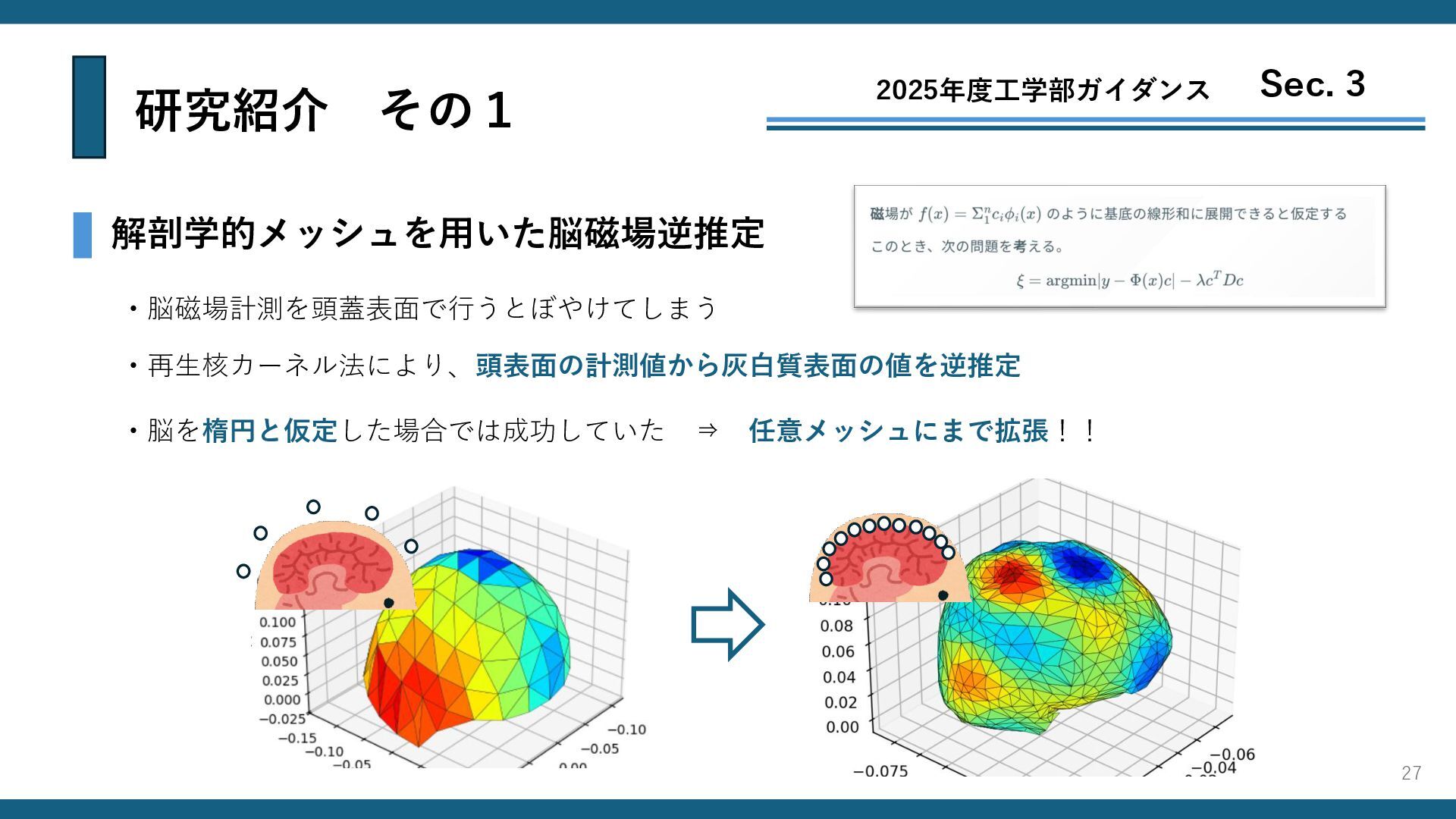 研究紹介 その1 2025年度工学部ガイダンス Sec. 3 解剖学的メッシュを用いた脳磁場逆推定 ・脳磁場計測を頭蓋表面で行うとぼやけてしまう ・再生核カーネル法により、頭表面の計測値から灰白質表面の値を逆推定 ・脳を楕円と仮定した場合では成功していた ⇒