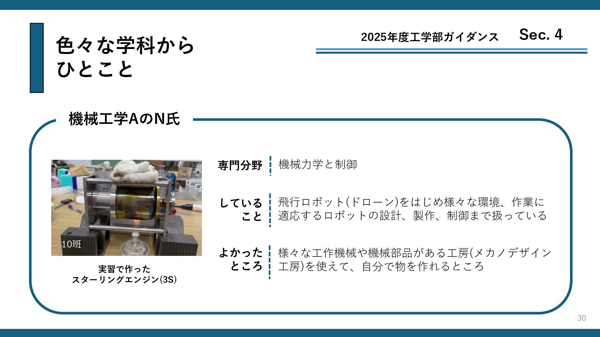 色々な学科から ひとこと 2025年度工学部ガイダンス Sec. 4 機械工学AのN氏 機械力学と制御 様々な工作機械や機械部品がある工房(メカノデザイン 工房)を使えて、自分で物を作れるところ 飛行ロボット(ドローン)をはじめ様々な環境、作業に