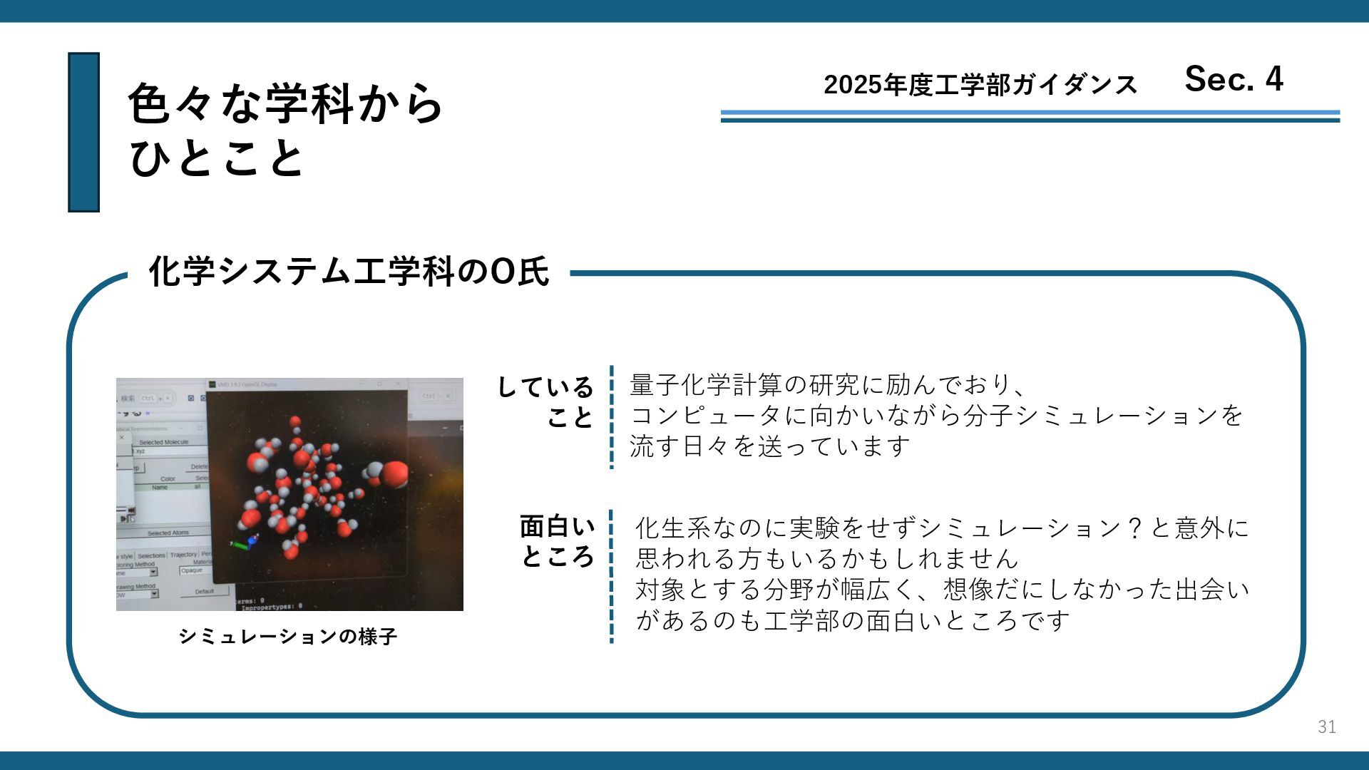 色々な学科から ひとこと 2025年度工学部ガイダンス Sec. 4 化学システム工学科のO氏 化生系なのに実験をせずシミュレーション?と意外に 思われる方もいるかもしれません 対象とする分野が幅広く、想像だにしなかった出会い があるのも工学部の面白いところです