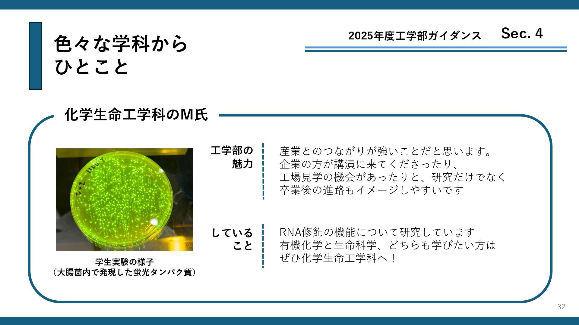 RNA修飾の機能について研究しています 有機化学と生命科学、どちらも学びたい方は ぜひ化学生命工学科へ! している こと 工学部の 魅力 学生実験の様子 (大腸菌内で発現した蛍光タンパク質) 32