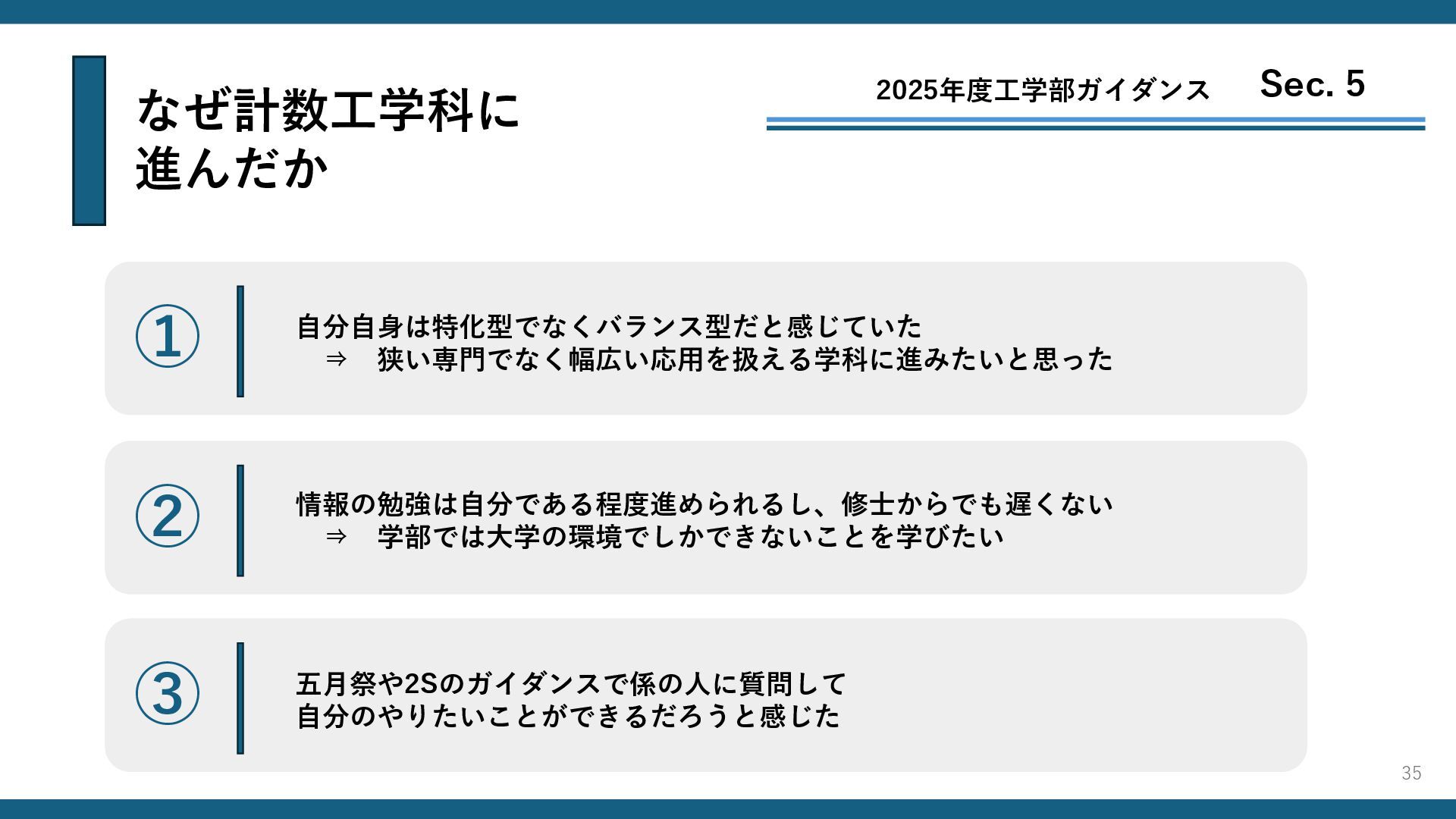 なぜ計数工学科に 進んだか 2025年度工学部ガイダンス Sec. 5 ① 自分自身は特化型でなくバランス型だと感じていた ⇒ 狭い専門でなく幅広い応用を扱える学科に進みたいと思った ②