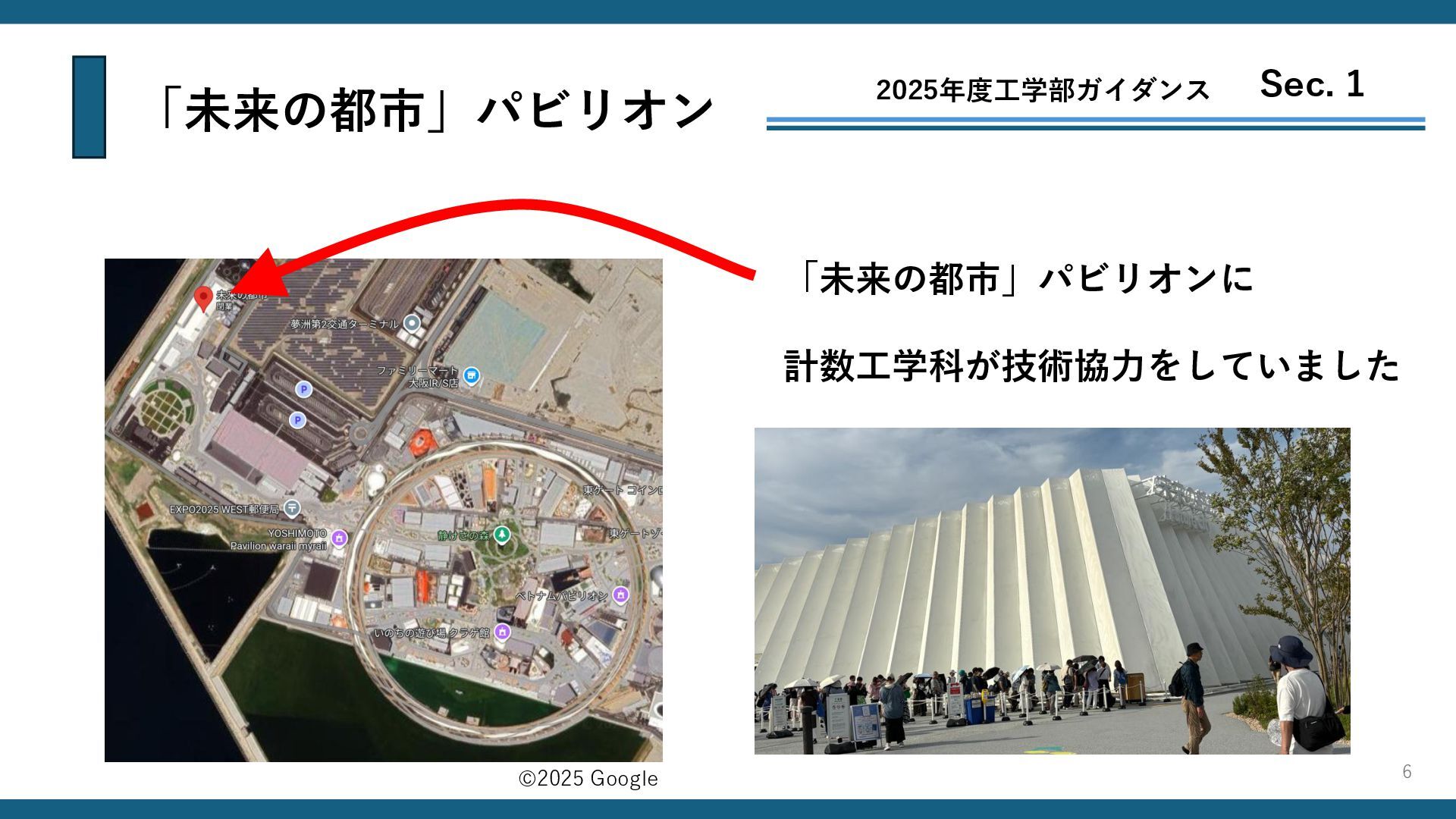 「未来の都市」パビリオン 2025年度工学部ガイダンス Sec. 1 「未来の都市」パビリオンに 計数工学科が技術協力をしていました 6 ©2025 Google