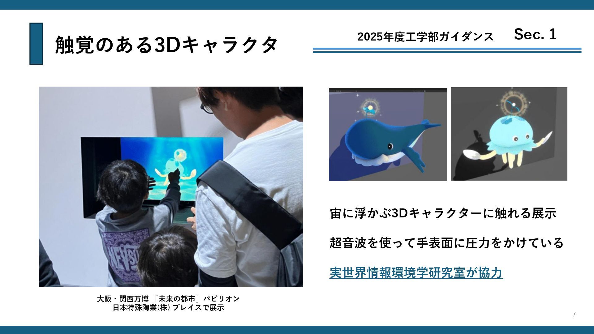 触覚のある3Dキャラクタ 2025年度工学部ガイダンス Sec. 1 宙に浮かぶ3Dキャラクターに触れる展示 超音波を使って手表面に圧力をかけている 実世界情報環境学研究室が協力 7 大阪・関西万博 「未来の都市」パビリオン