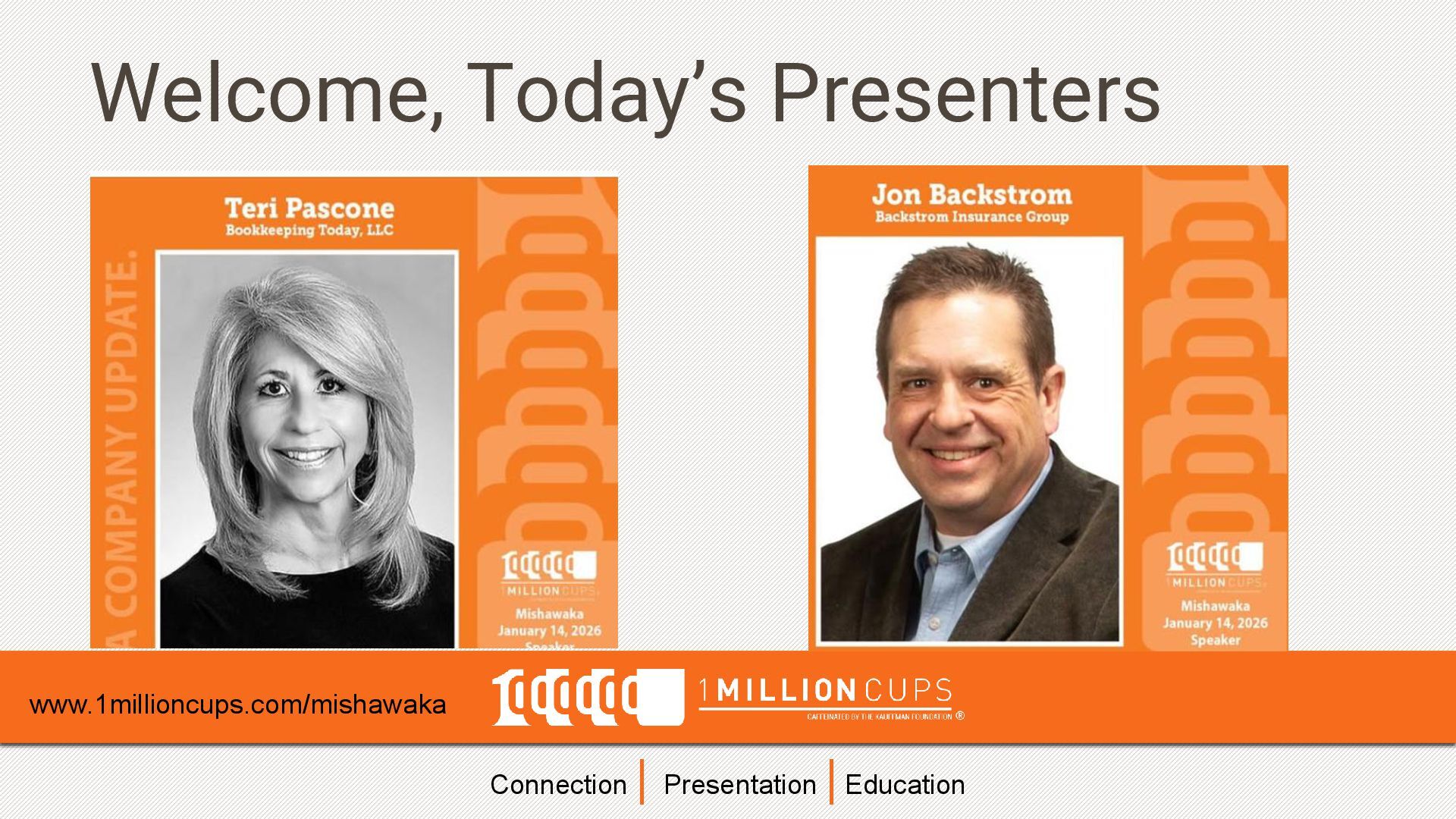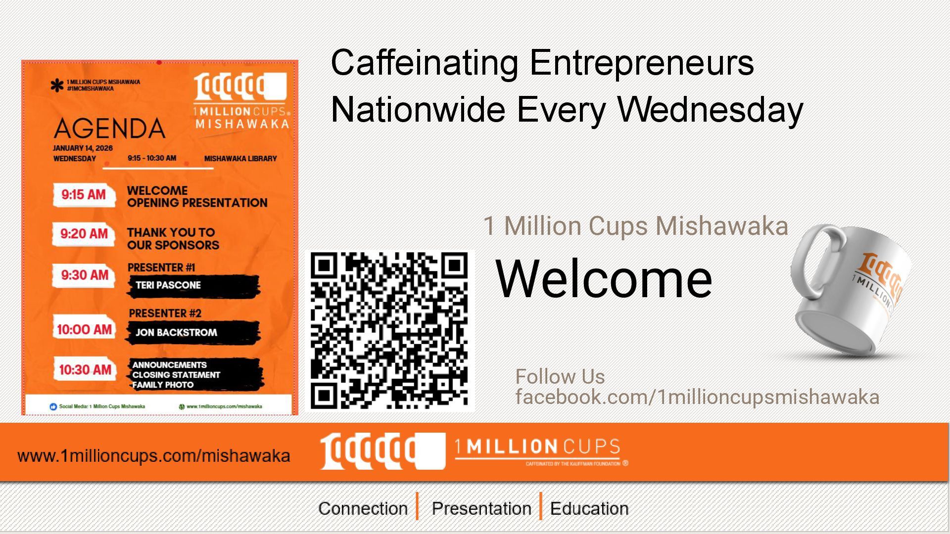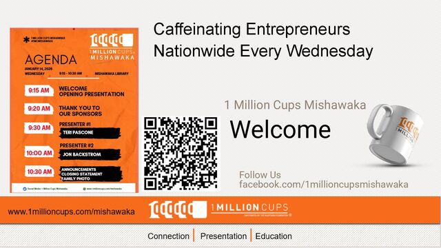presentation | elevator speech Receive feedback from a diverse audience Gain exposure in new markets Support from 1 MC community Need help? We got you – 1MC Coach Register to Present Go to www.1millioncups.com/mishawaka Look for “apply to present” A 1MC Coach will contact you. 1. 2. 3.