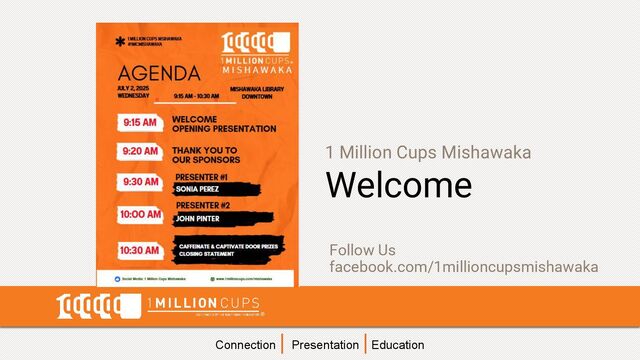 social media channels & create a banner highlighting you as a presenter. Please Submit Your: Photo Bio (short) Register to present go to: www.1millioncups.com/mishawaka “apply to present” 1 2 3 4 5 6 7 8 Connection | Presentation | Education