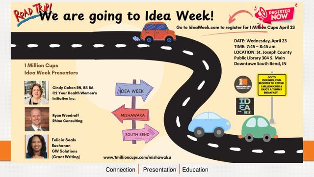 social media channels & create a banner highlighting you as a presenter. Please Submit Your: Photo Bio (short) Register to present go to: www.1millioncups.com/mishawaka “apply to present” 1 2 3 4 5 6 7 8 Connection | Presentation | Education
